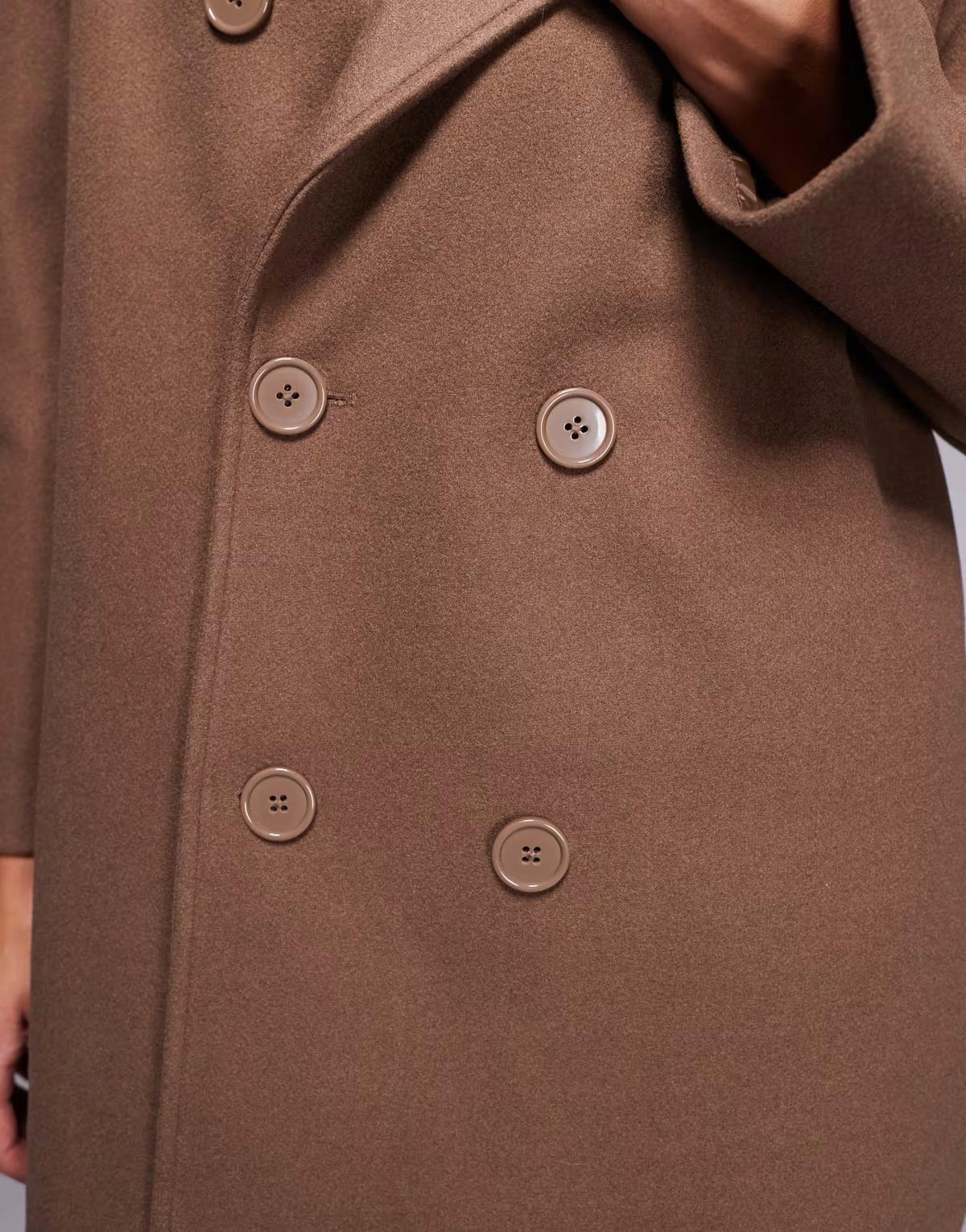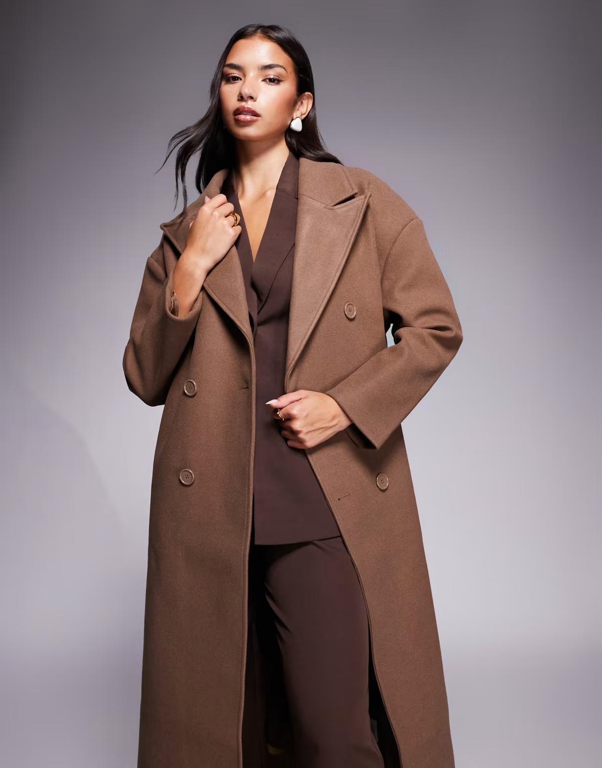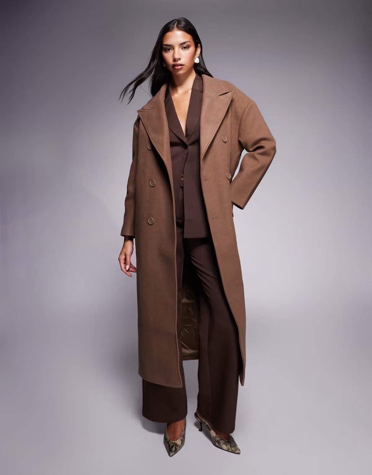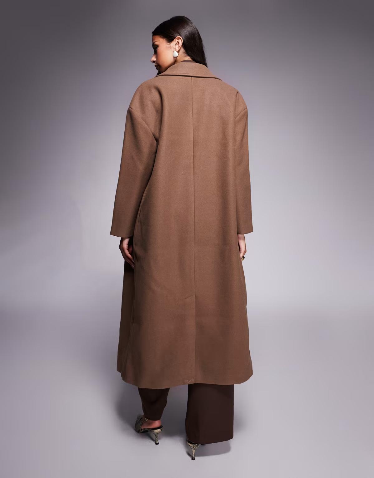 Aria Cove wool look formal double breasted longline maxi coat in brown