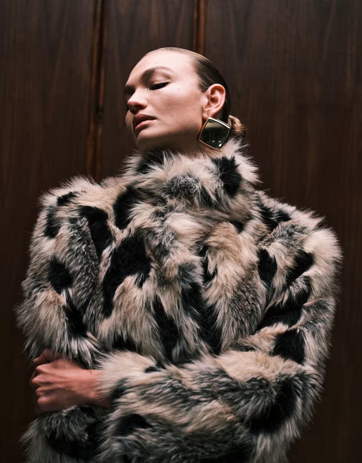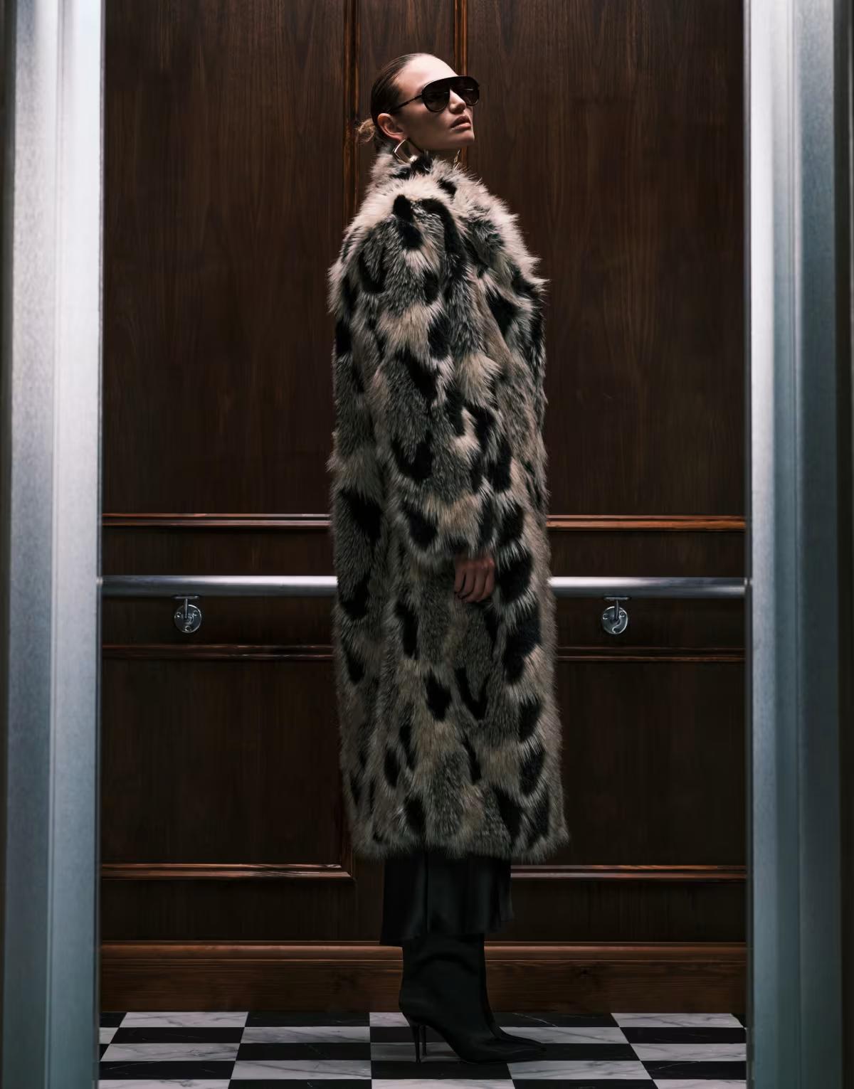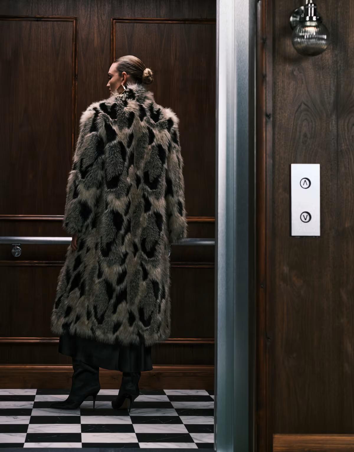 ASOS DESIGN longline patch faux fur coat in oatmeal and black