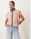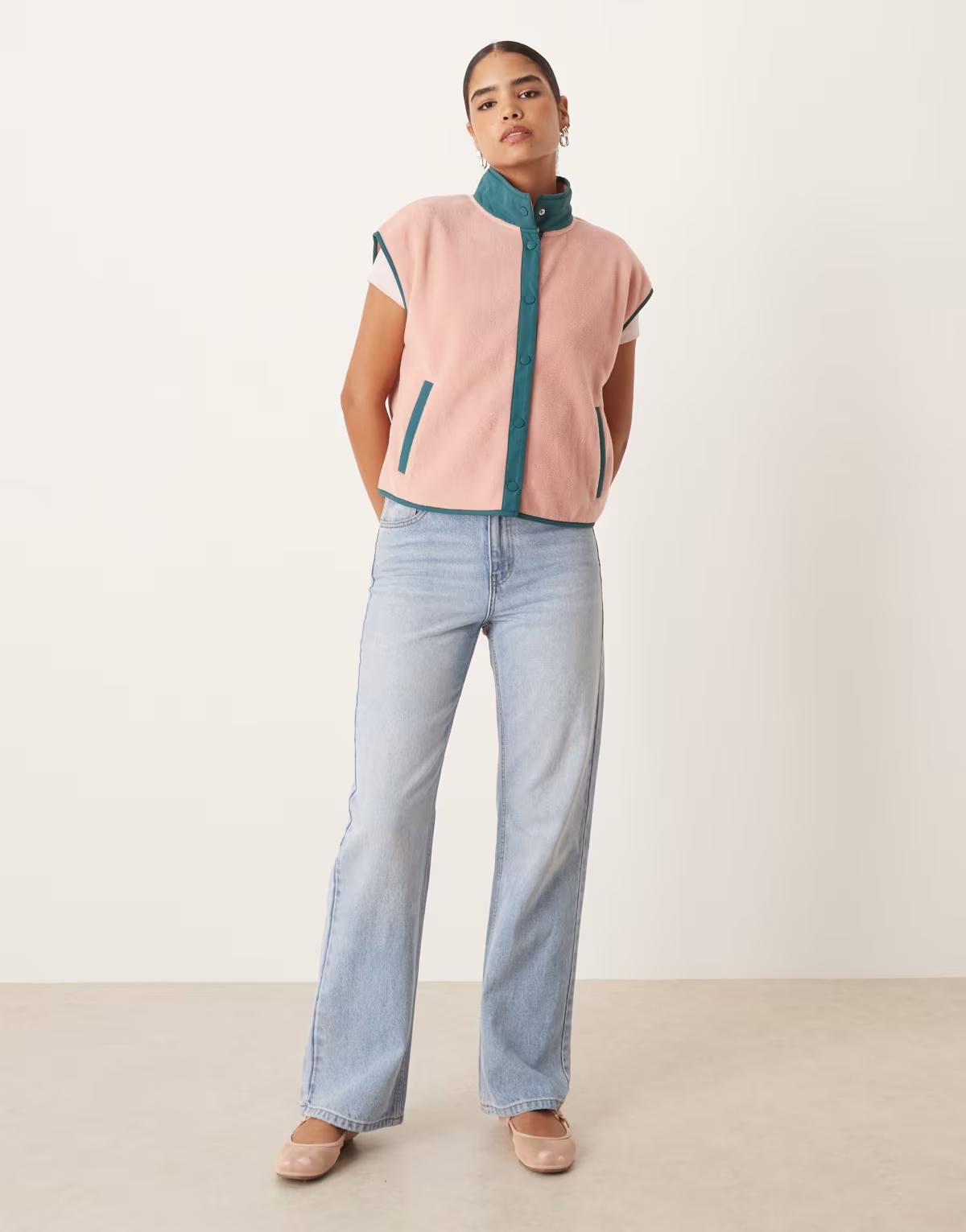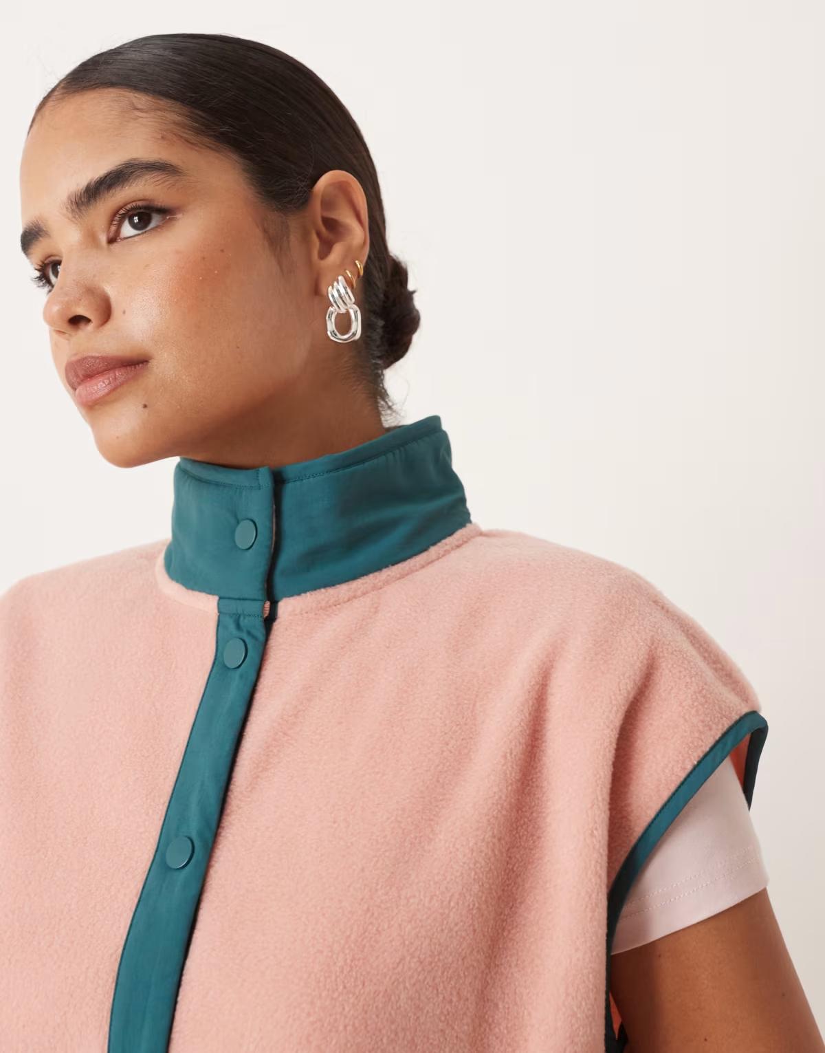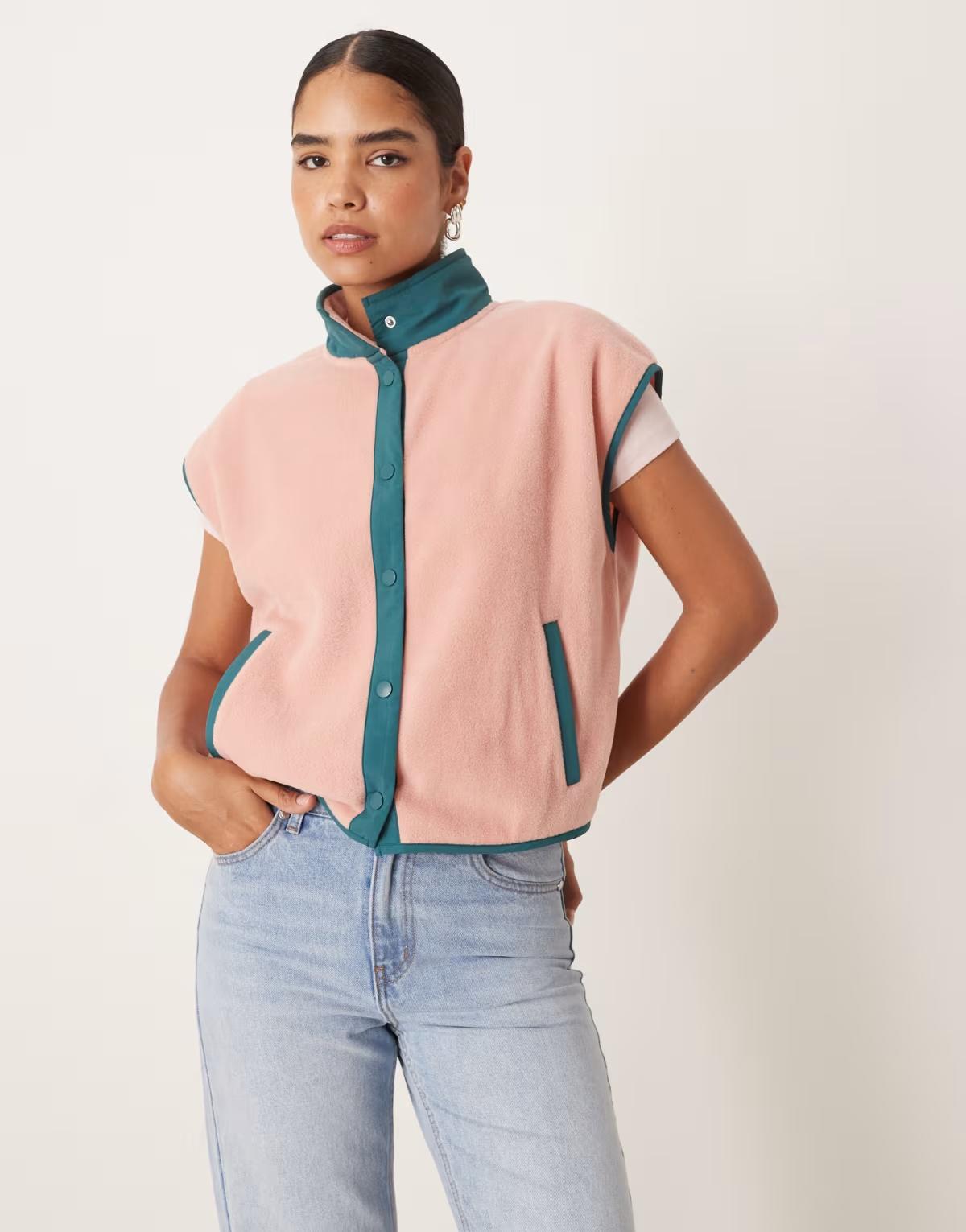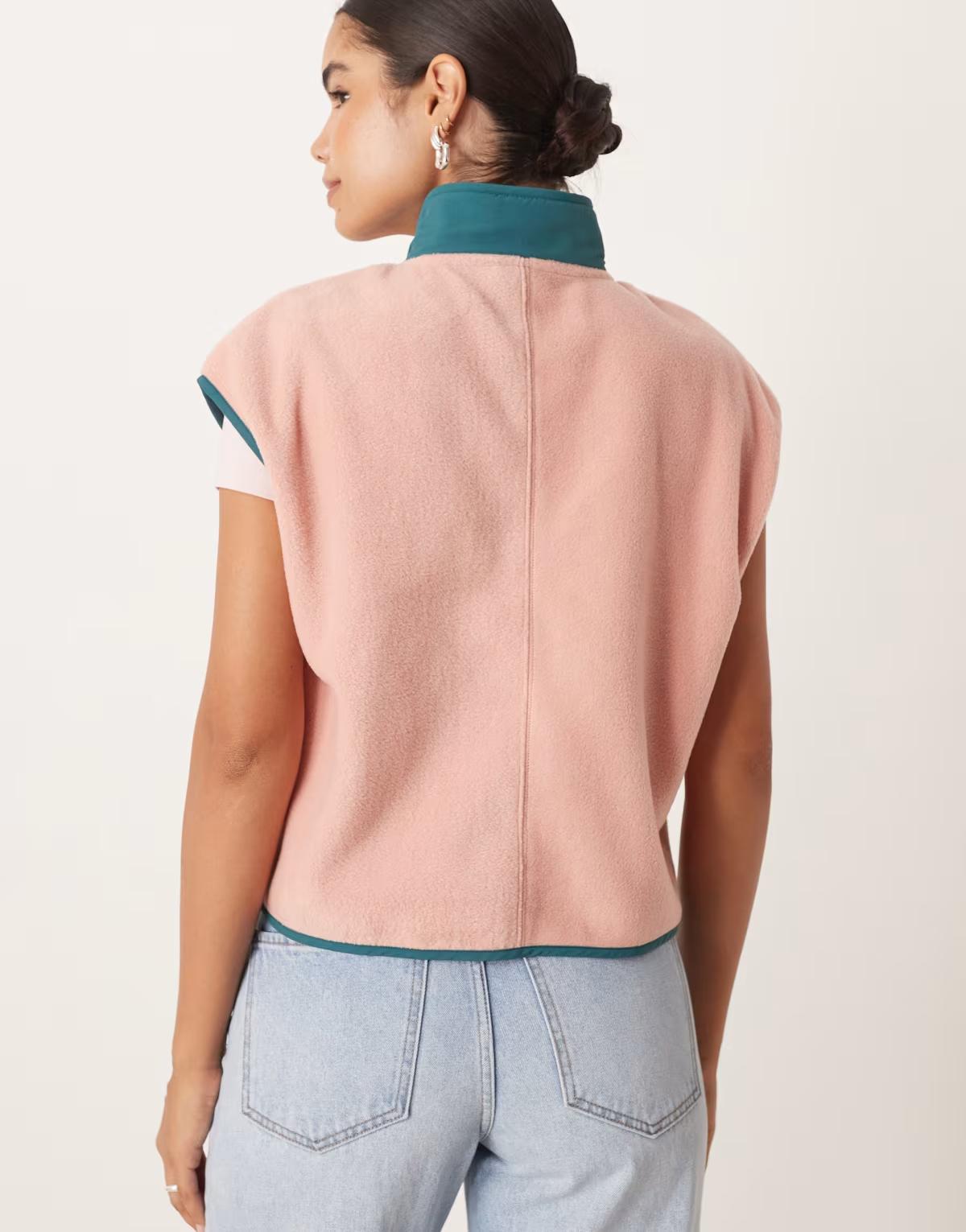 ASOS DESIGN polar fleece gilet in pink with contrast green nylon detail