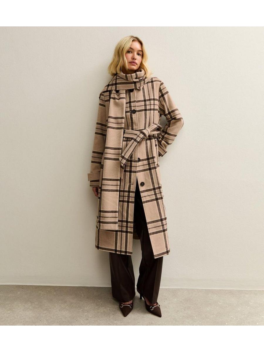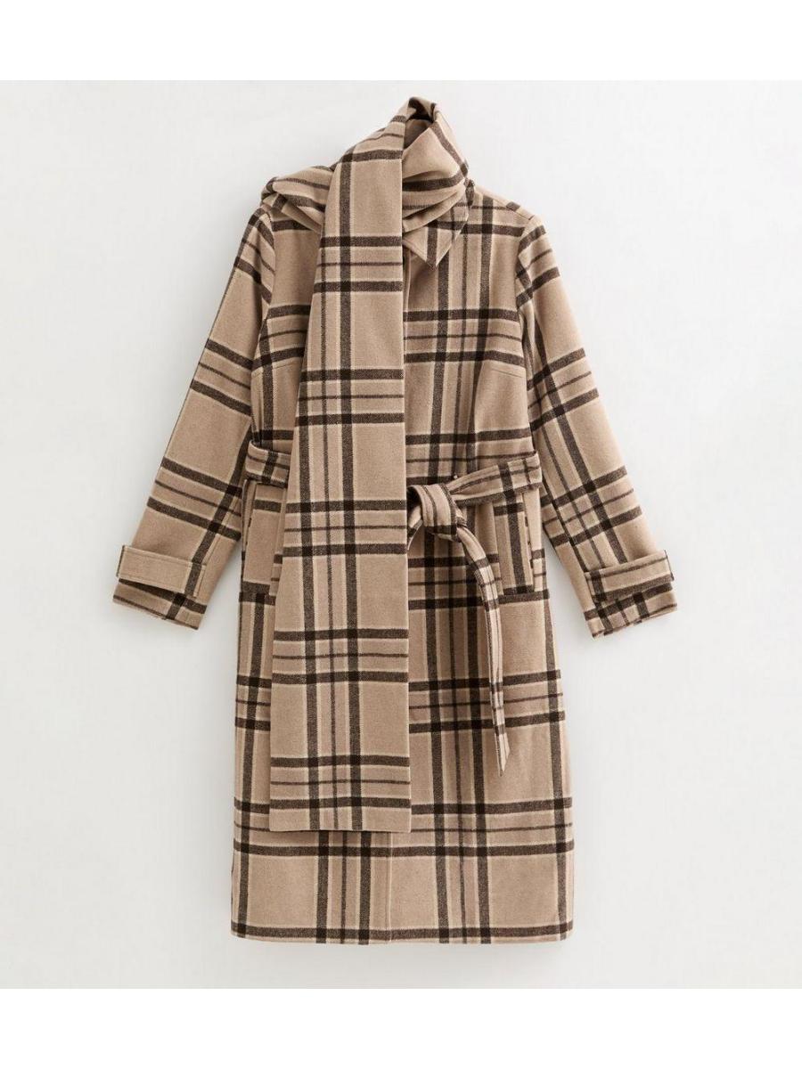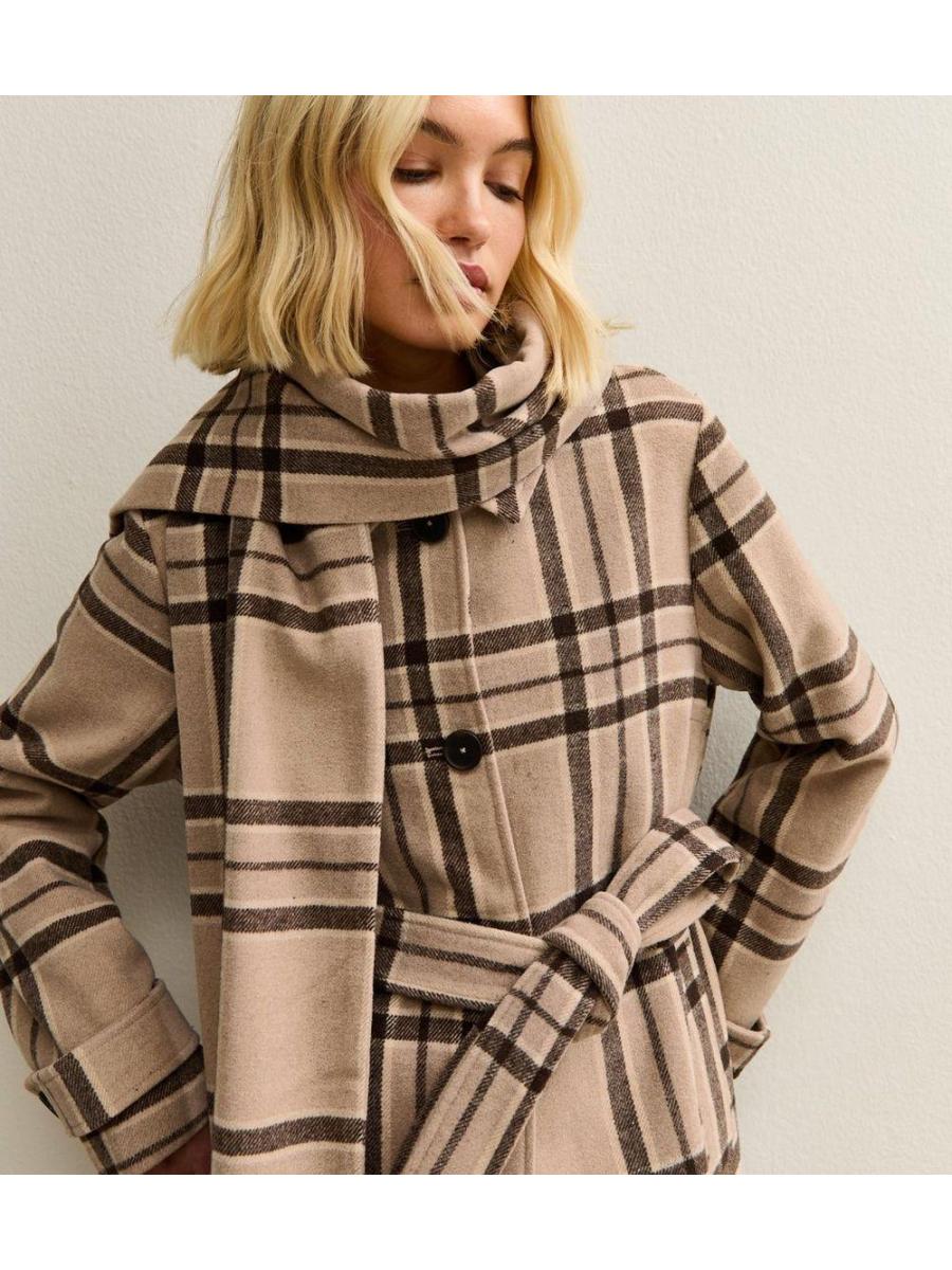 Beige Checked Collared Jacket and Matching Scarf
