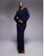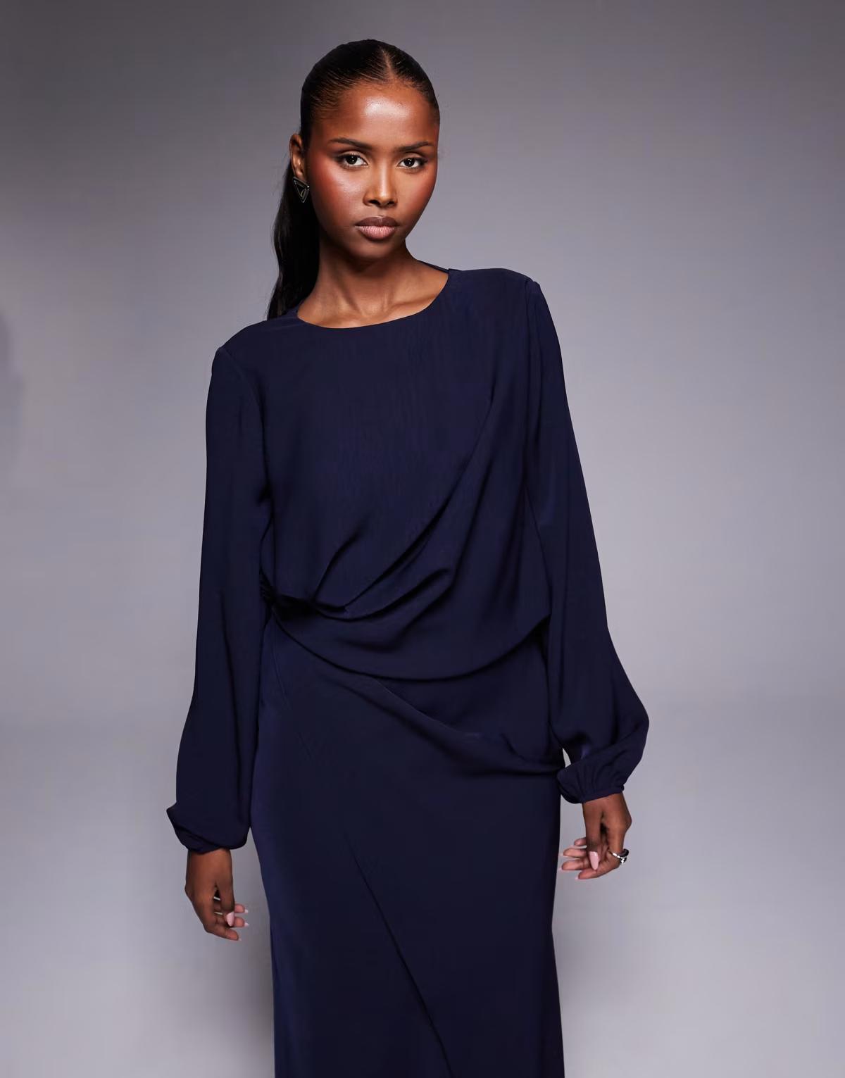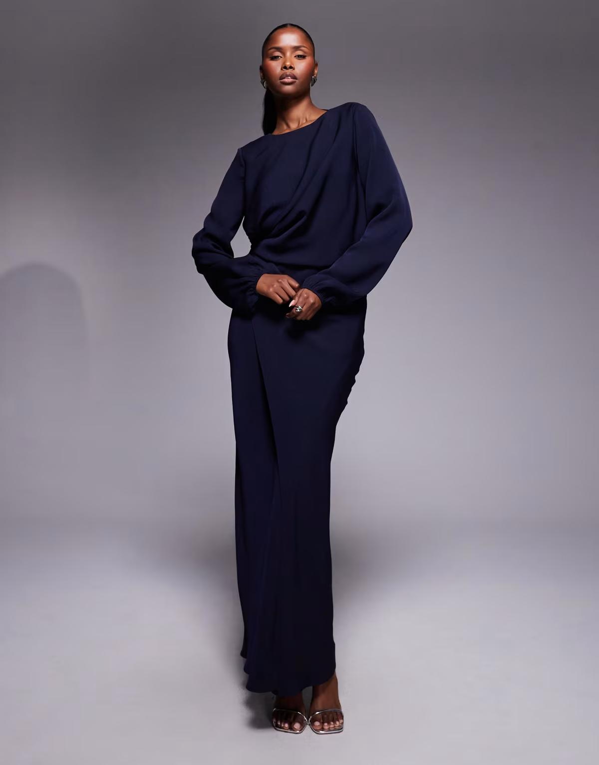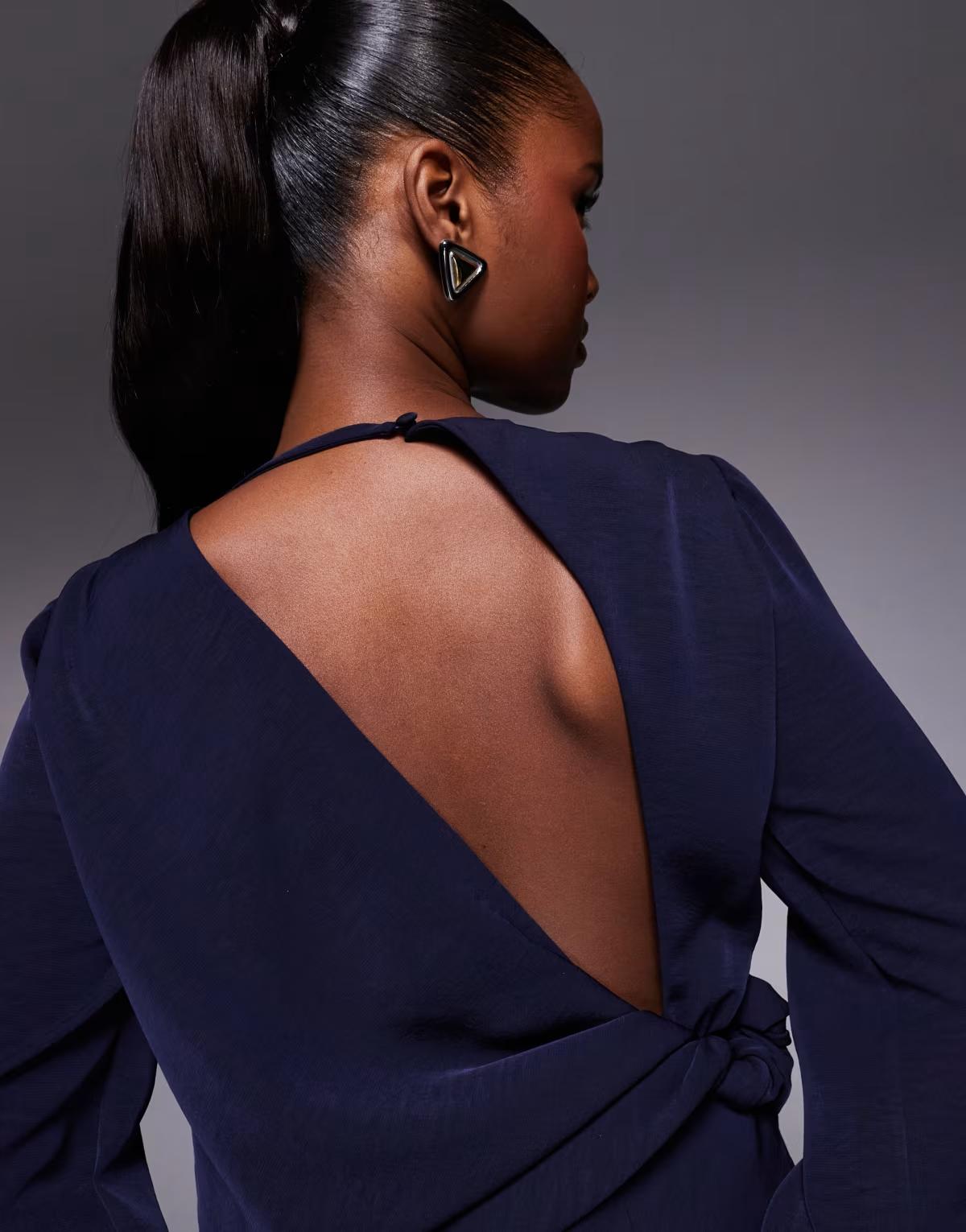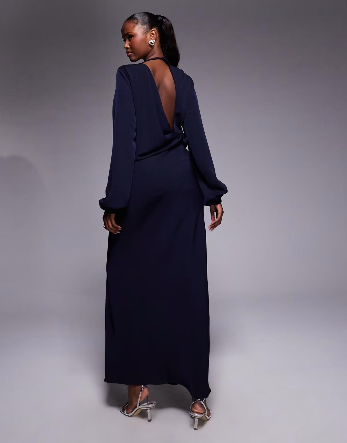 ASOS DESIGN long sleeve twist waist detail maxi dress with open back in navy