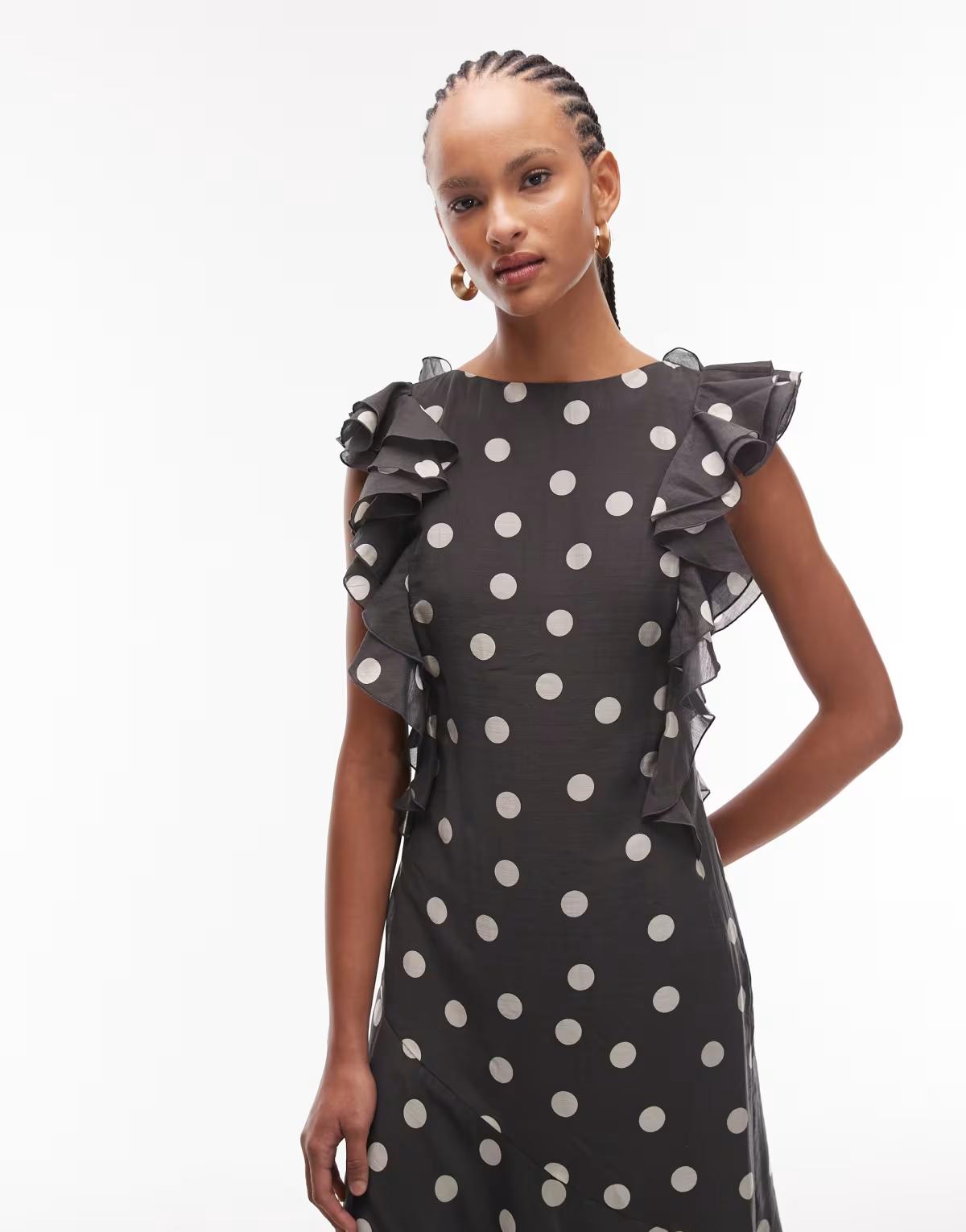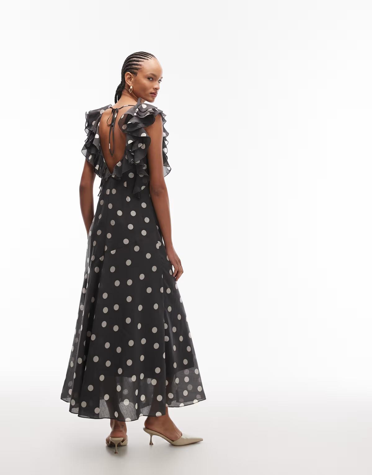 & Other Stories maxi dress with ruffle edging and low back in black dolka dot spot print