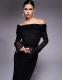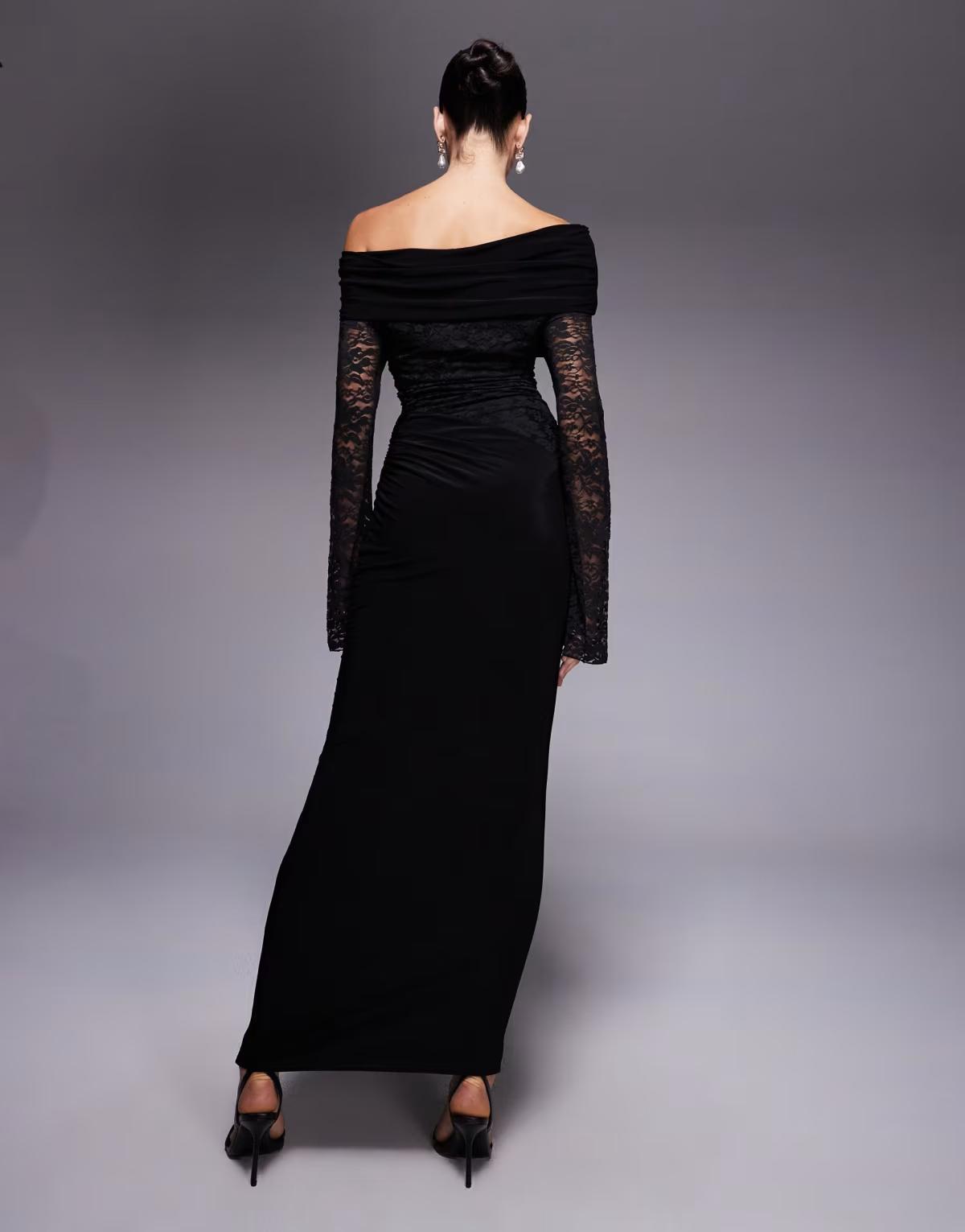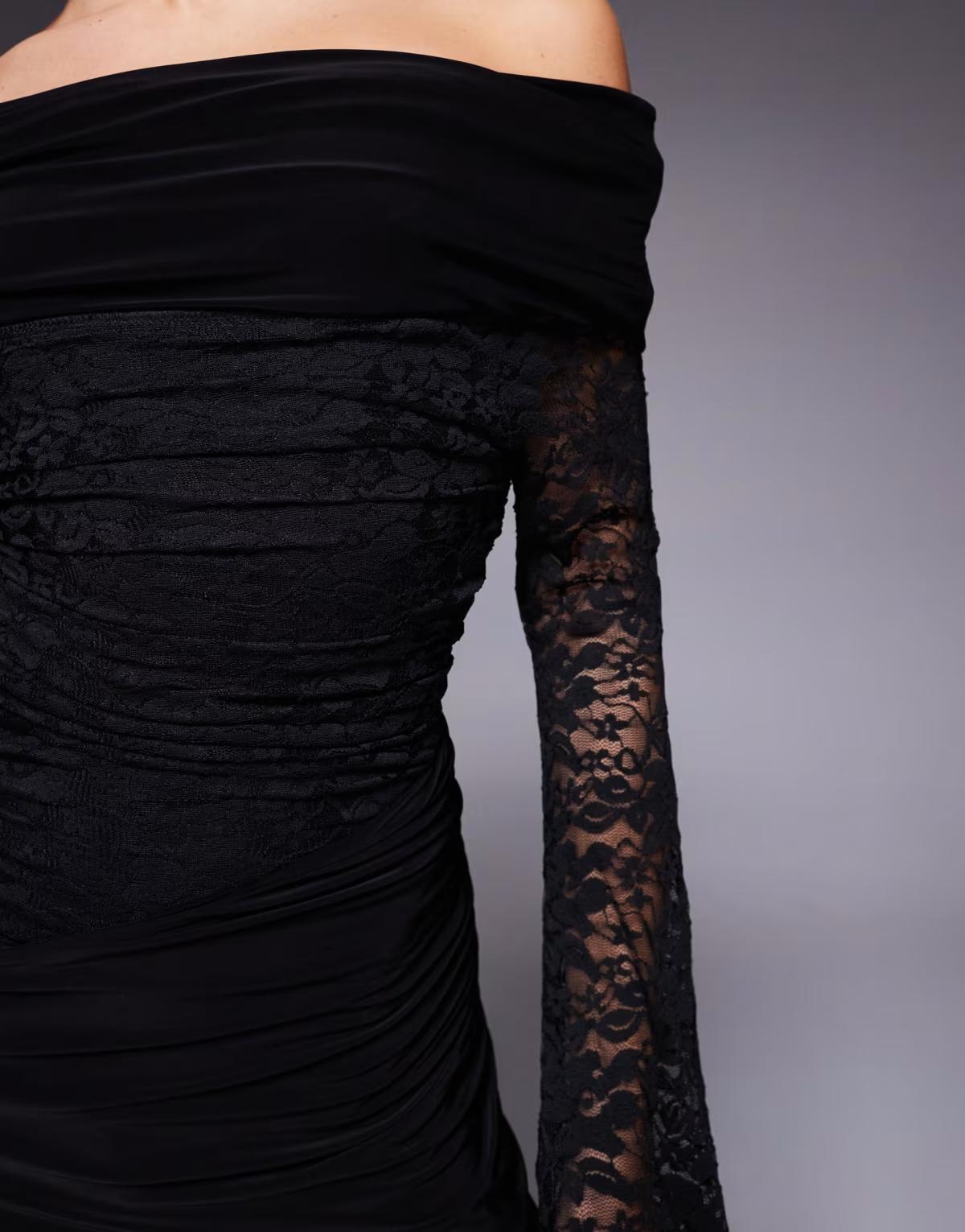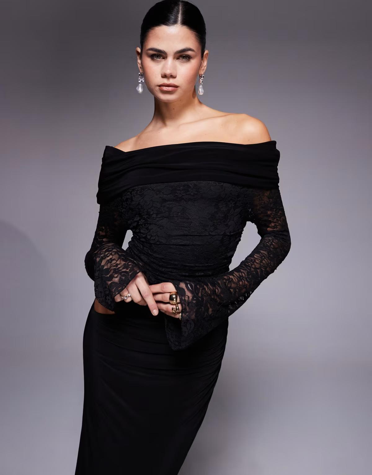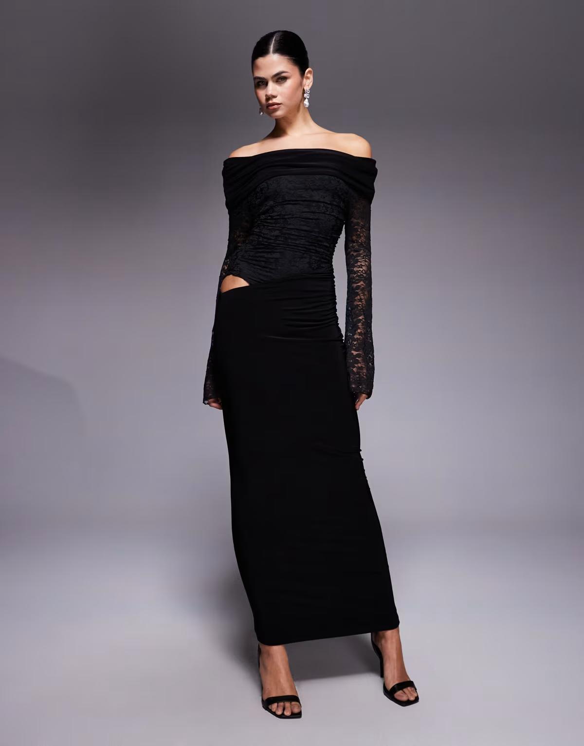 Kaiia exclusive double layered slinky lace bardot maxi dress in black
