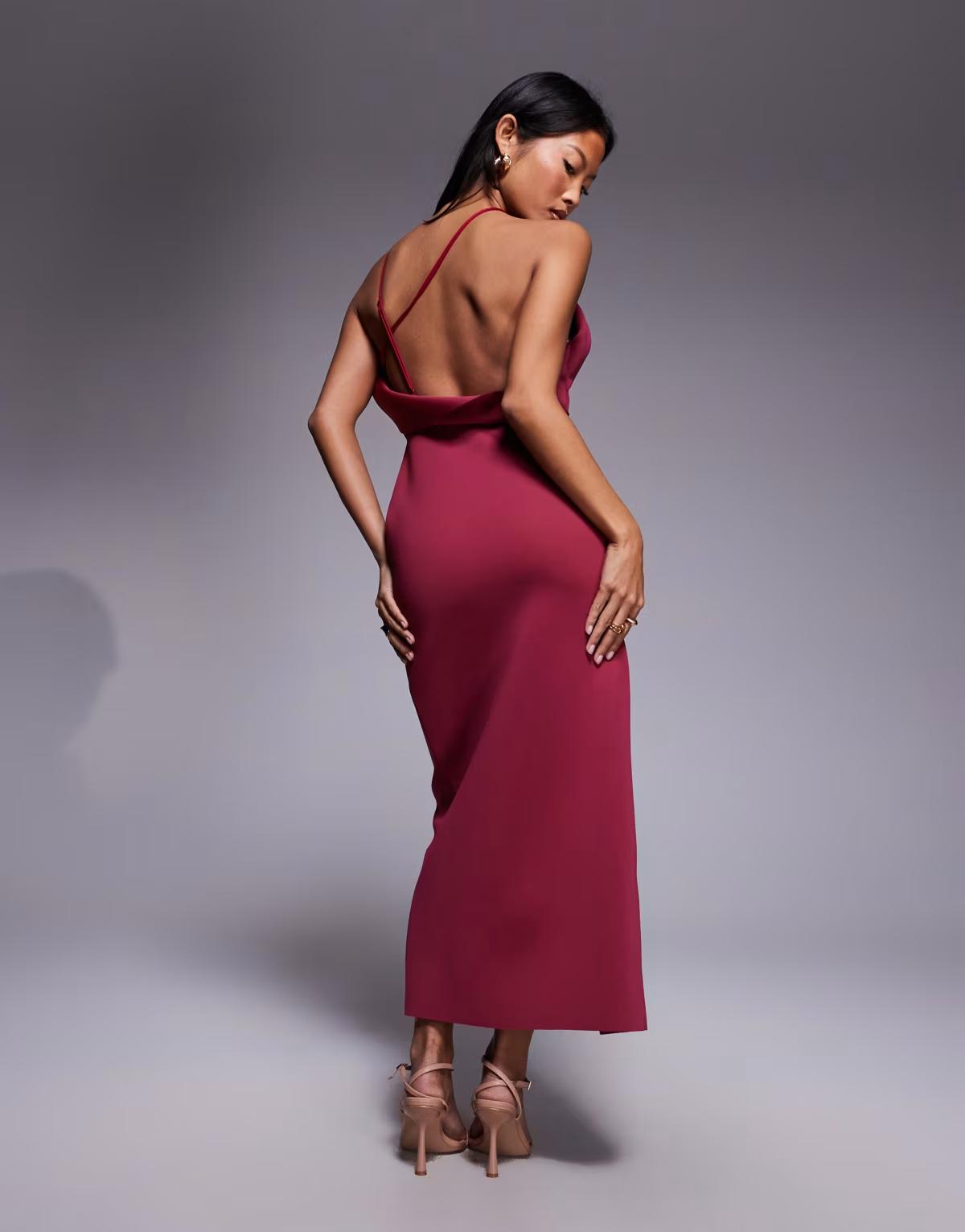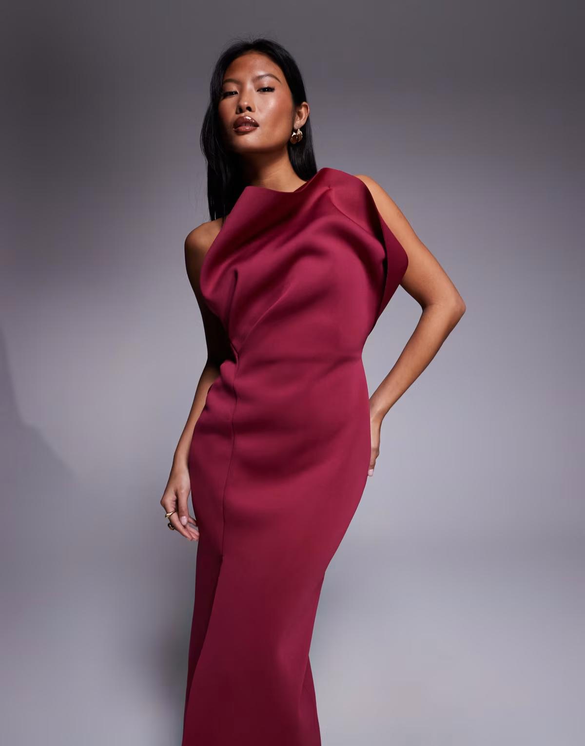 ASOS DESIGN Petite one shoulder exaggerated twist midi dress in burgundy in a scuba-style fabric