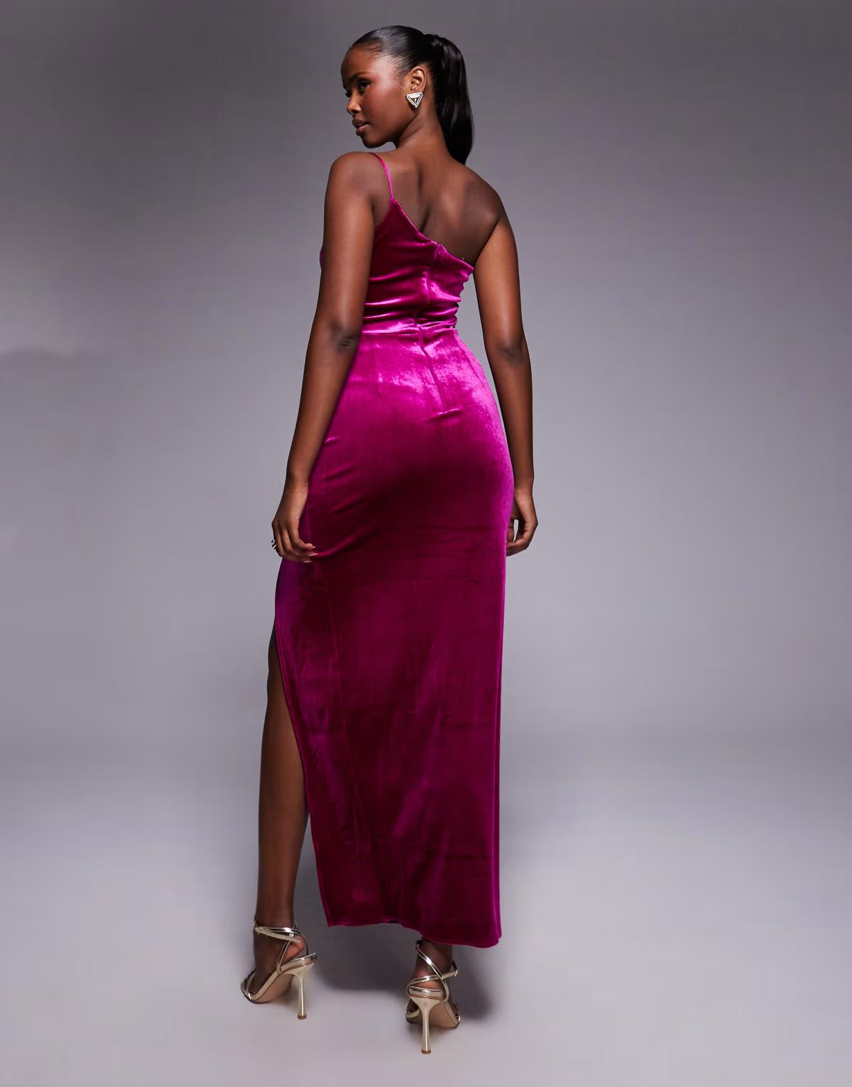 Vesper Velvet one shoulder maxi dress with side split in magenta