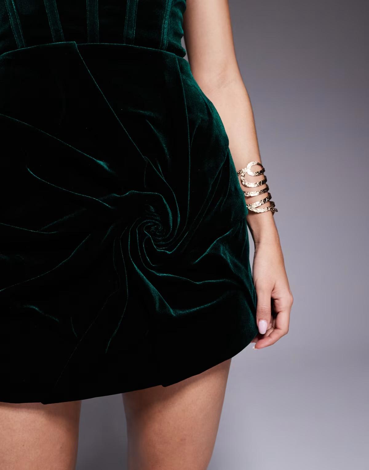 ASOS DESIGN Premium bandeau corseted with ruched flower illusion velvet mini dress in forest green