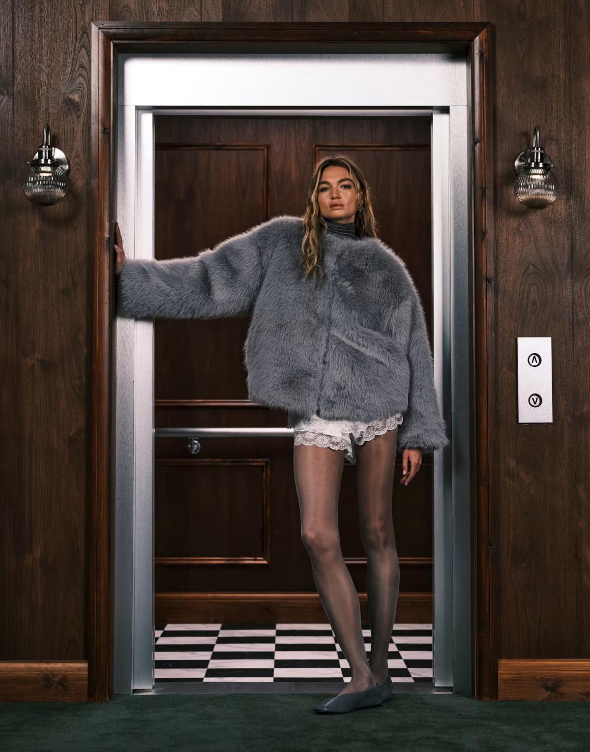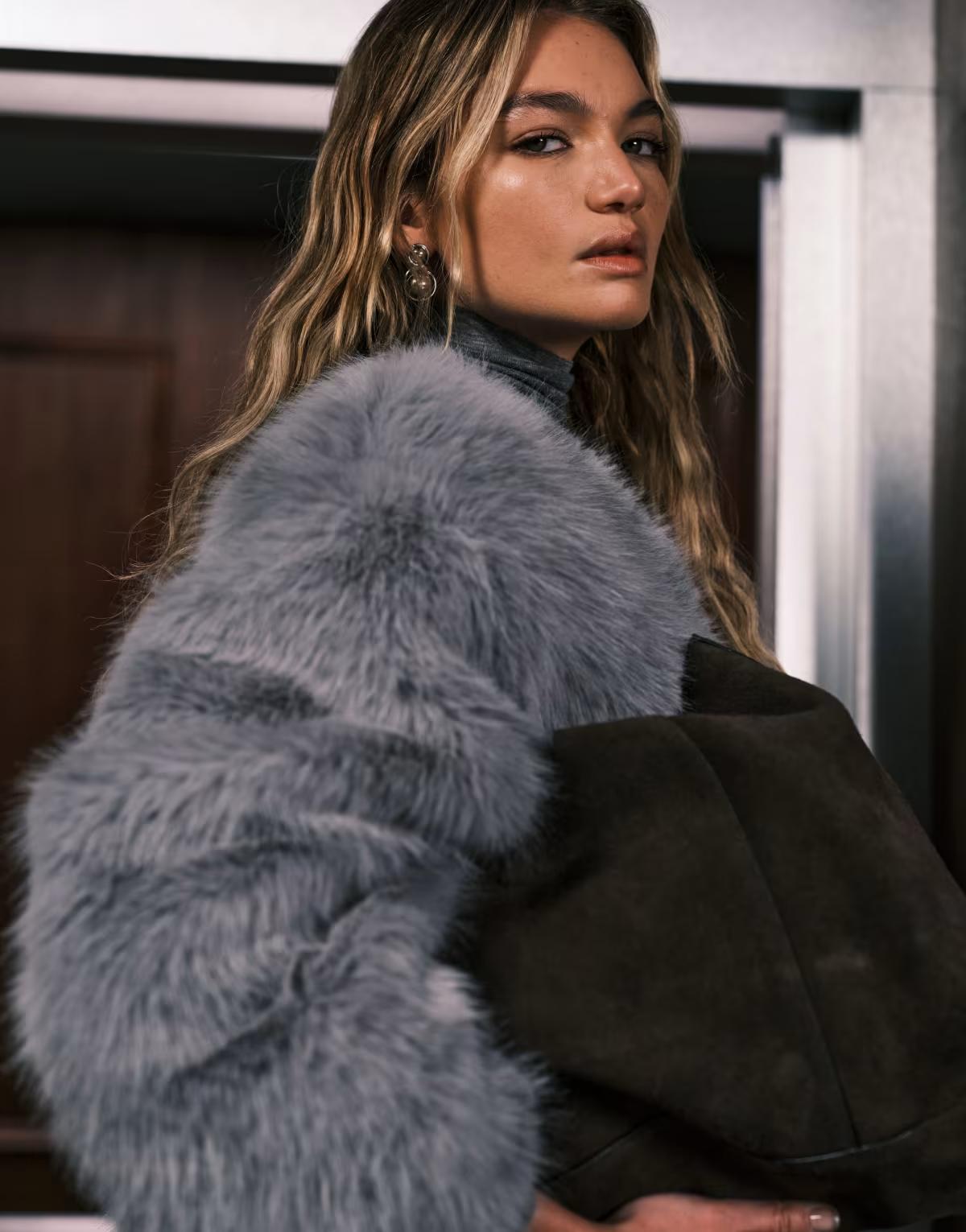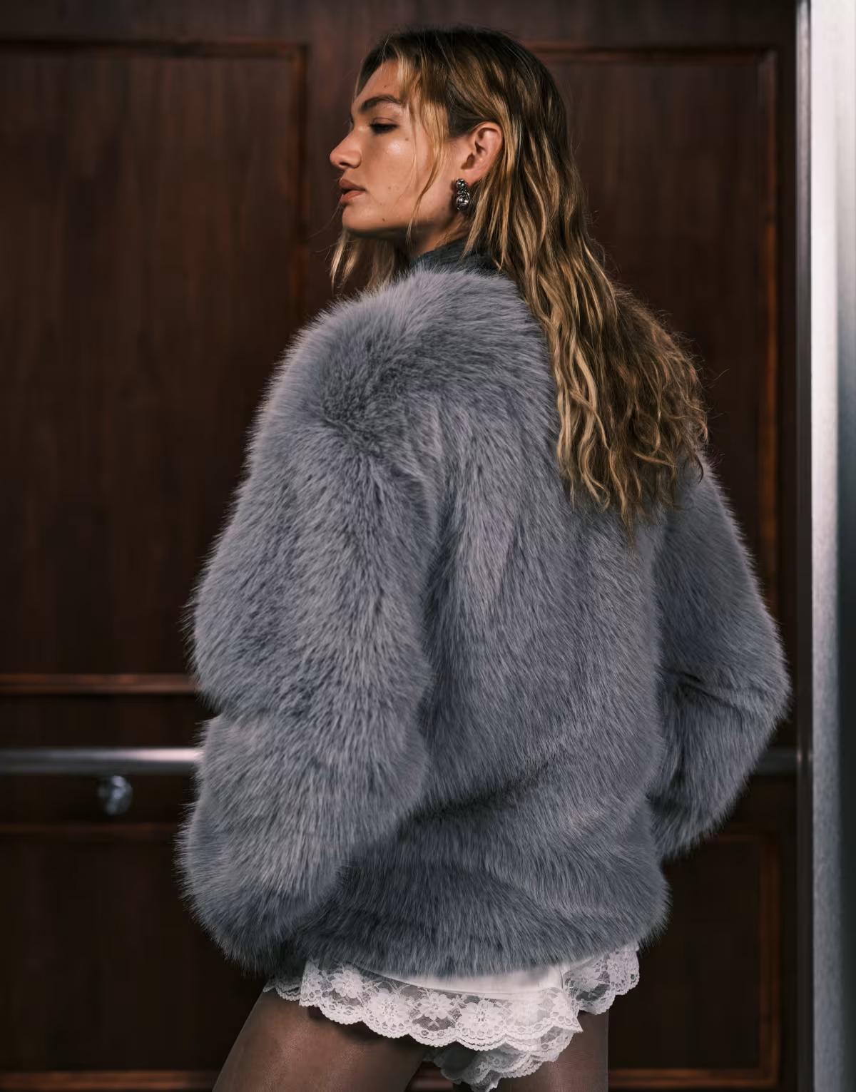 Ghospell Rylee faux fur collarless jacket in charcoal grey