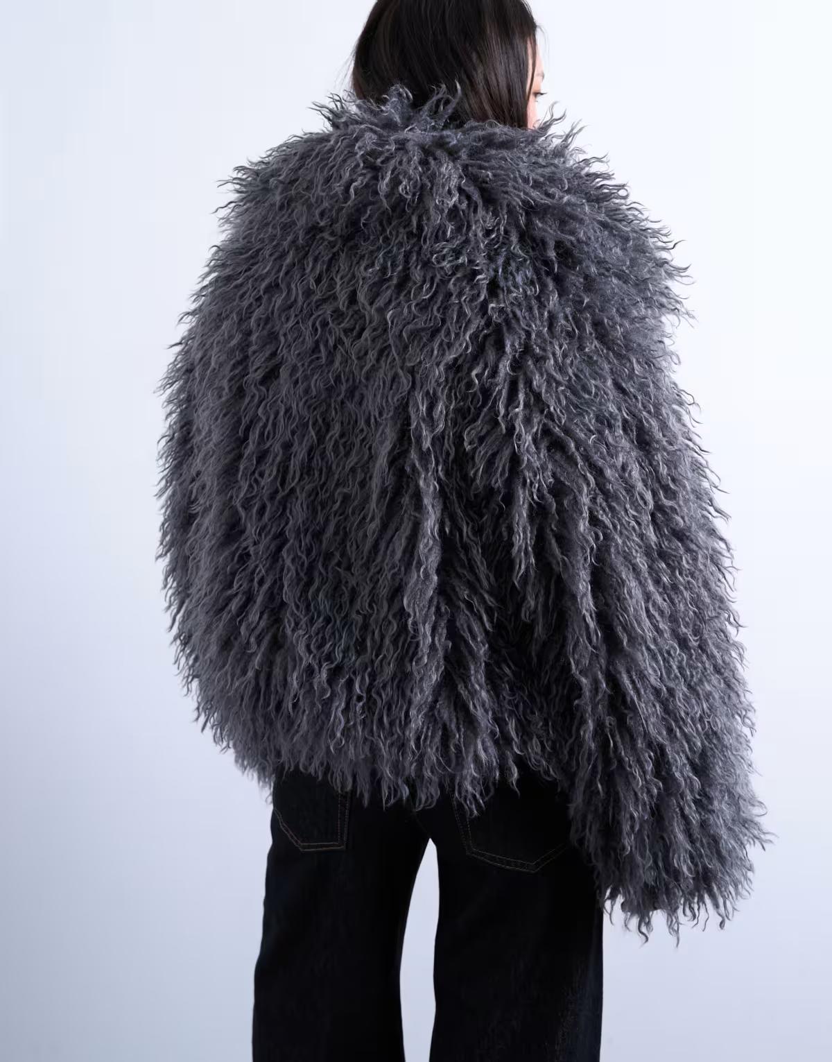 Topshop faux mongolian fur bomber coat in grey