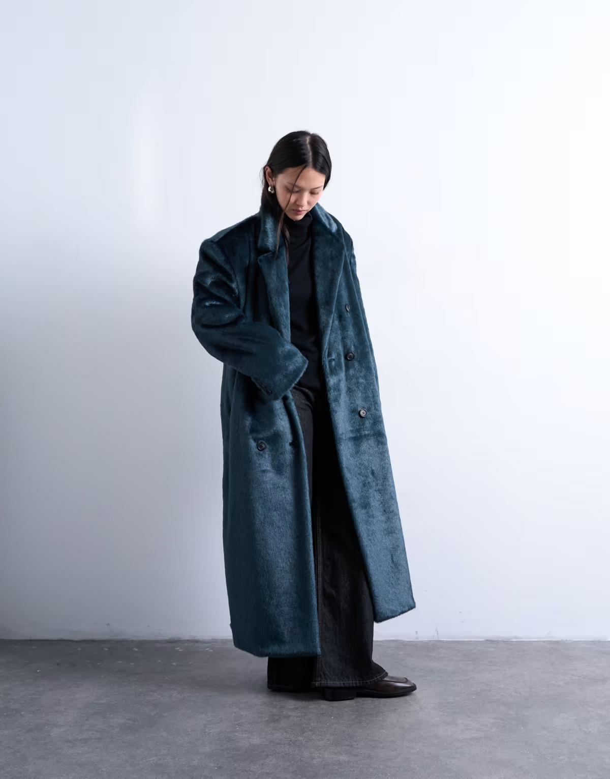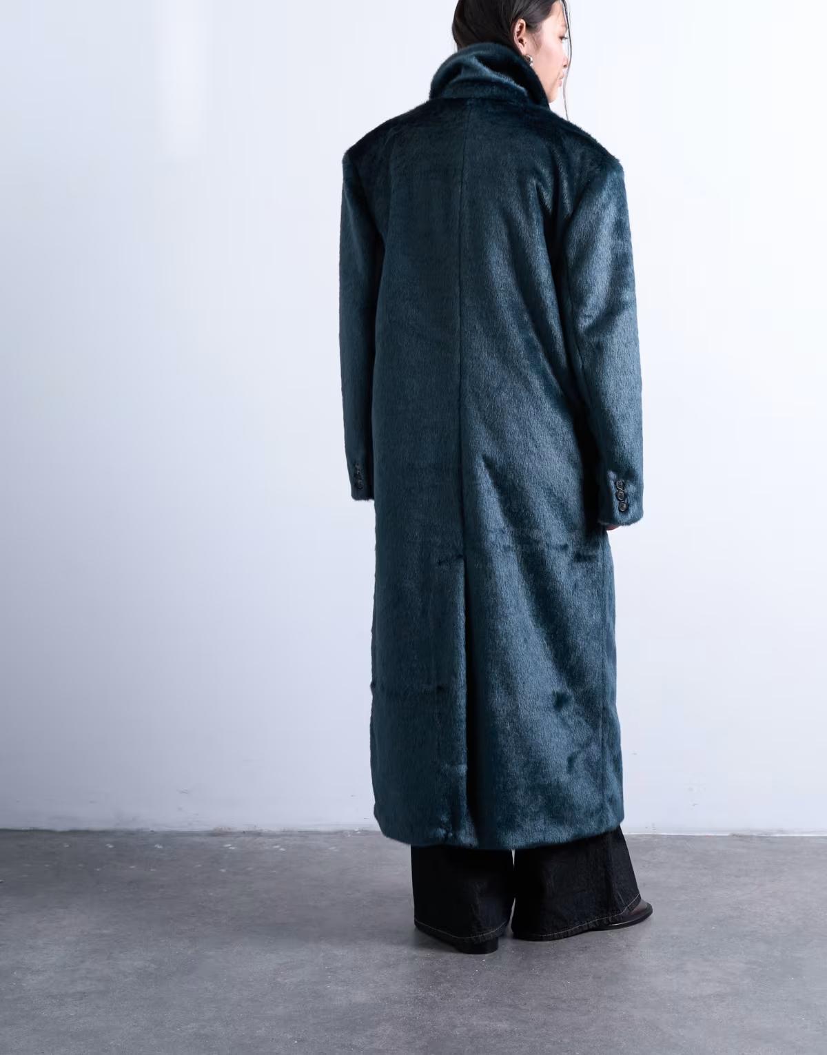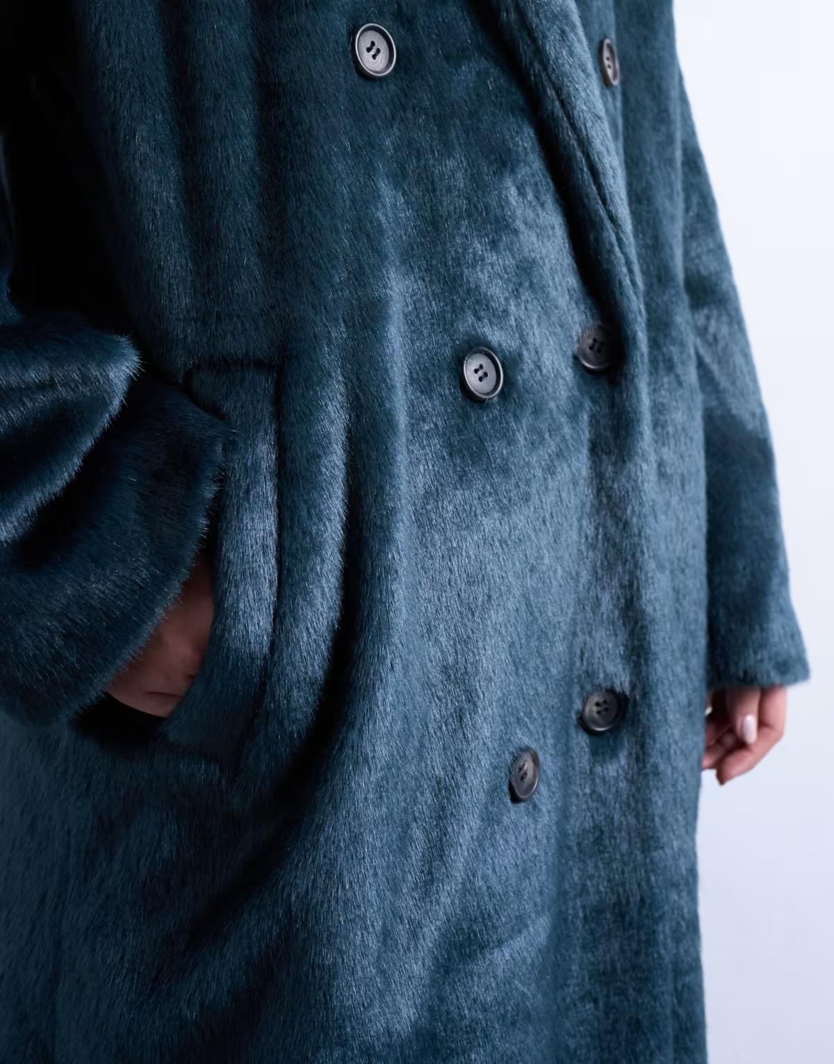 Topshop faux fur longline double breasted coat in teal