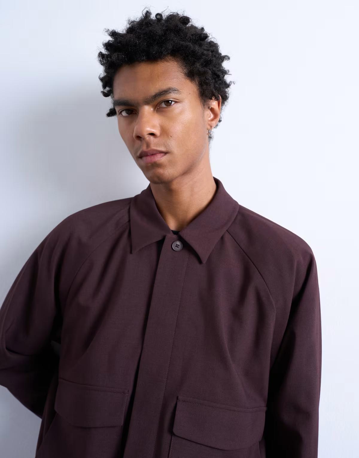 This jacket is crafted from a woven fabric. It features a spread collar, concealed button placket, side pockets and an elasticated hem