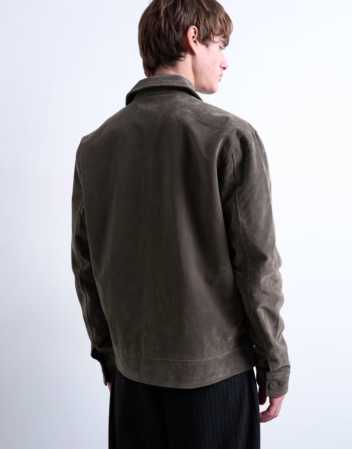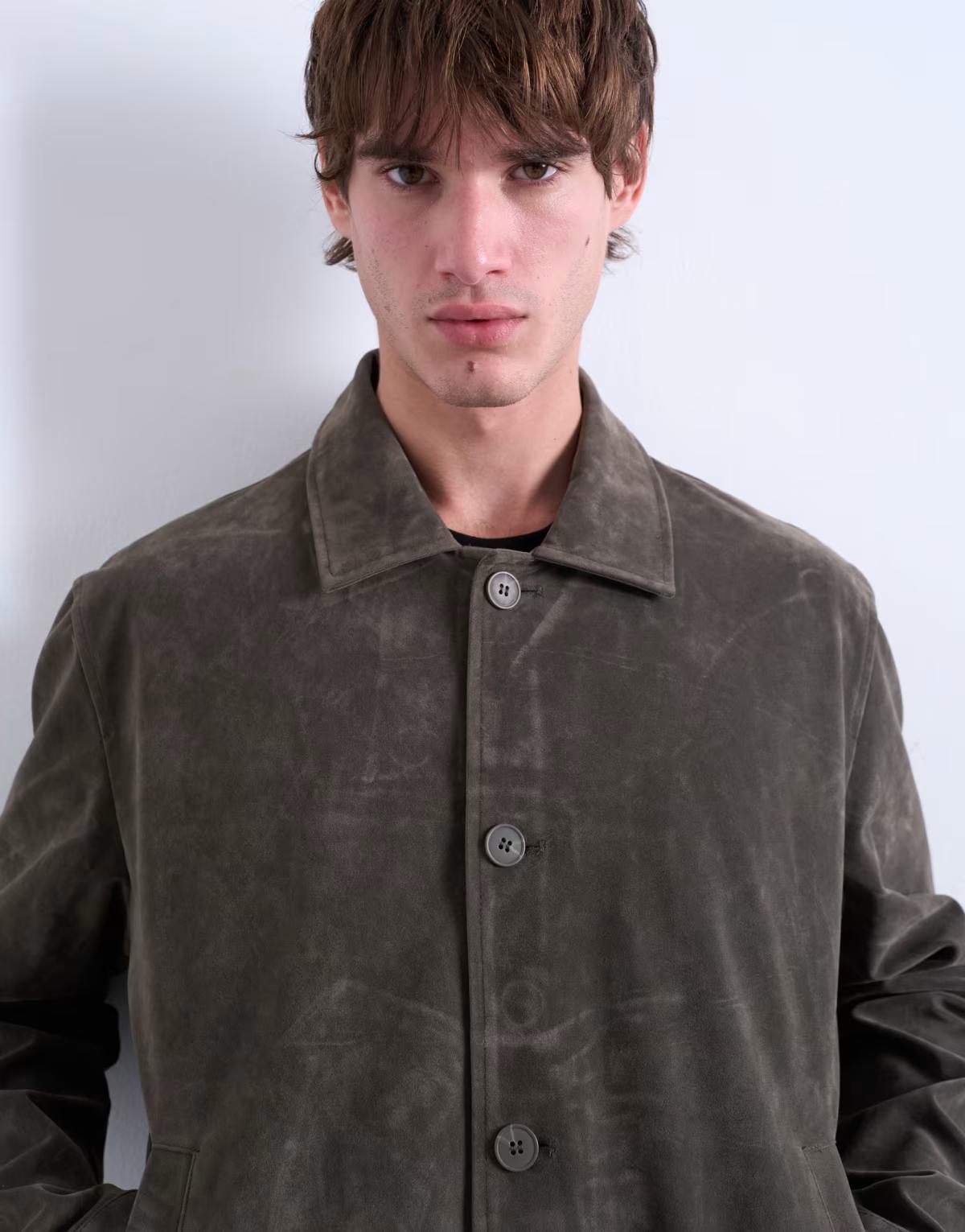 This jacket is crafted from a soft, textured fabric. It features a spread collar, button placket and functional side pockets.
