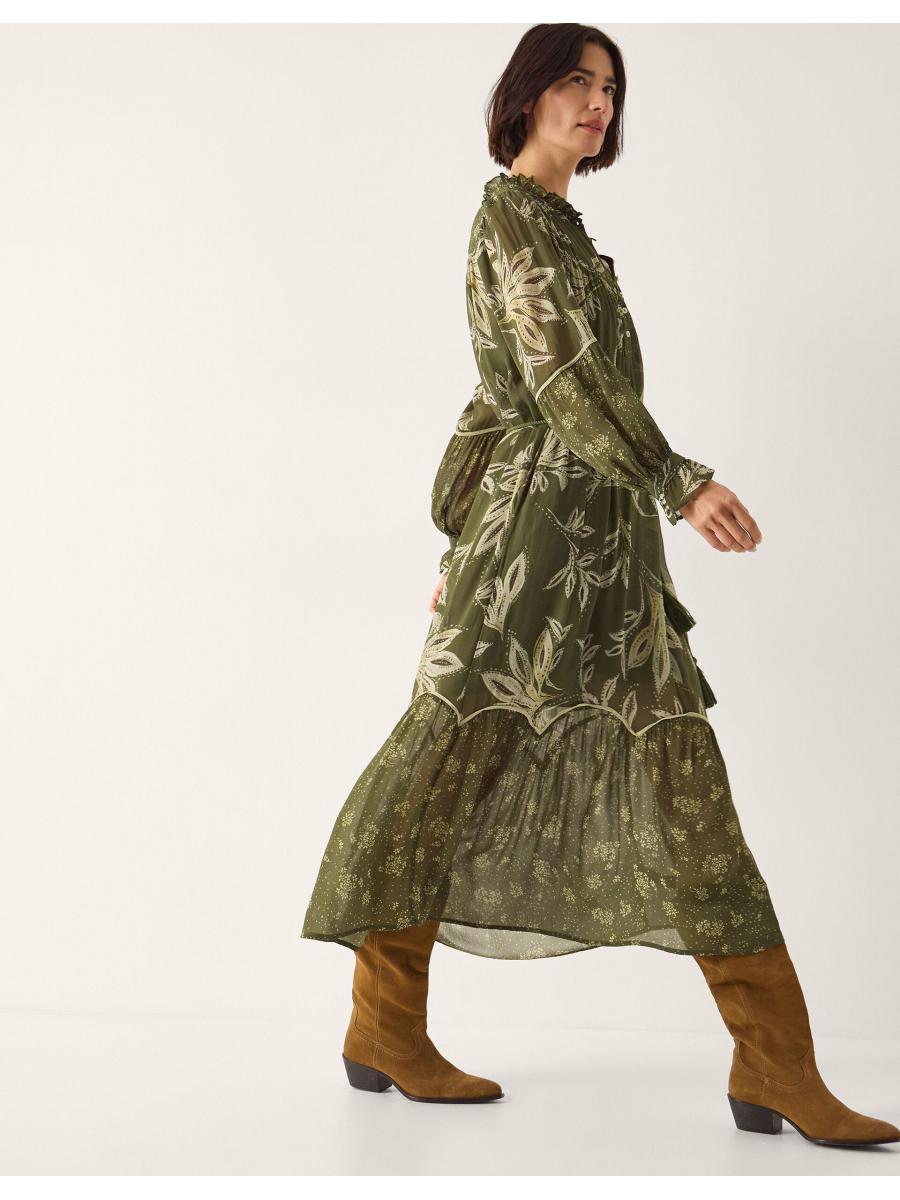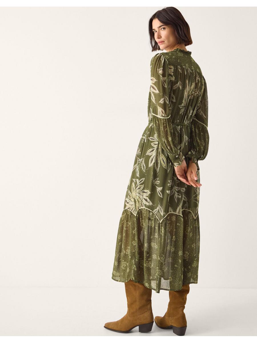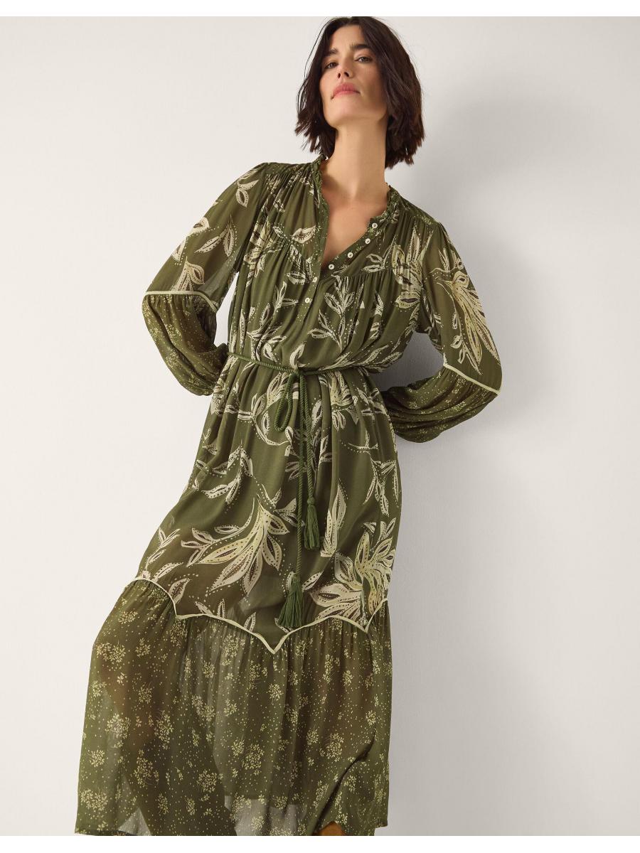 Wear your greens. A little boho, a little Western, this dress nails both trends effortlessly for the new season. The mix of leaf and floral motifs bring a feminine feel, whilst the khaki backdrop complements tan suede accessories to perfection. Green