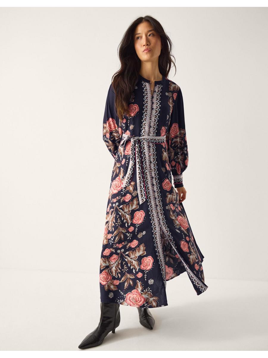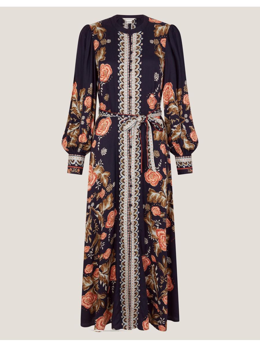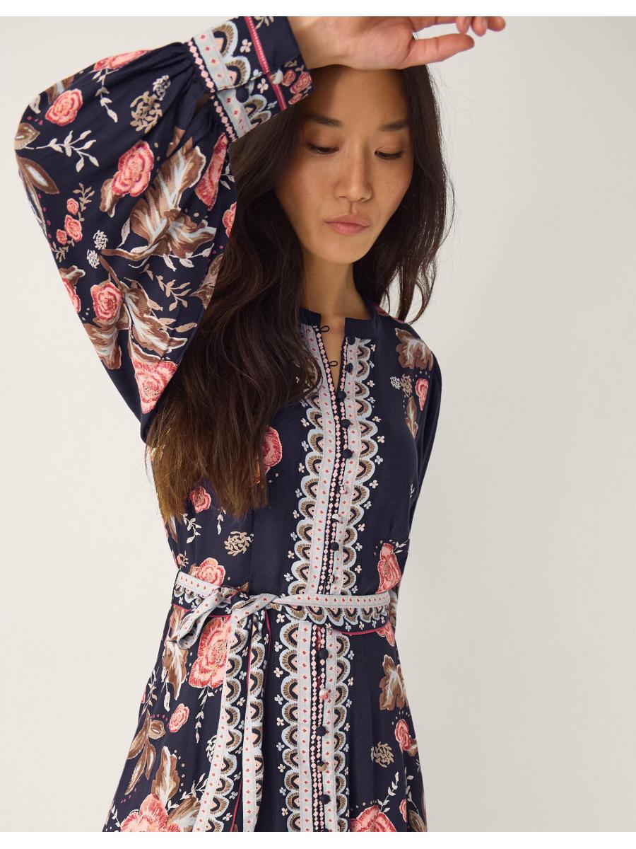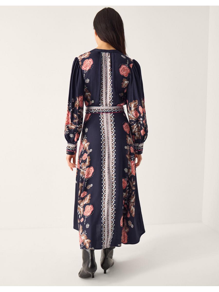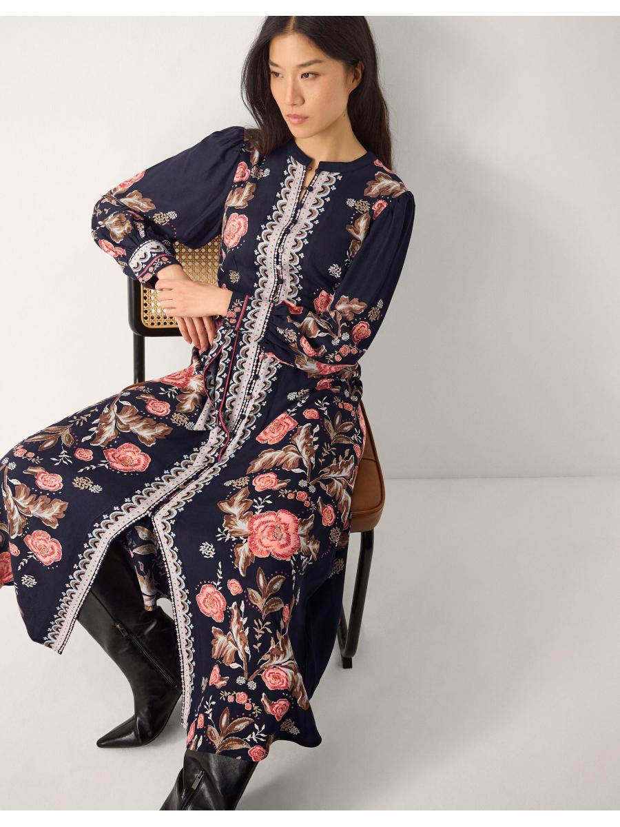 In full bloom. Feminine, soft and meadowsweet, this dress is a timeless style suited to any occasion. Showcasing artful florals and decorative motifs, it's framed with blouson sleeves, dainty button fastenings and a tie-up waist for a cinched finish. And thanks to its midi-length, you've got room to show off statement leather boots, platform heels or sleek ballet pumps. Blue