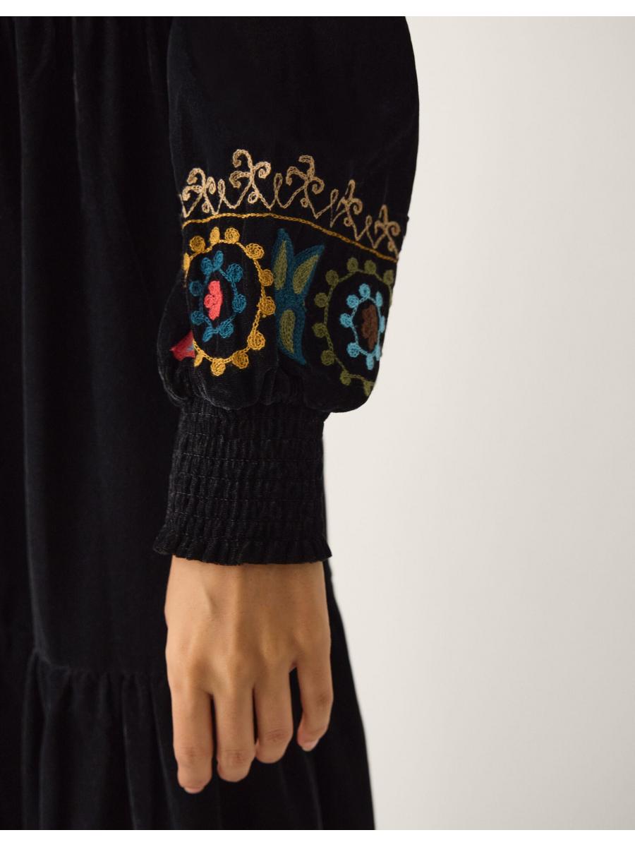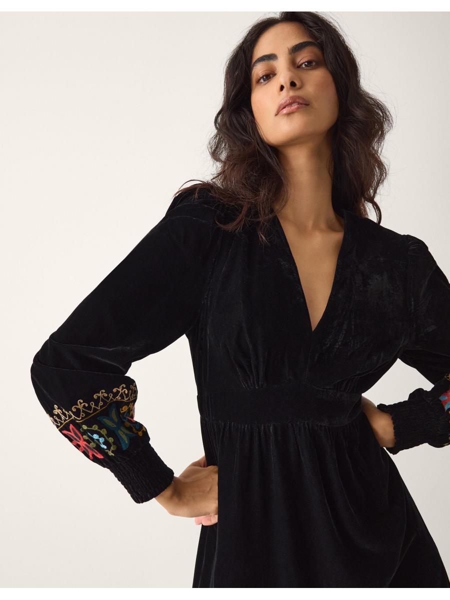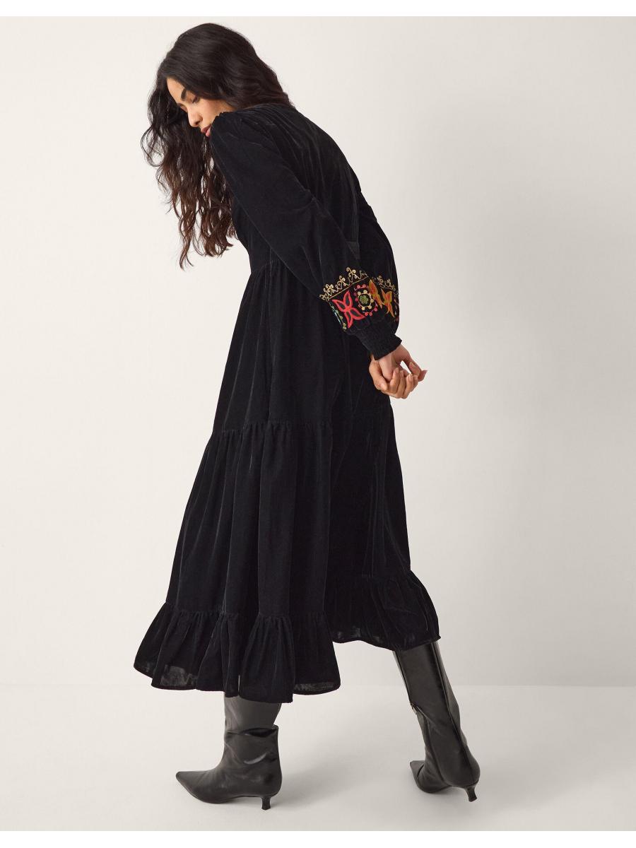 The product: Velvet season, baby. Elevate your collection of black dresses with luxe fabrics and colourful trims. Designed with full-length sleeves and a frilly hem that floats to the calves, it's decorated with ornate embroidery around the cuffs in a mix of bright, joyful shades. For a look you can wear desk-to-dinner, style with knee high boots and your favourite shoulder bag.