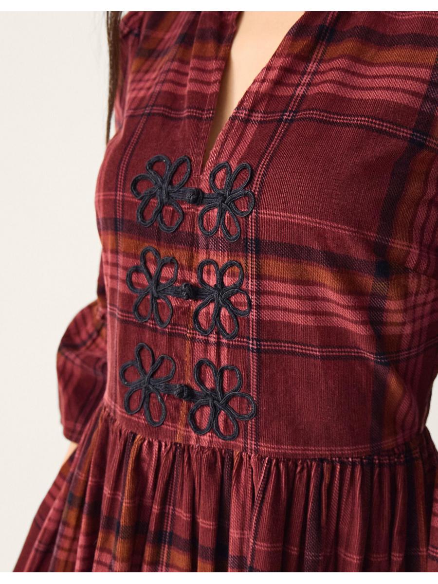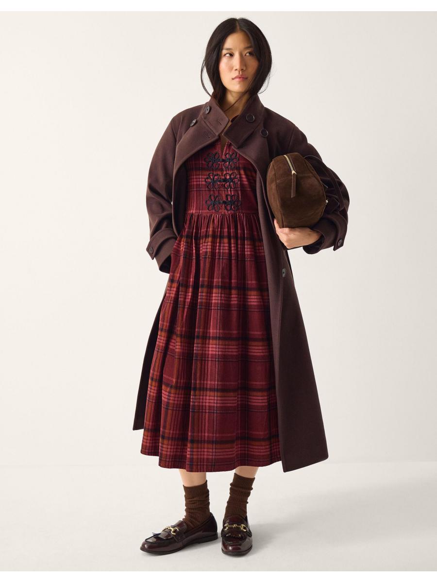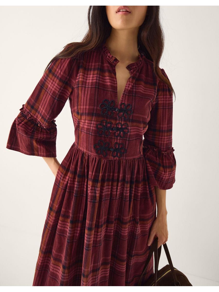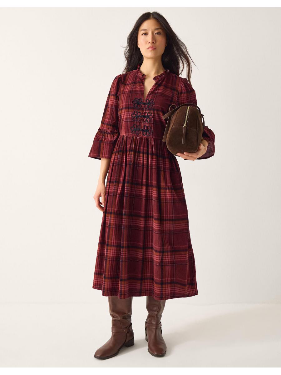 Incoming: Your new favourite dress. Showcasing soft corduroy and check patterns in burgundy and blush tones, everything about this dress *screams* Autumn. Topped with frills for a feminine feel, it's finished with floral Chinese knot buttons through the bib. Cute, right? Red