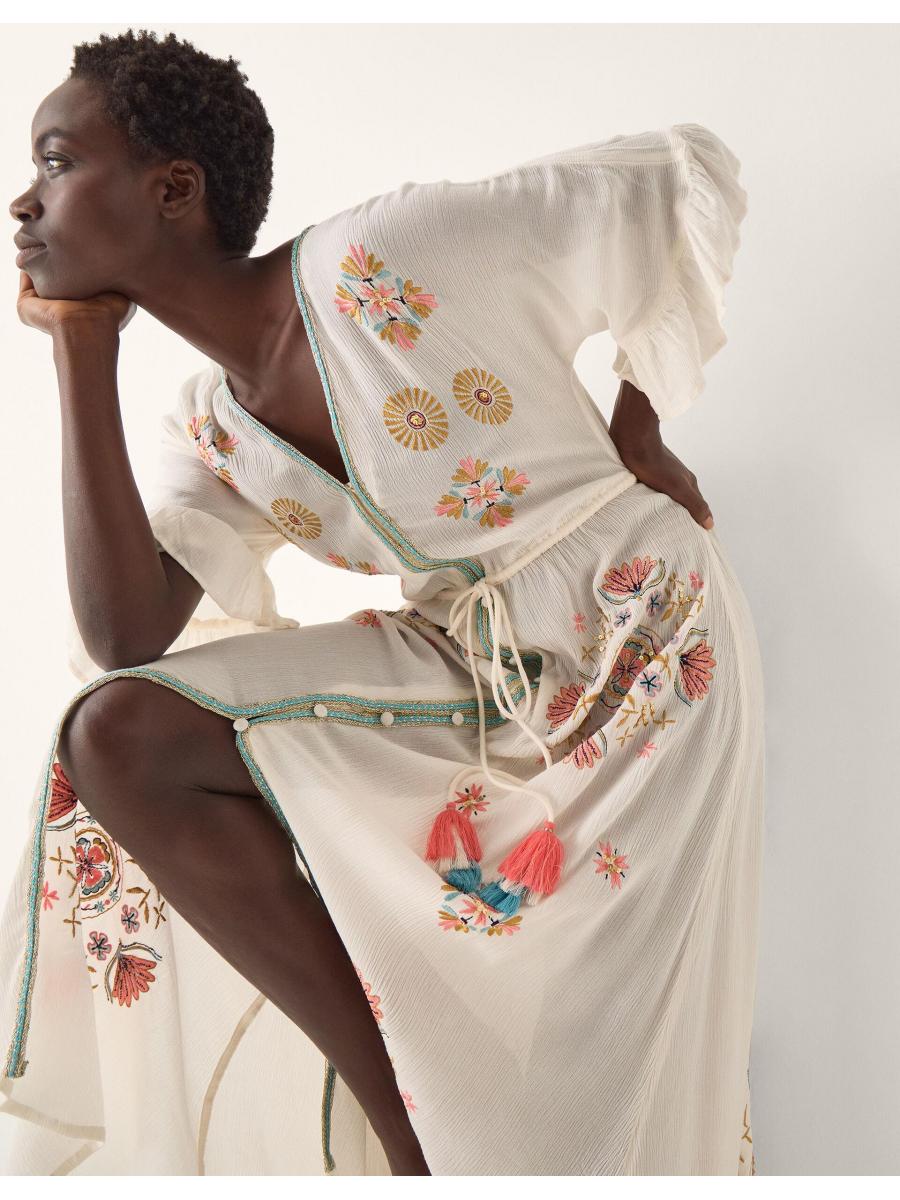Going somewhere? Embroidered with flower and sun motifs, this maxi dress is made for soaking in all the heat! Designed with a golden trim, flowy three-quarter sleeves and a trio of tassels, it's a suitcase staple. Whether you're grabbing midday drinks at the tiki bar or lounging by the pool with a book, this is the thing to grab. White