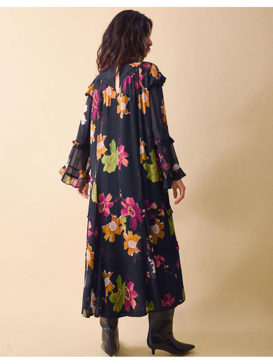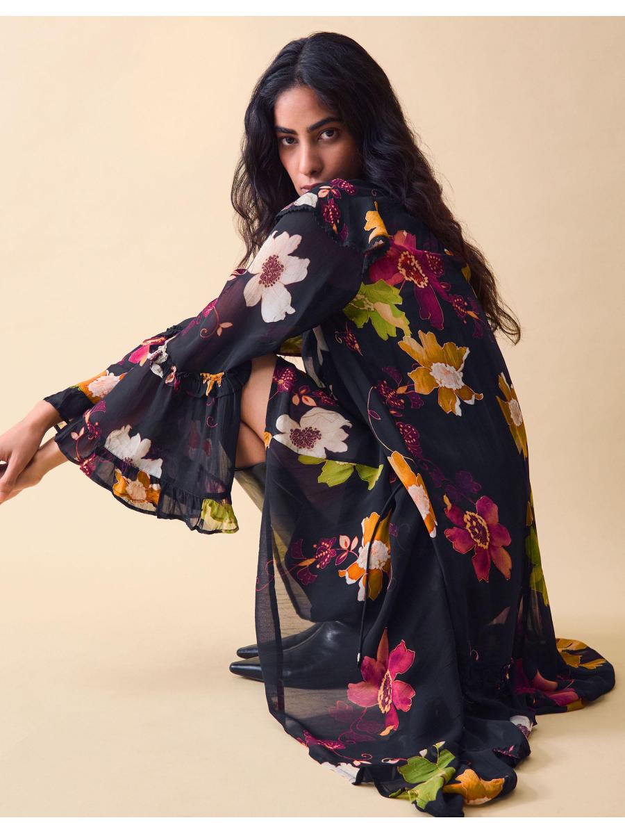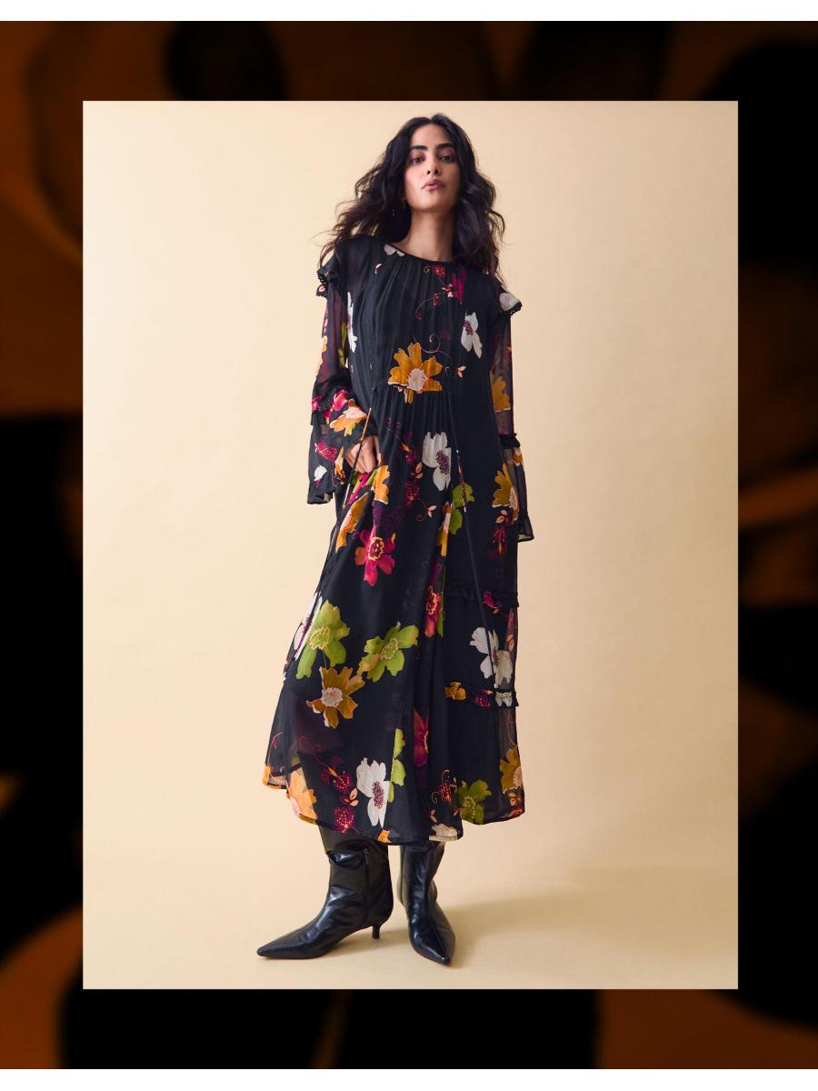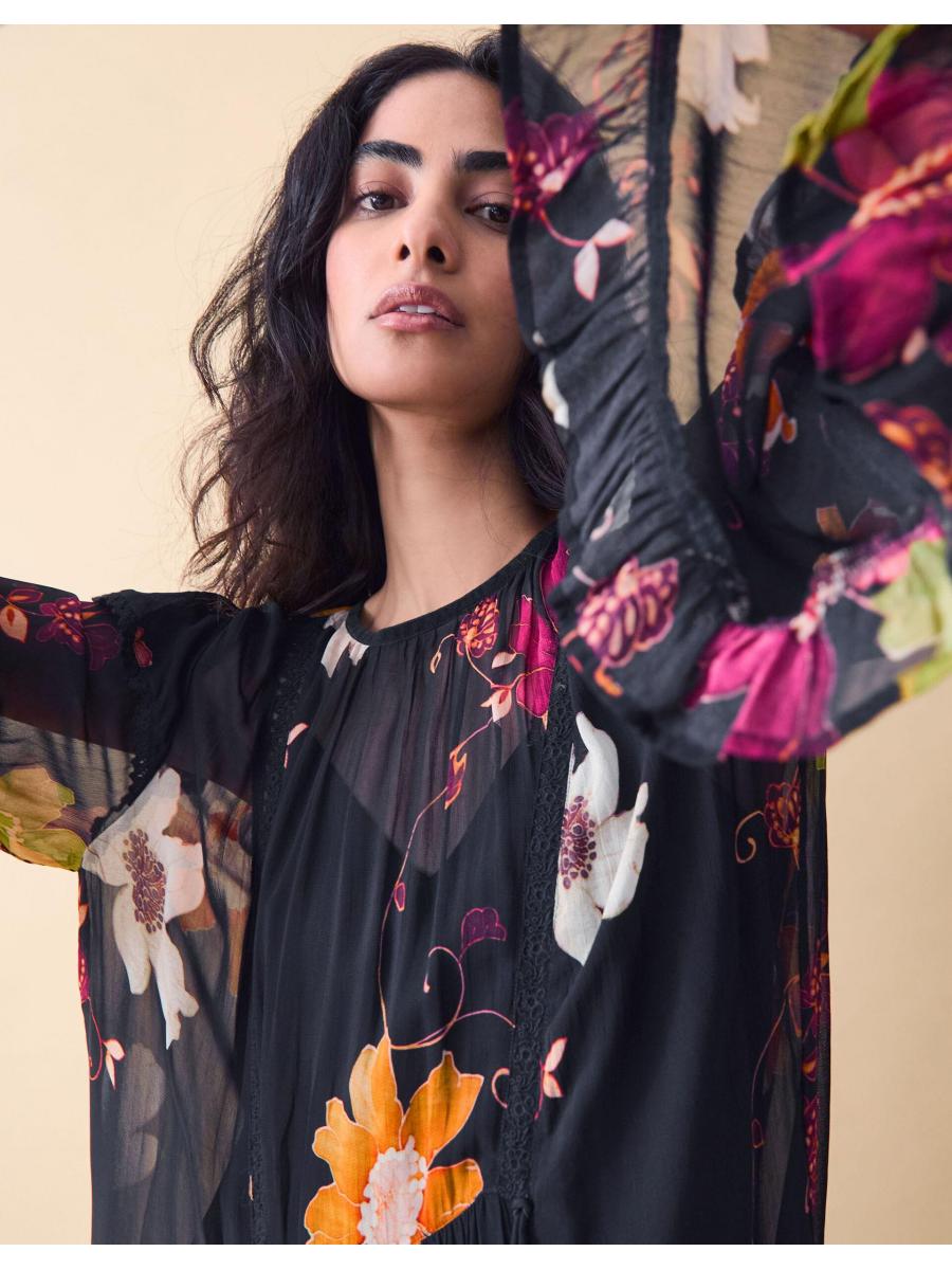 The product: Sheer delight. Whether you're frolicking through meadows or strutting down the high street, it's a whimsical addition to your dress collection. Designed with long, billowy sleeves and a floaty hem to match, it's cloaked with artful florals in fiery, autumnal shades.