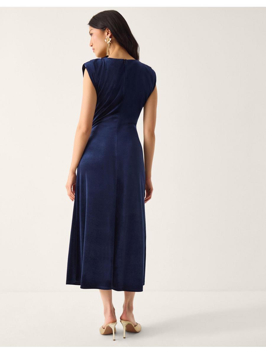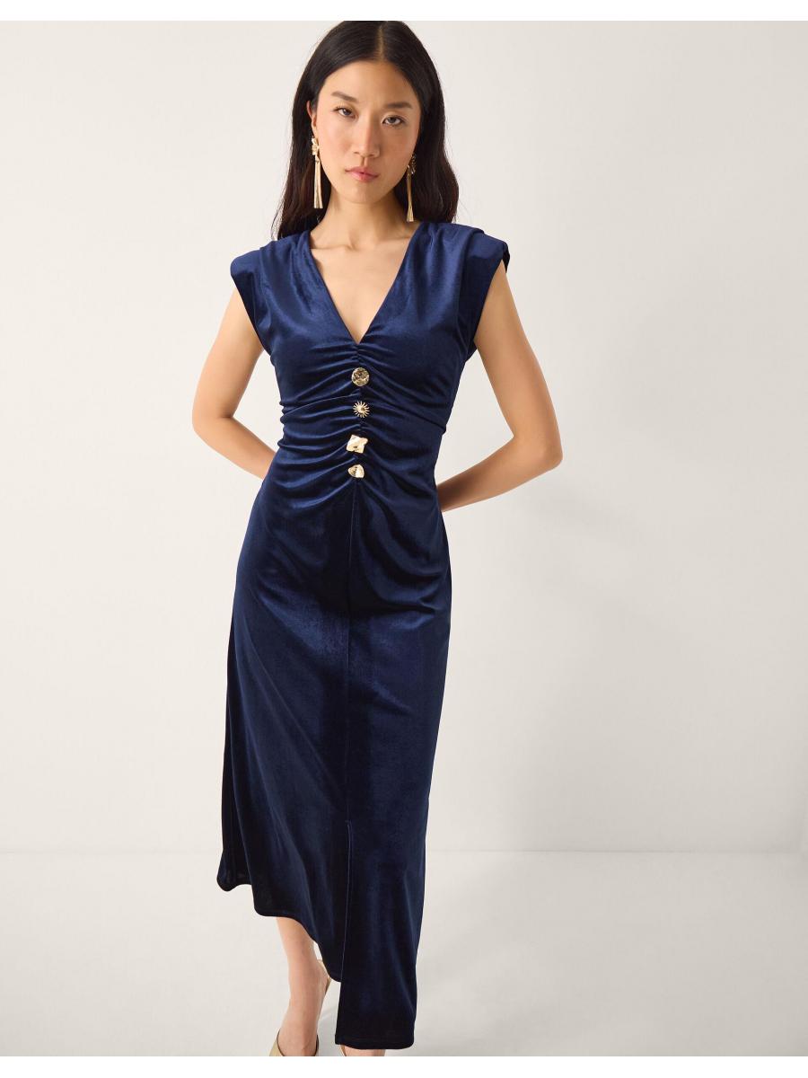 Va-va-voom. Cut from ultra-smooth velvet, this dress has been designed with statement gold-tone buttons, a flattering V-neck and a front slit for extra flair when you make your entrance. Cloaked in midnight blue, this piece is the type you make plans for. Blue