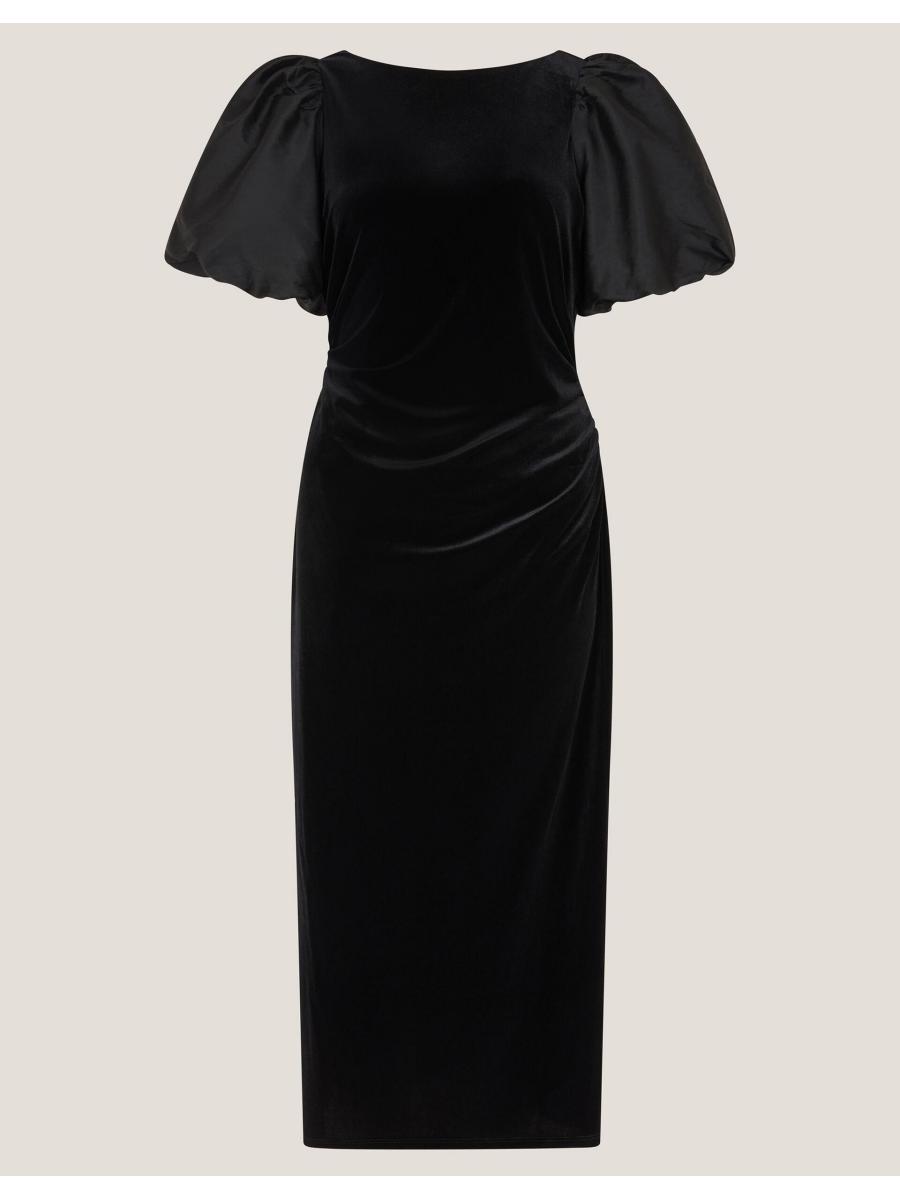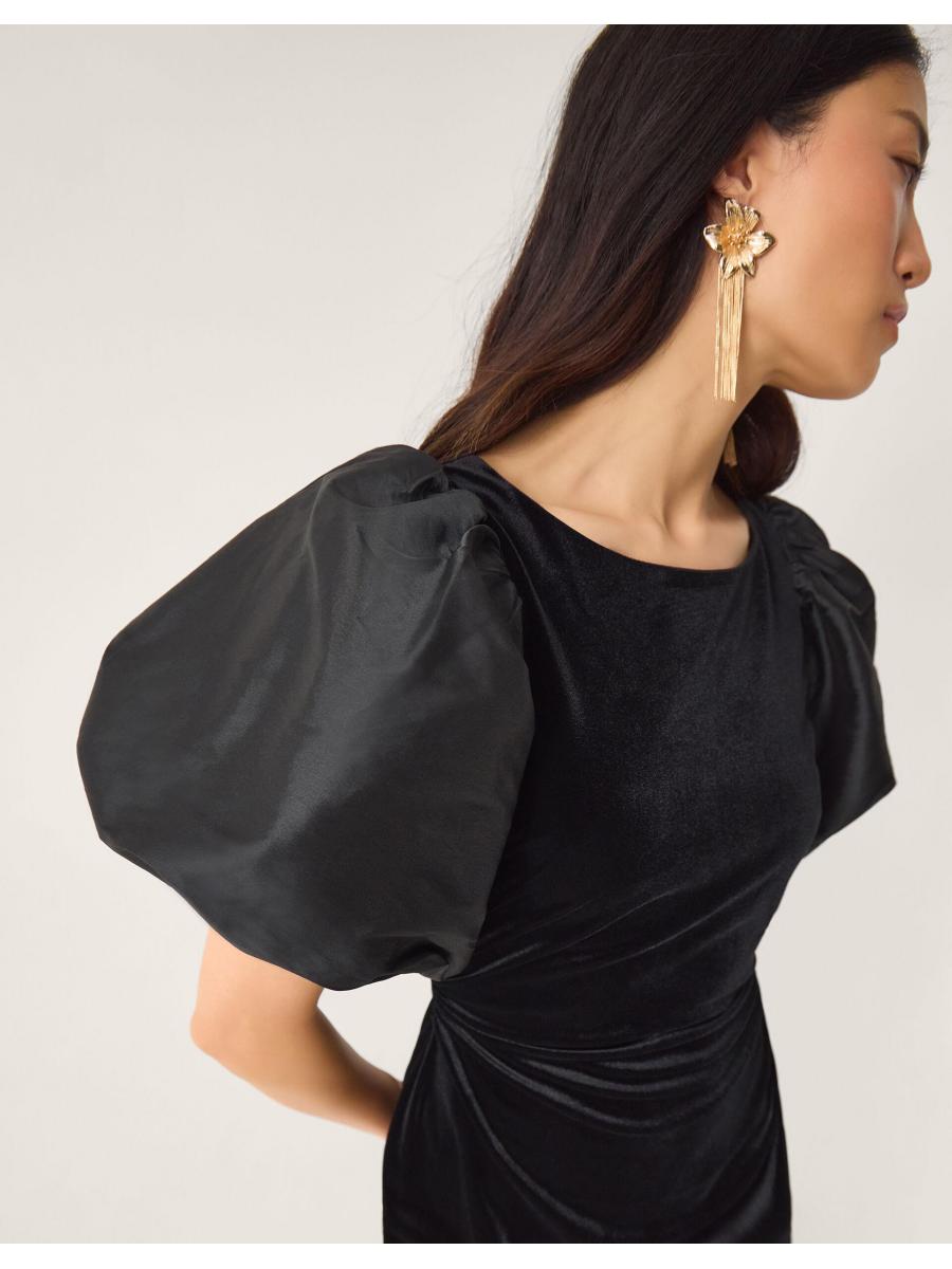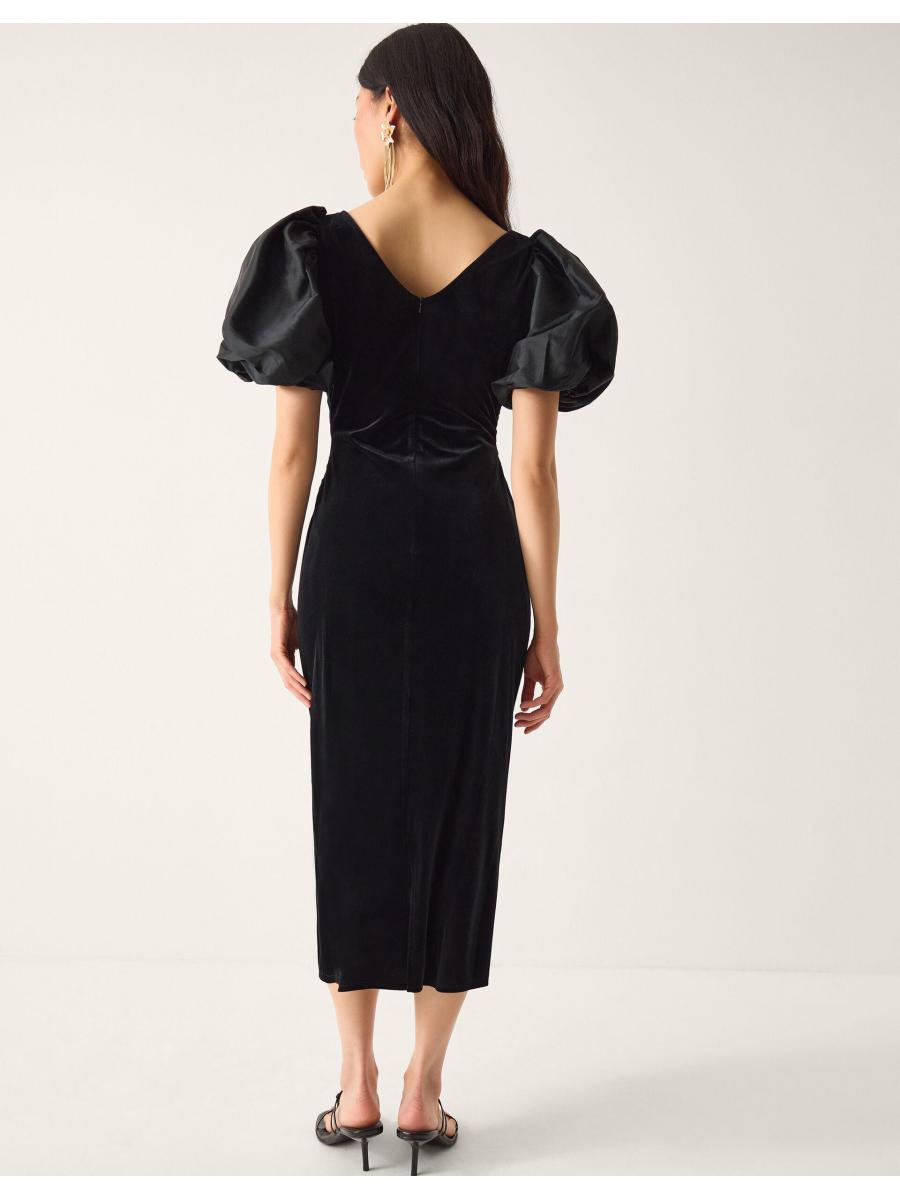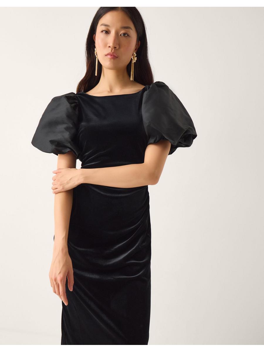 Make an entrance. Cloaked in velvet, this midi dress has been designed with puff sleeves and a back slit, for added drama. Flatteringly cinched at the waist, it's made to be shown off at black tie events. Voila! Black
