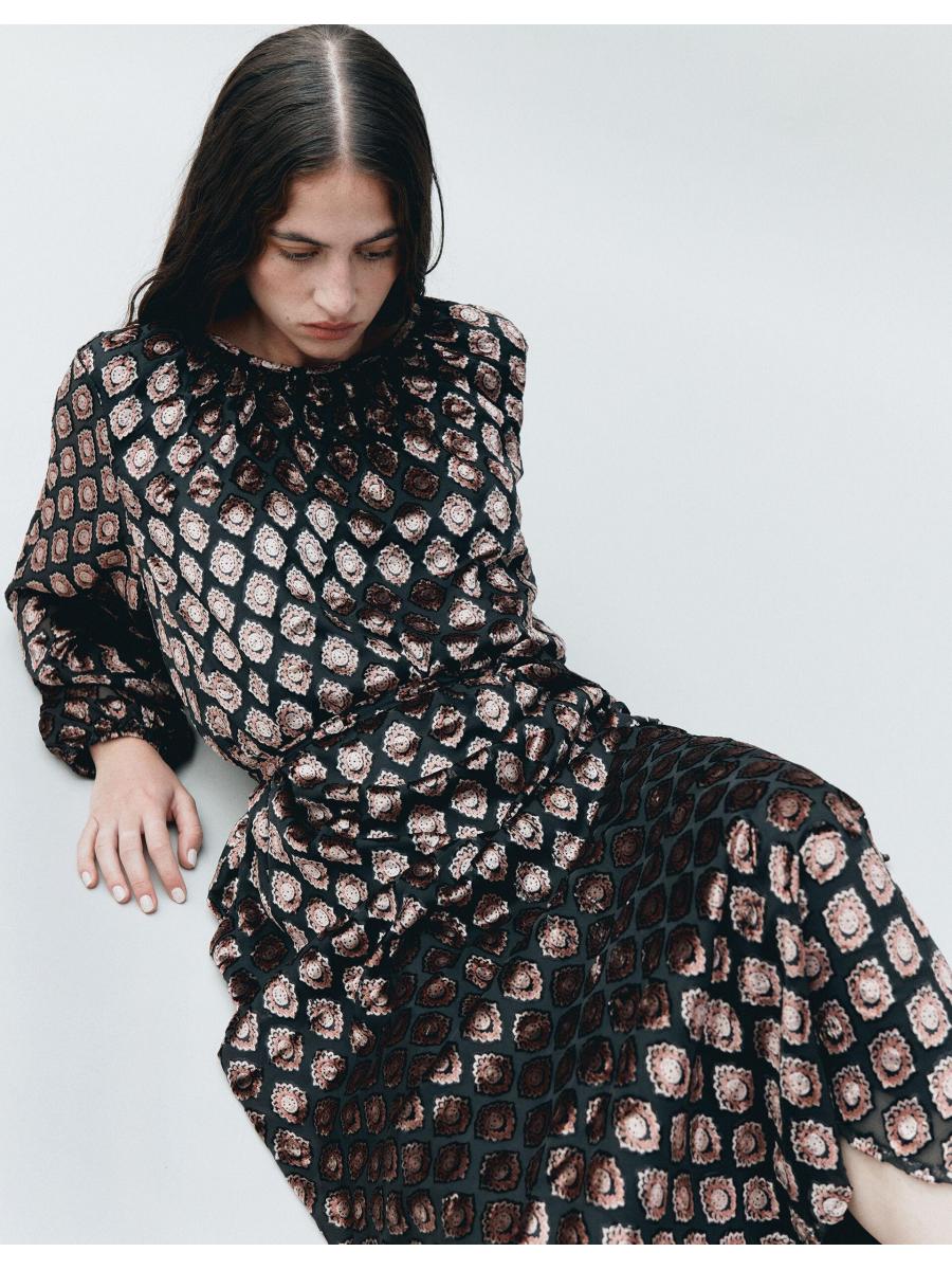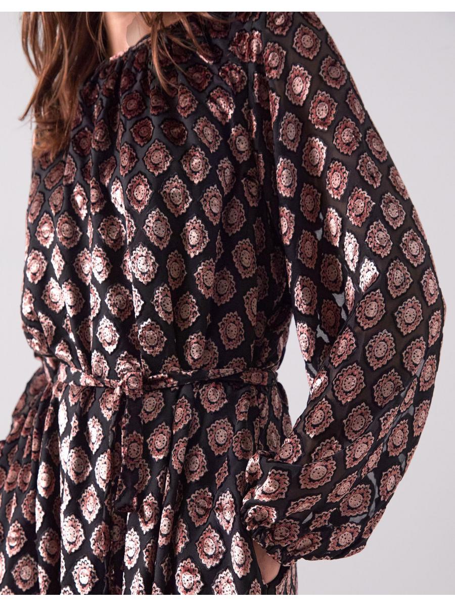 The product: Elegance in every detail. Designed with a relaxed fit and featuring an all-over geometric print, this long sleeve maxi dress will take you from office to after-work drinks in style. Finished with a tie waist belt.