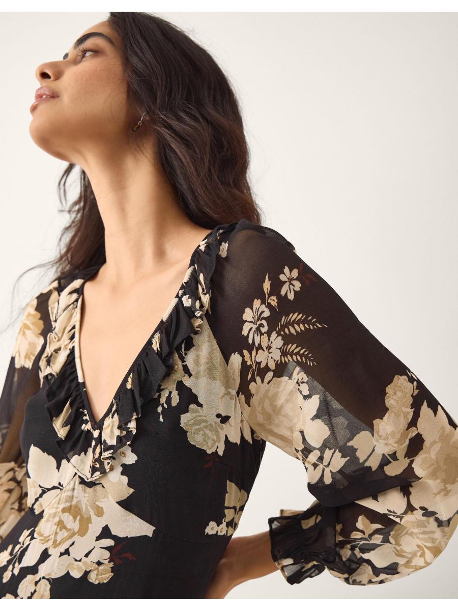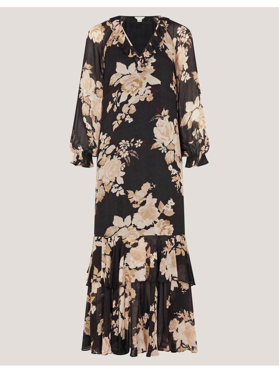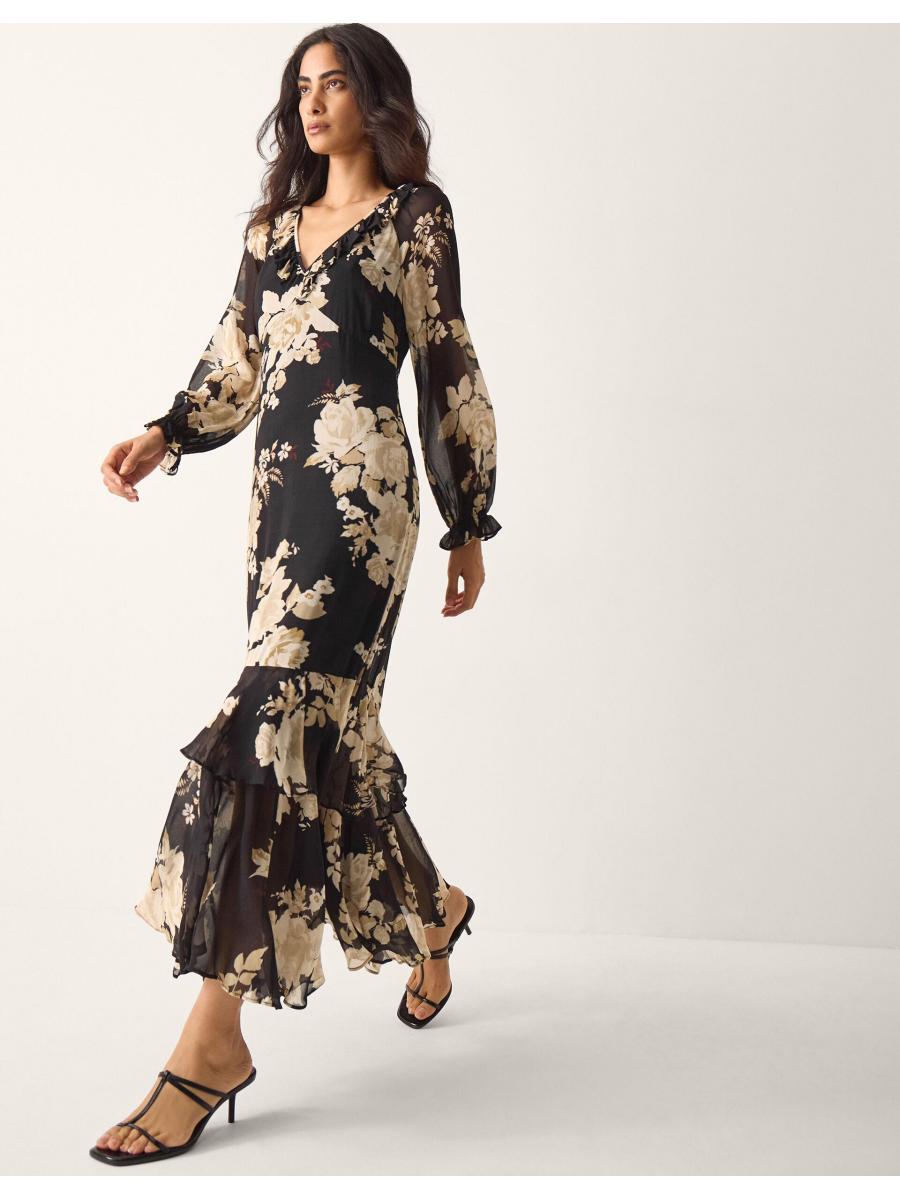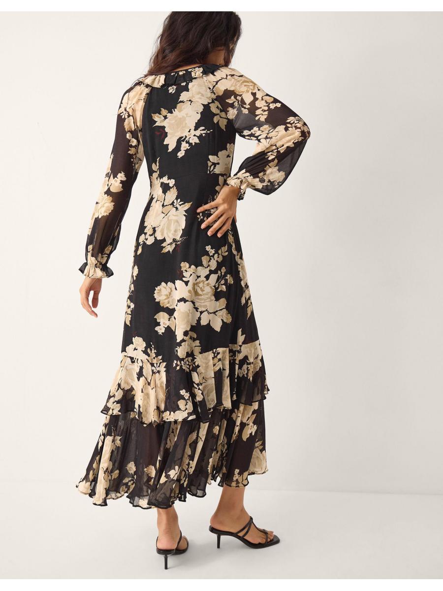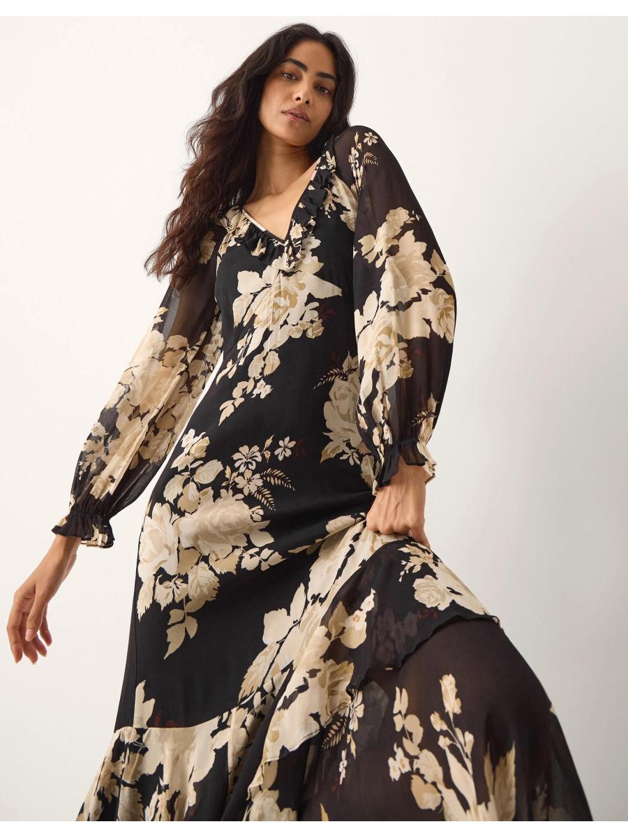 For the frill of it all. Dipped in golden flowers, this long dress is the floaty number that's been missing from your wardrobe. It features sheer sleeves and ruffled tiers, making it perfect for impromptu after-work drinks. Cheers! Black
