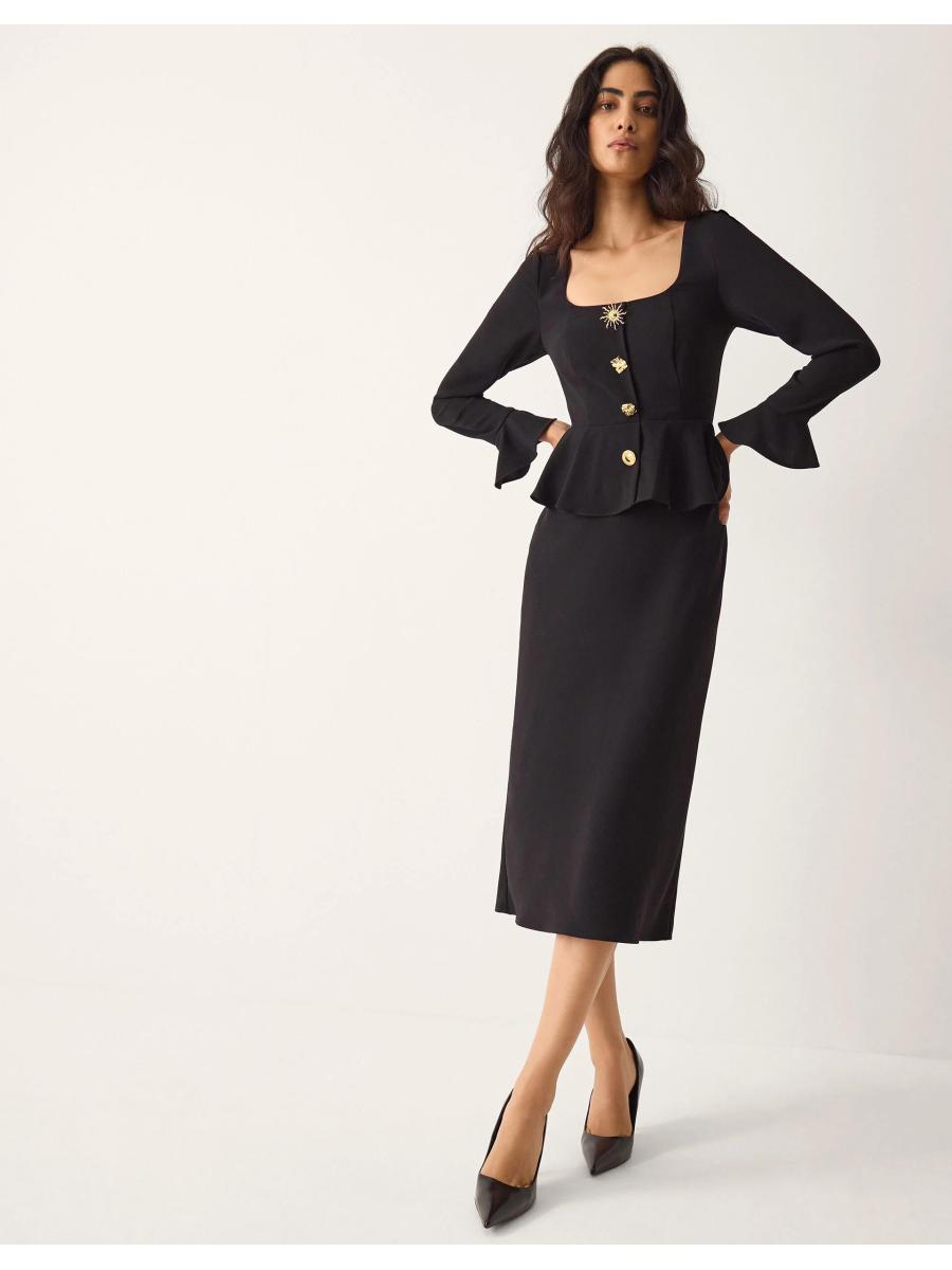 Let's talk business. Designed with a flattering square neckline, flared sleeves and a classic pencil skirt, this dress is here to transform your in-office days. Topped with statement gold-tone buttons, it's sure to be the talk of the floor. Just add heels. Black
