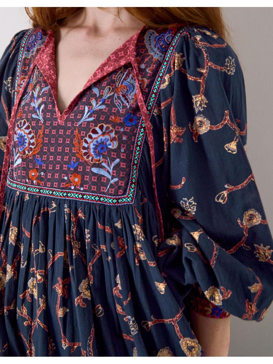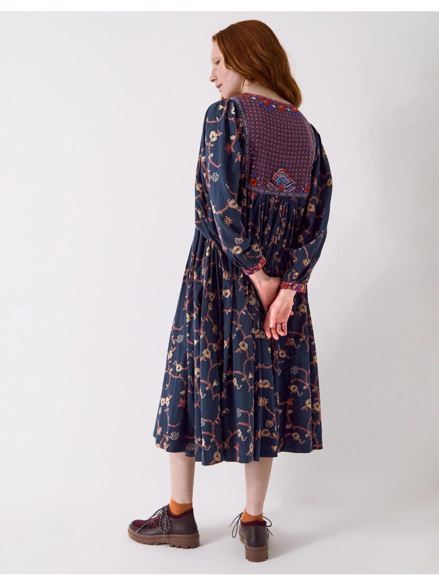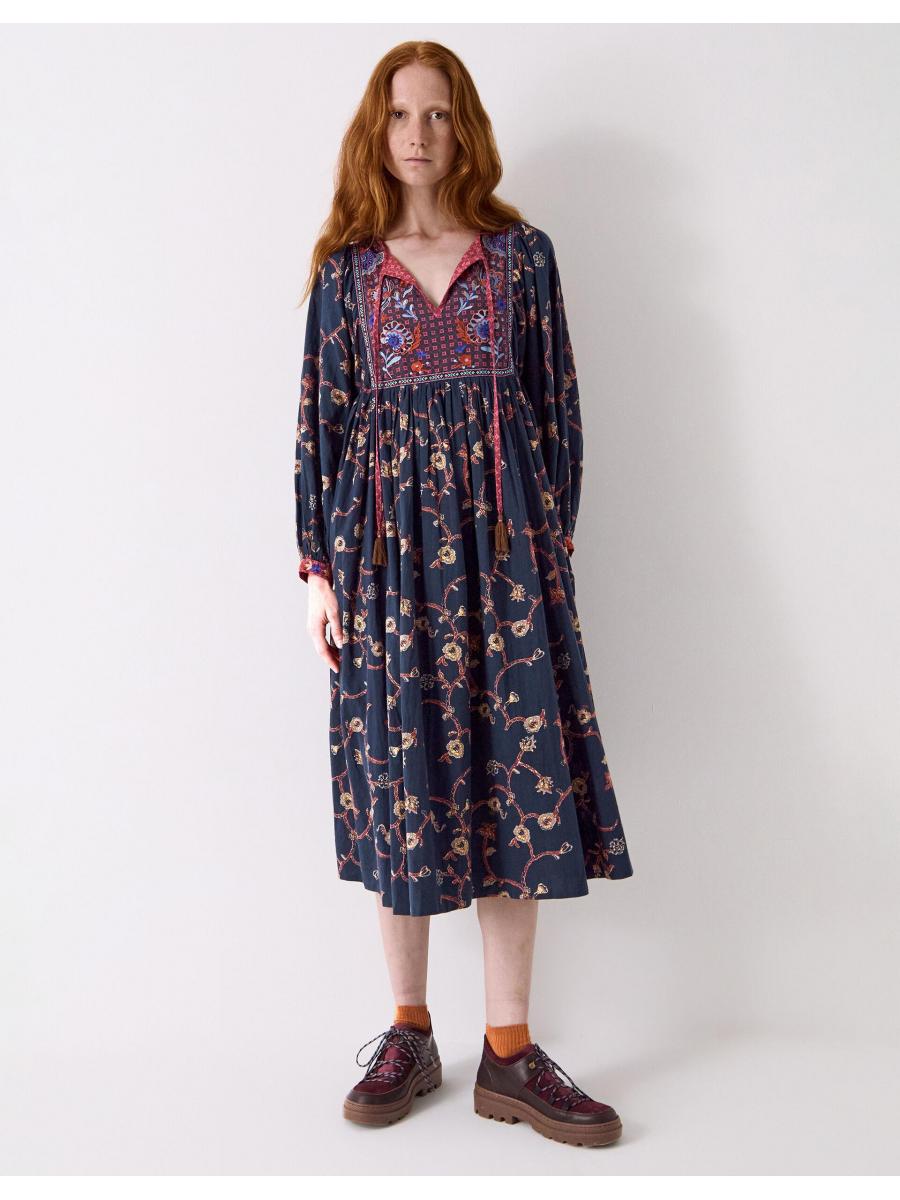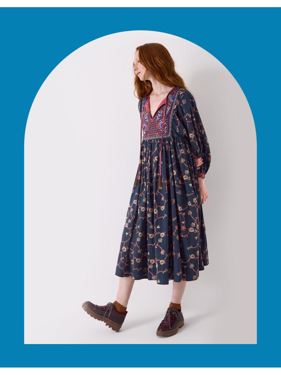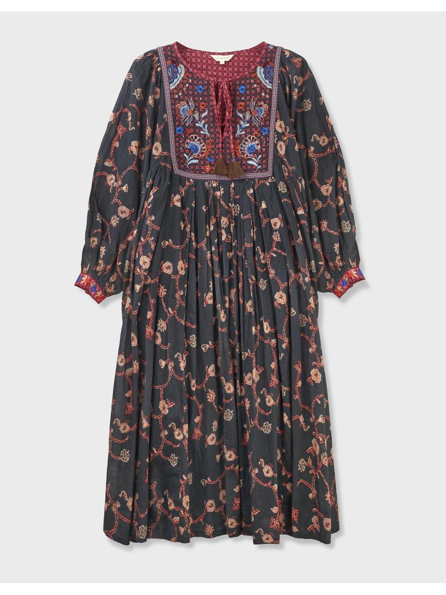 The product: Bloom in bohemia. Cloaked with winding florals in Autumnal hues over a dark backdrop, this dress is the perfect pattern to show off this season. Designed with long sleeves and a midi hem, the bib is embroidered with symmetrical flower designs for an elevated finish.