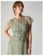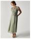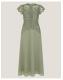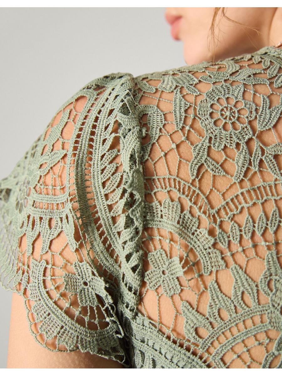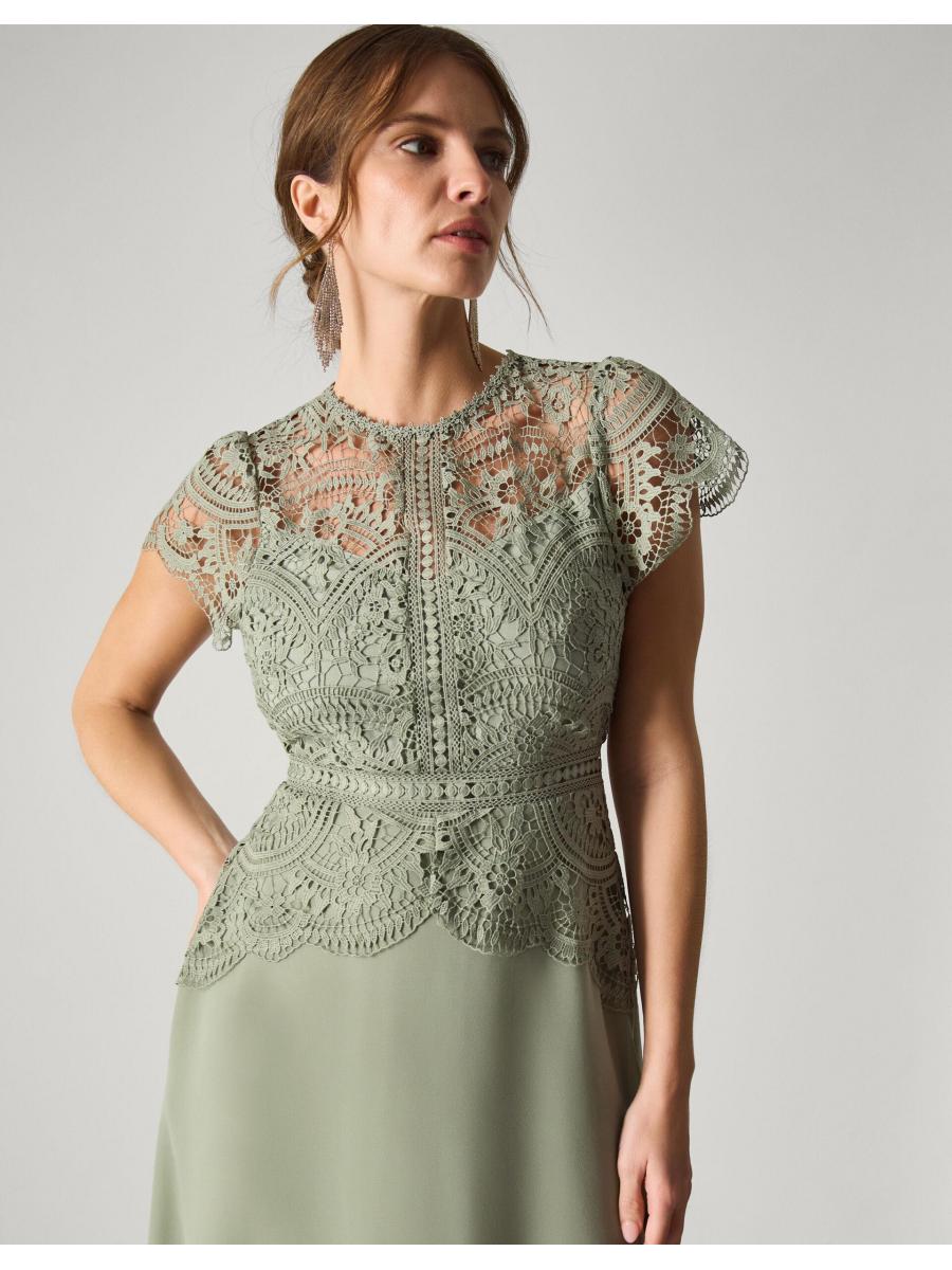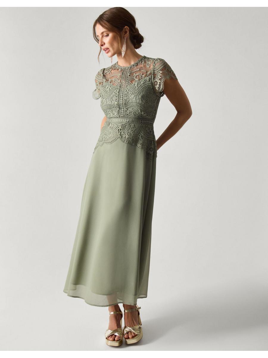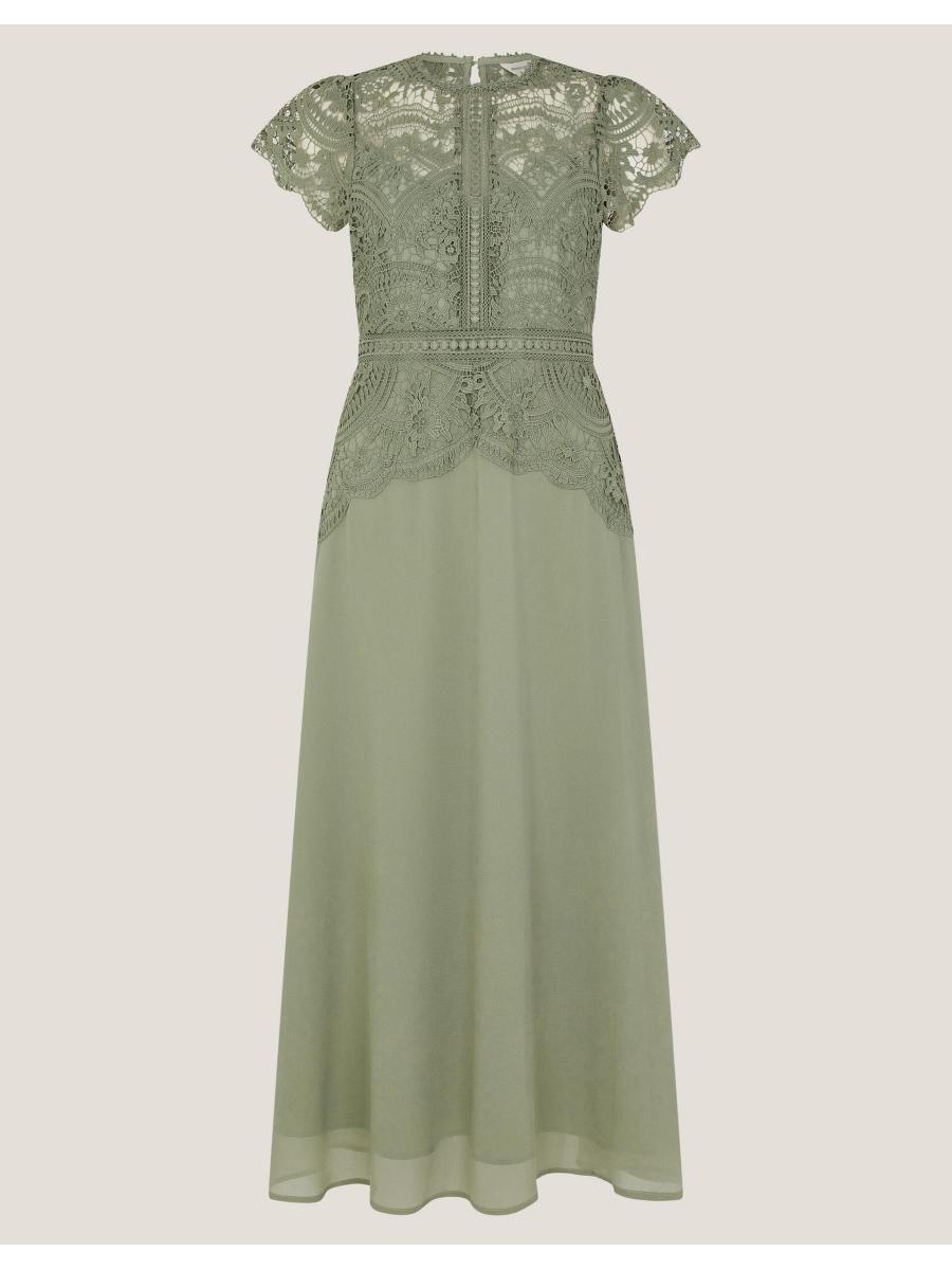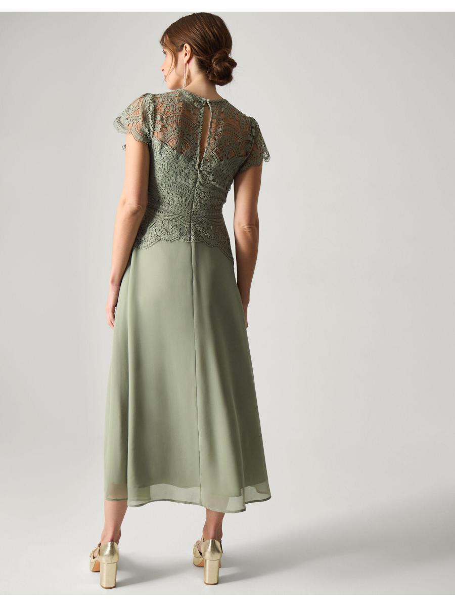 The things you can do with a little bit of lace. The dress that floats down the aisle—and into the reception, find intricate, floral lace that spills over the décolletage and flutter sleeves. We've lined the dress from the sweetheart neckline down, with a defined waist and midi skirt that swishes just the right amount. Fastens with a keyhole button and discreet zip. Green