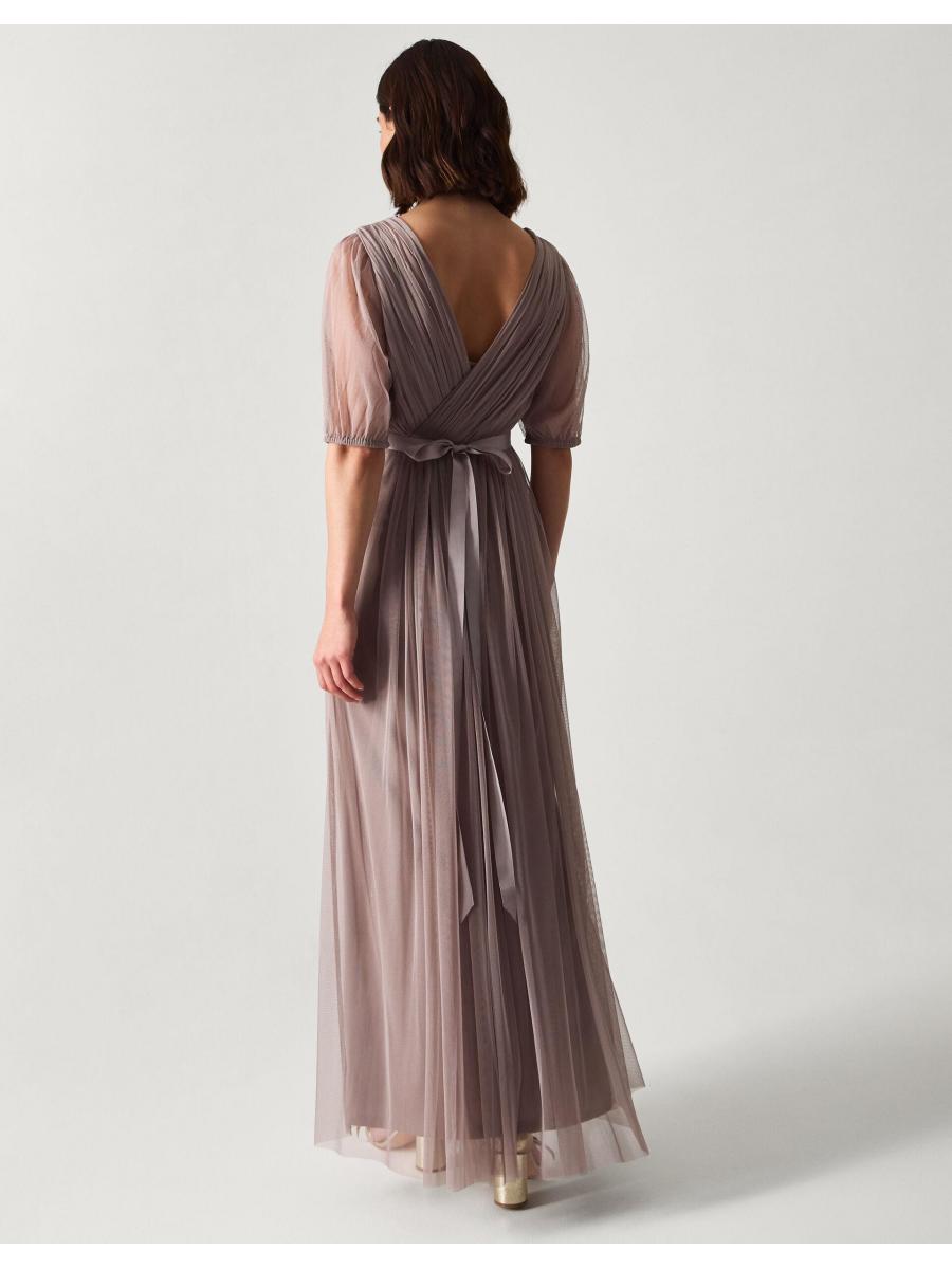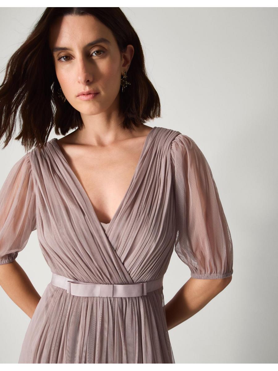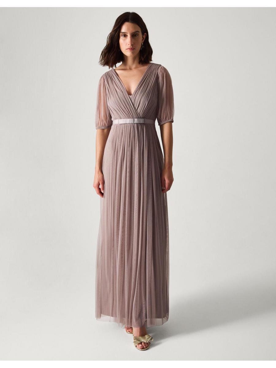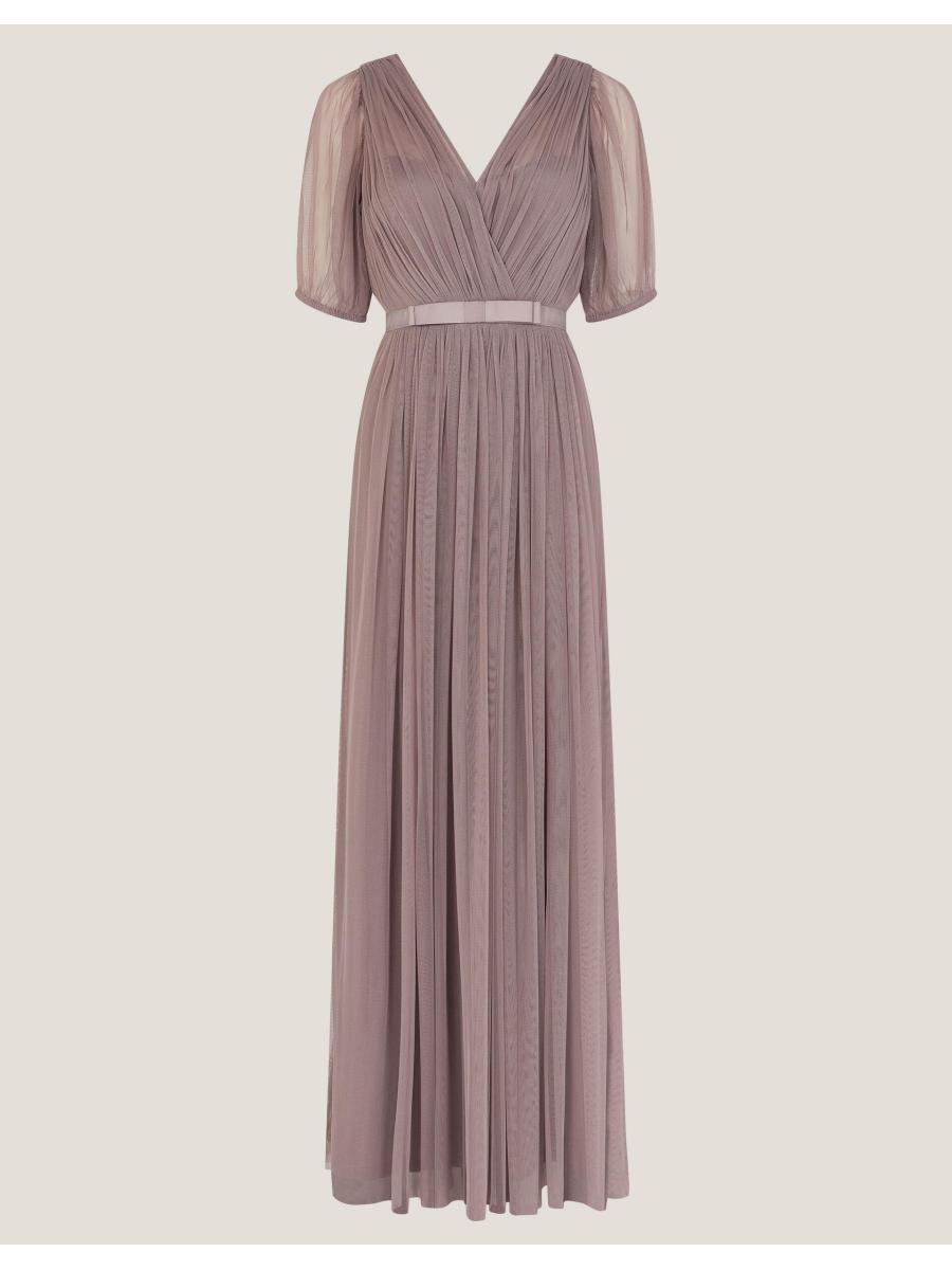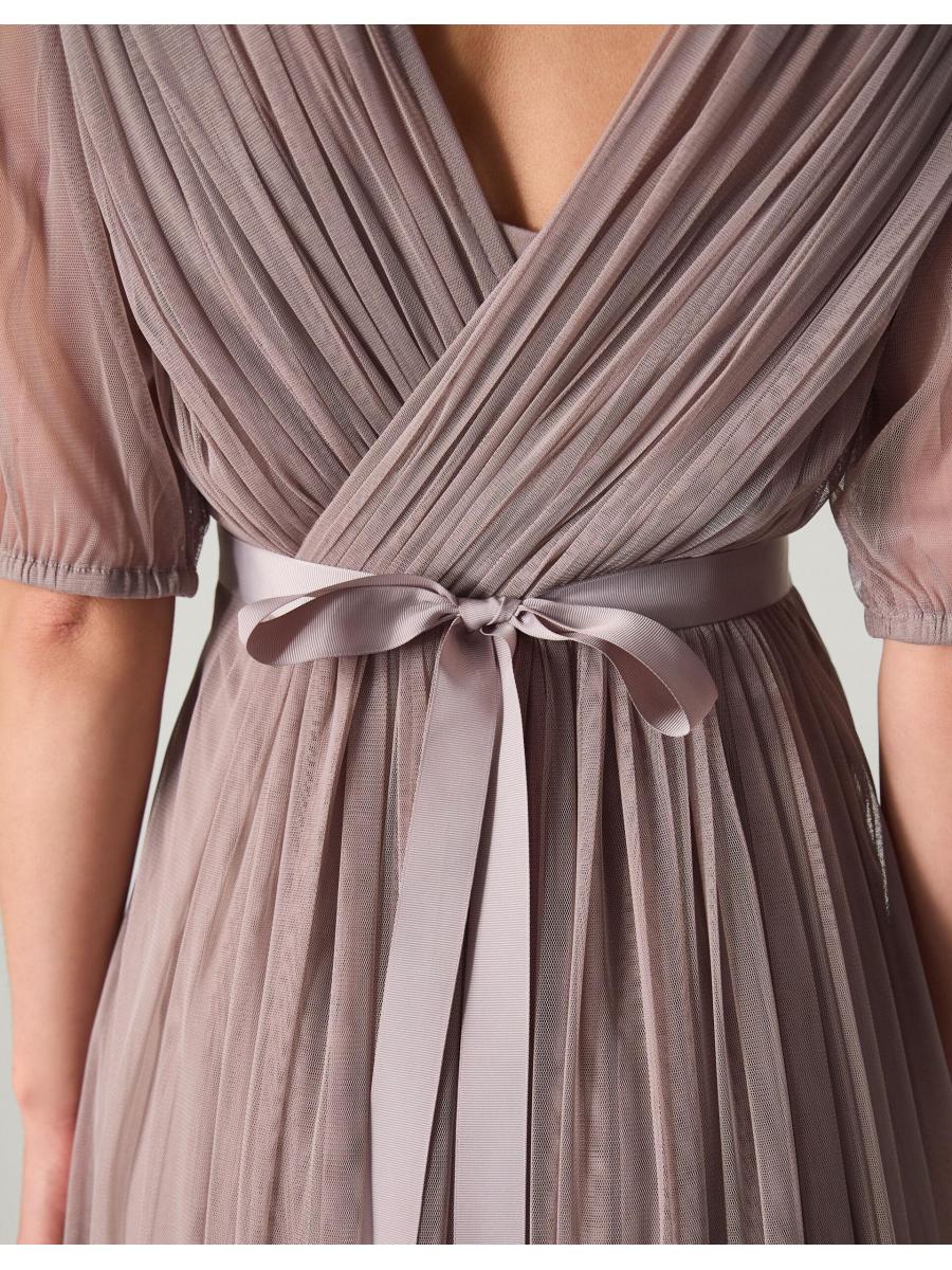 Beaut-tulle-full. An elegant pick for wedding celebrations and any other special occasion, this maxi dress showcases short sheer sleeves, a plunging neckline, and cinched waist with a ribbon bow finish. Complete the look with dainty jewels and sparkling heels to match. Mink