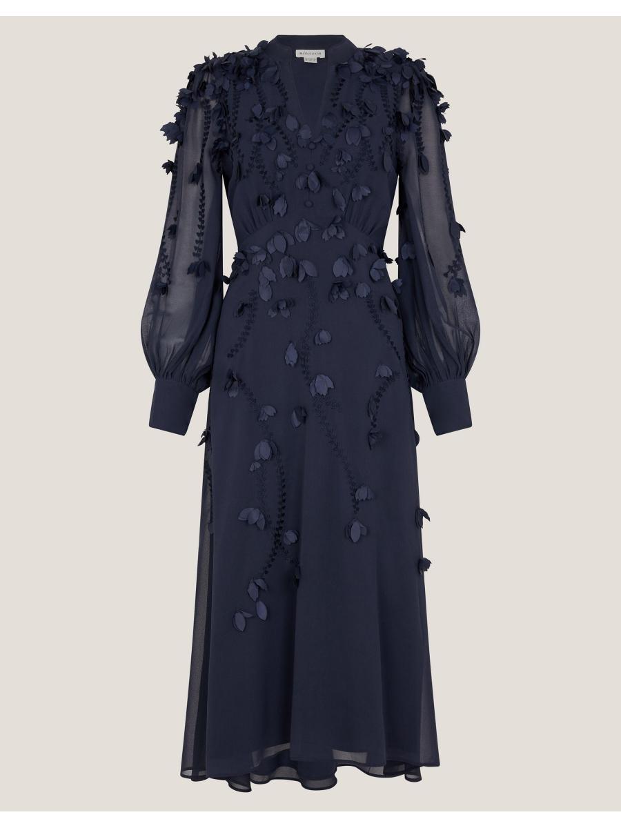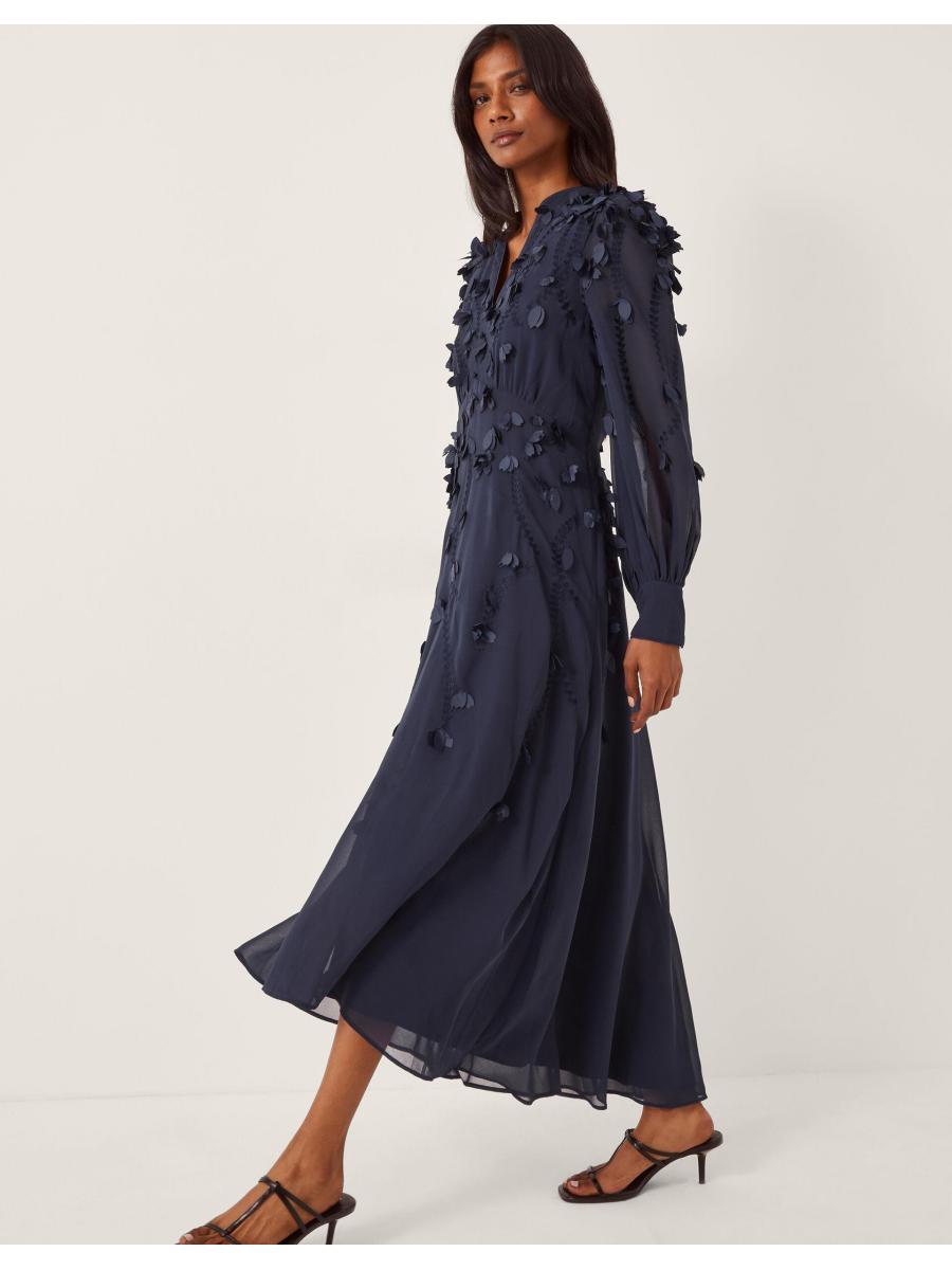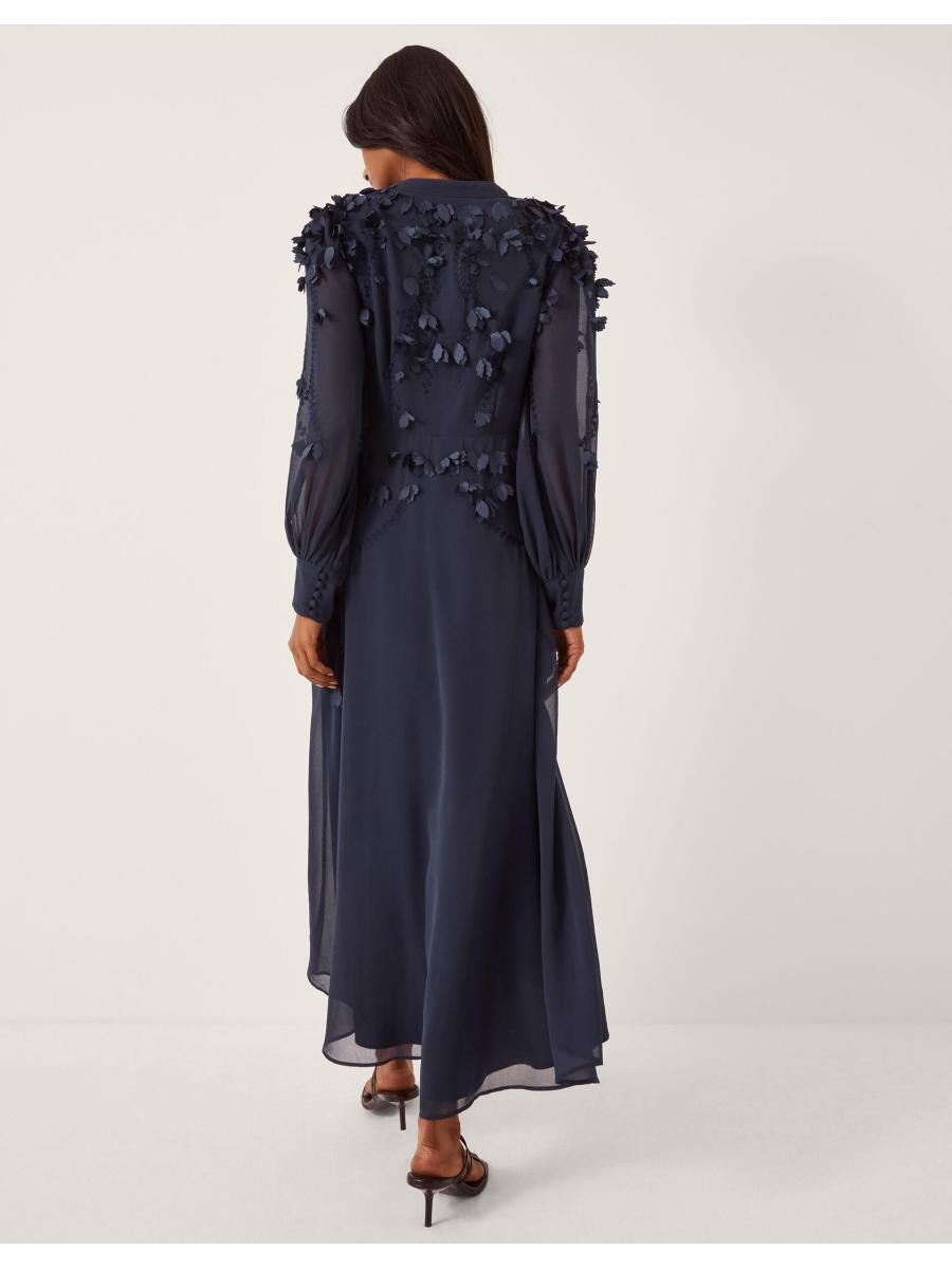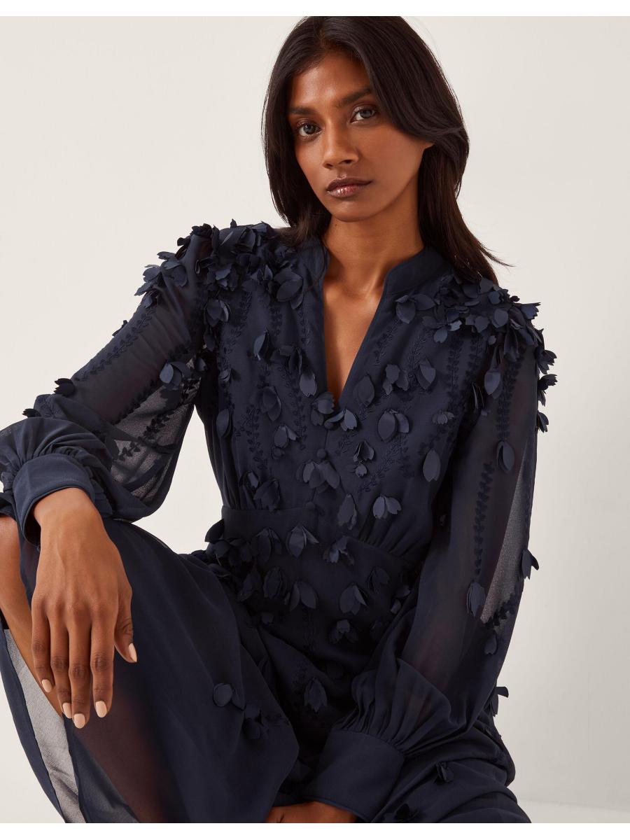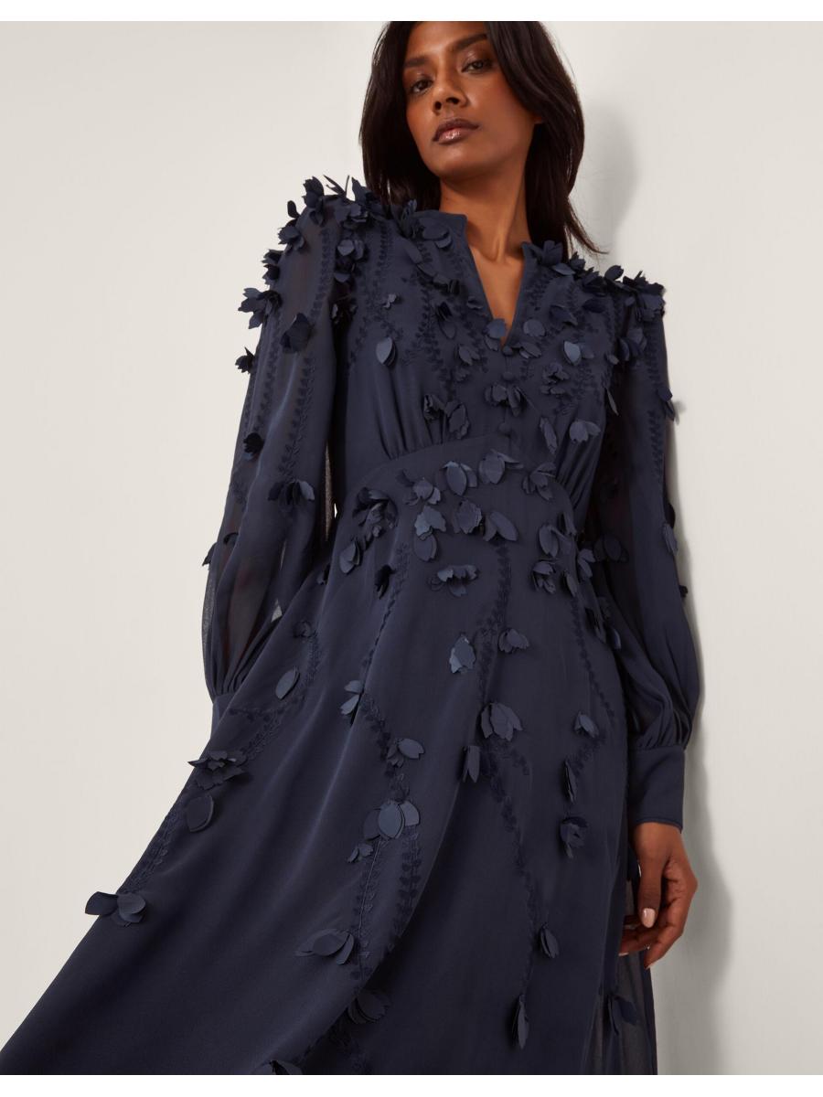 Very detail-orientated. Sewn to steal the show at every function, this dress offers timeless elegance with an elevated twist. The delicate chiffon dances as you move, whilst the embroidered vines and applique leaves offer a unique, tactile finish. And to complete the look? Style simply with dainty jewels and strappy heels. Blue