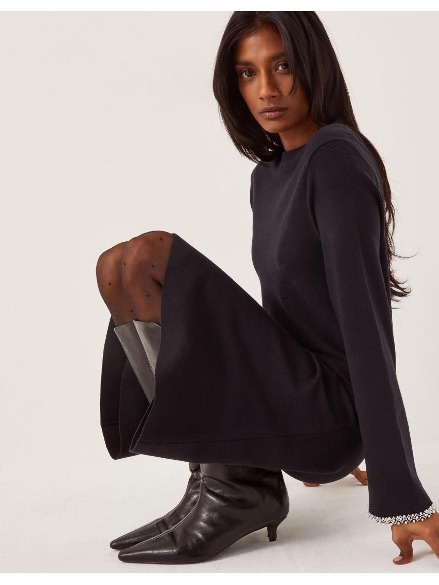 No bracelets needed. Your answer to nights-out in wintertime? Cue the knit dress. Showcasing bead embellishments on the flared cuffs, this midnight blue number is finished with an A-line hem that dances above the knees, leaving room to show off sleek knee-high boots. Blue