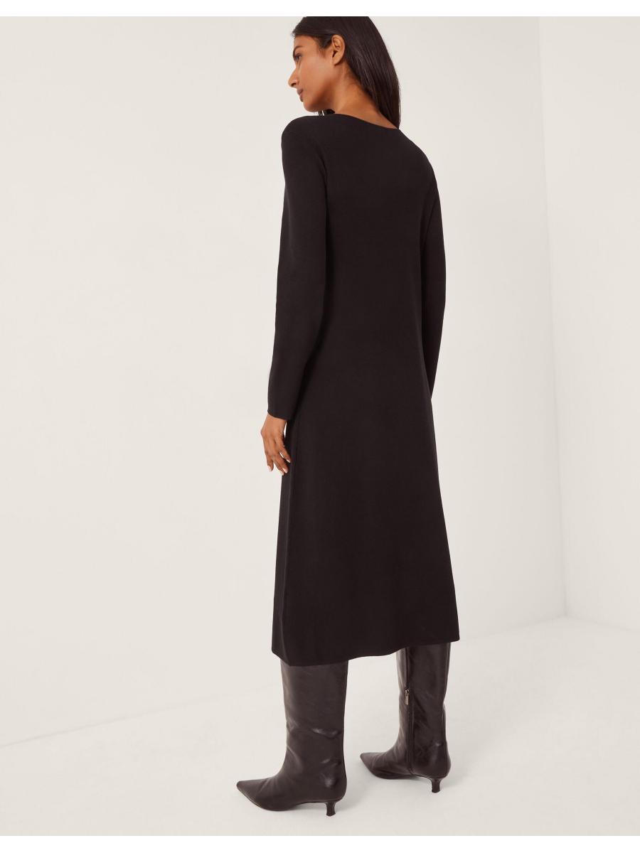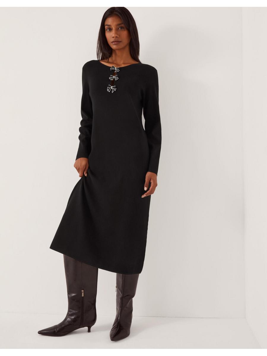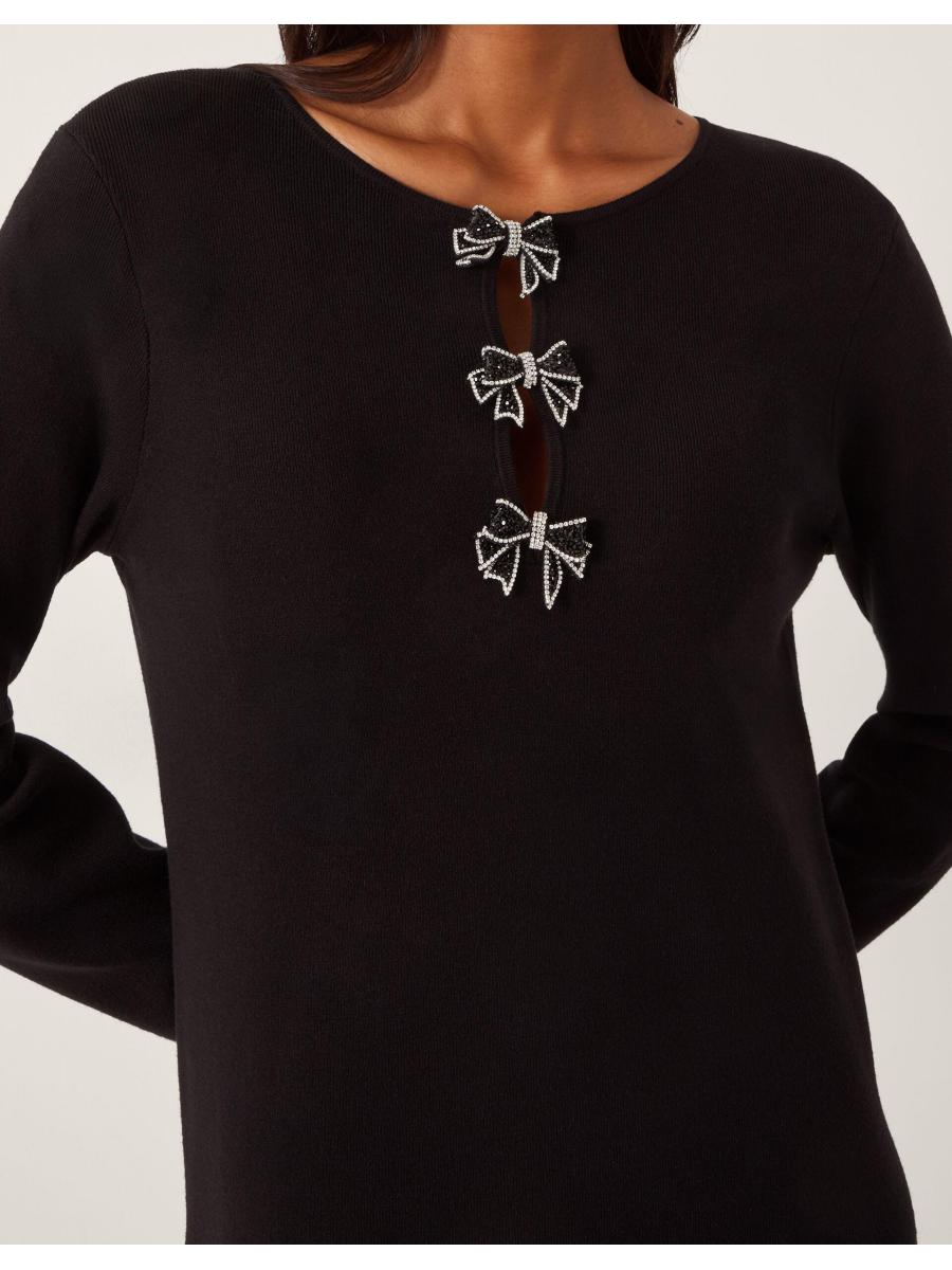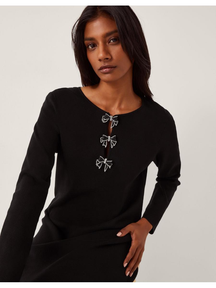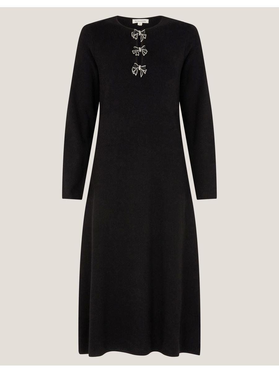 Take a bow! Falling below the knees, this soft knitted dress features a trio of sequin bows. Perfect for any party, it's sure to be received with a round of applause every time. Black