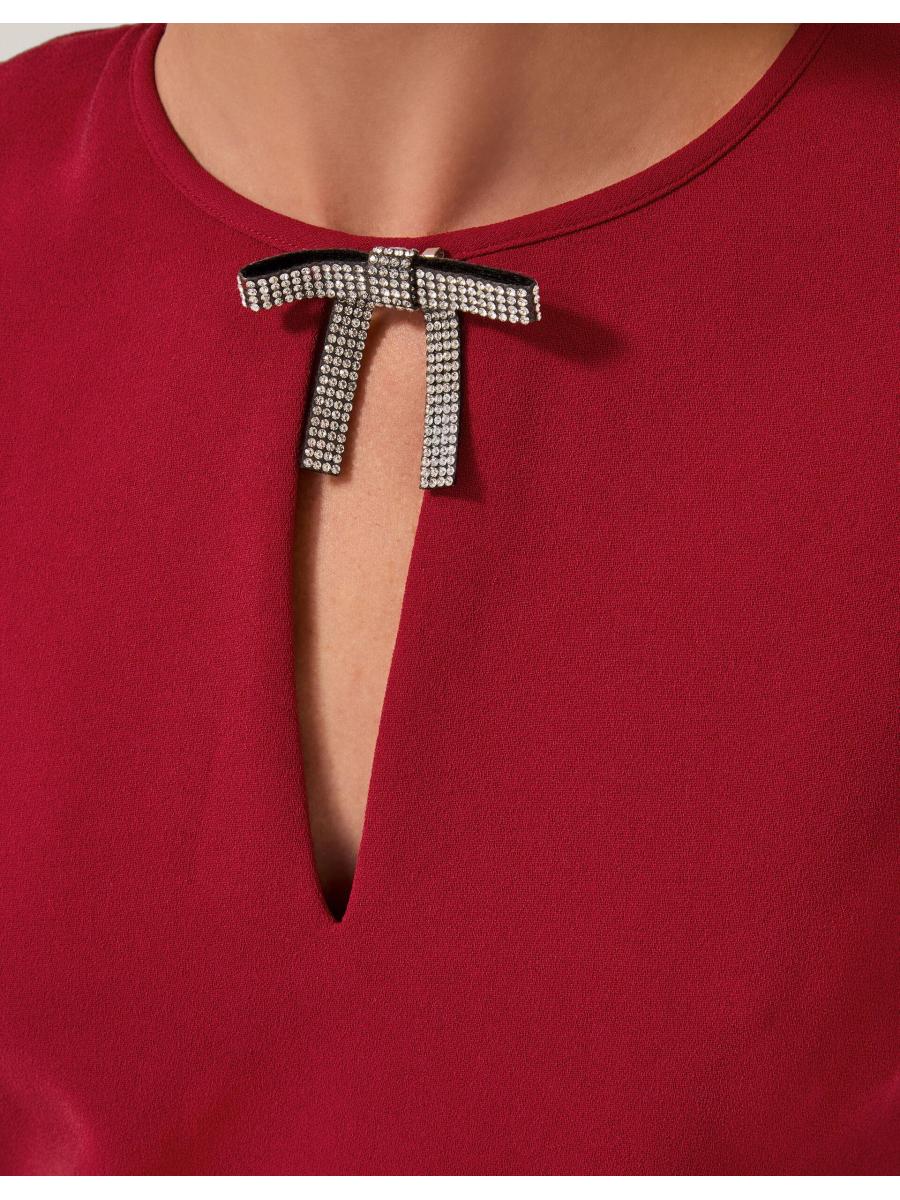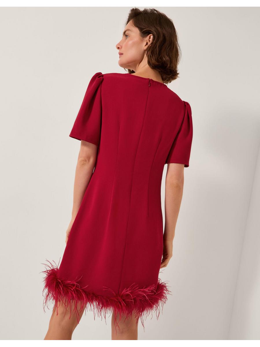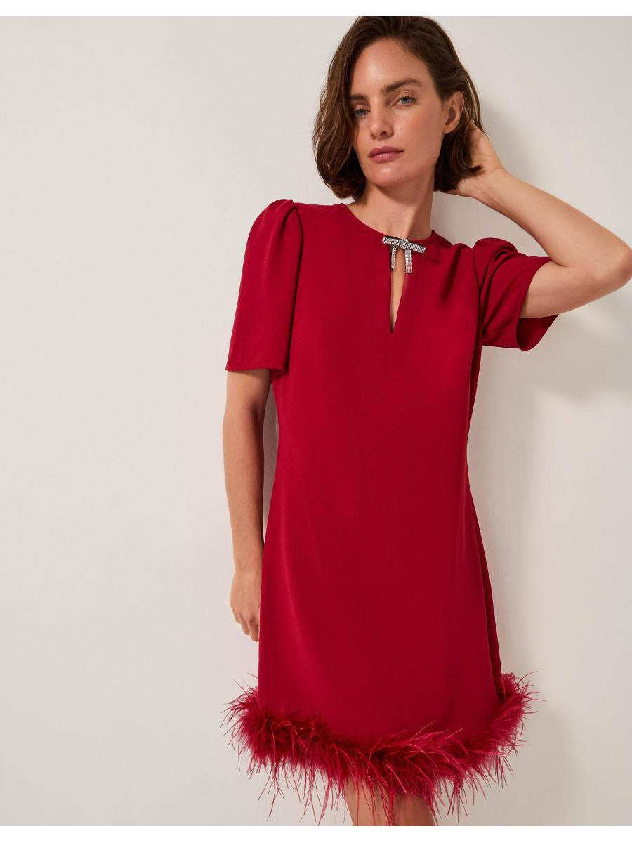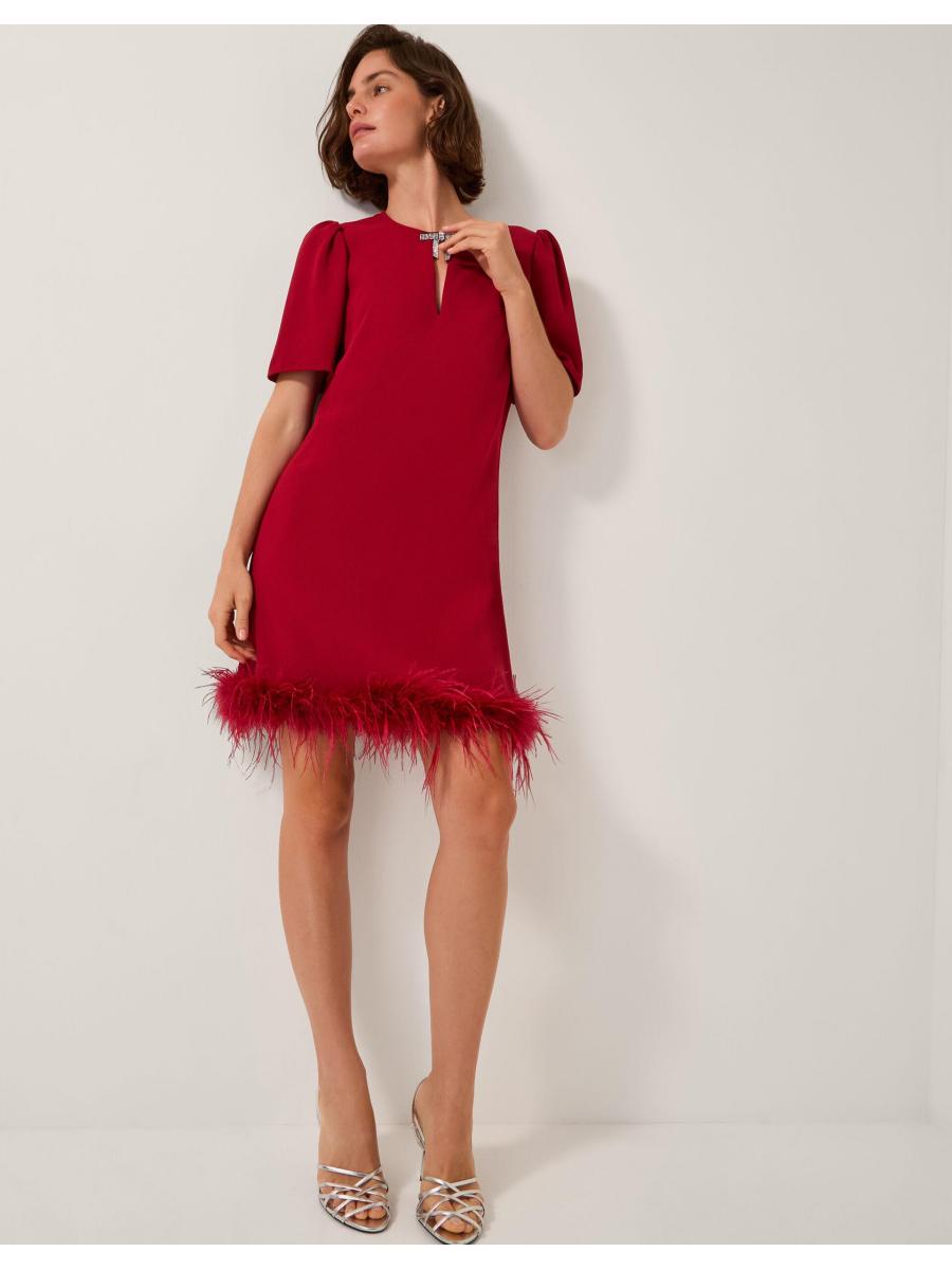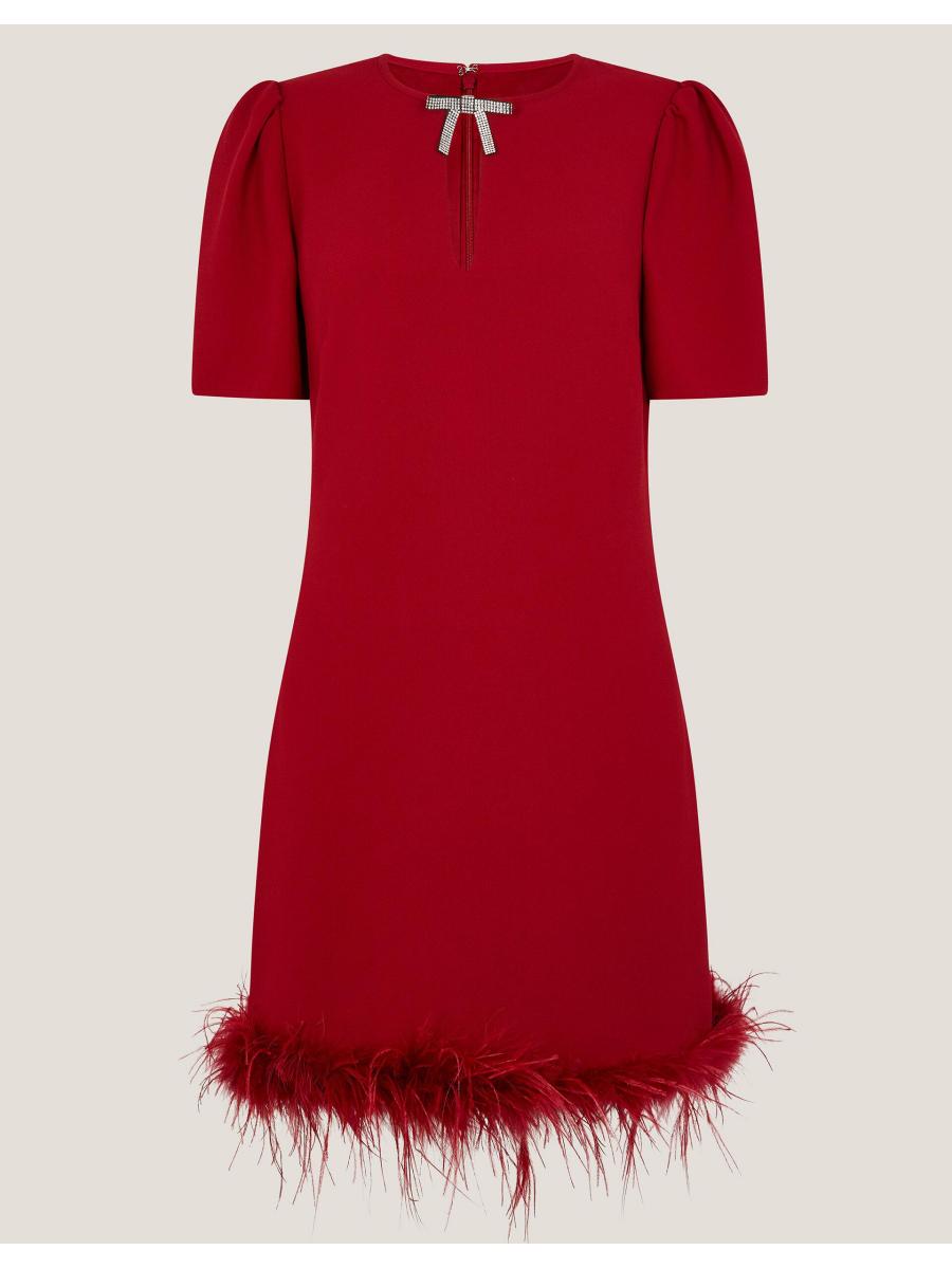 Ruffle some feathers (in style). Designed in luxuriously soft velvet and featuring a mini-length hem with decorative feather detailing, this dress is the ultimate showstopper for festive celebrations. Finished with a sparkly bow at the neckline. Red