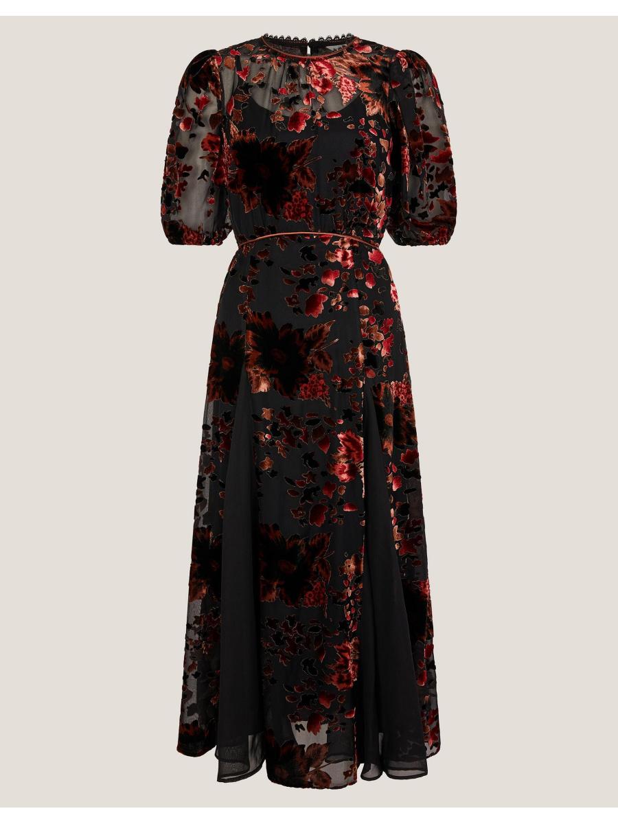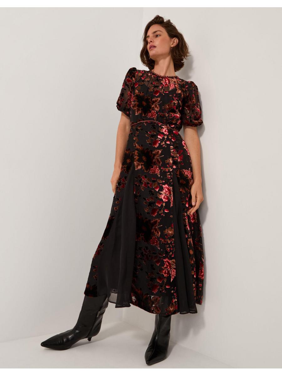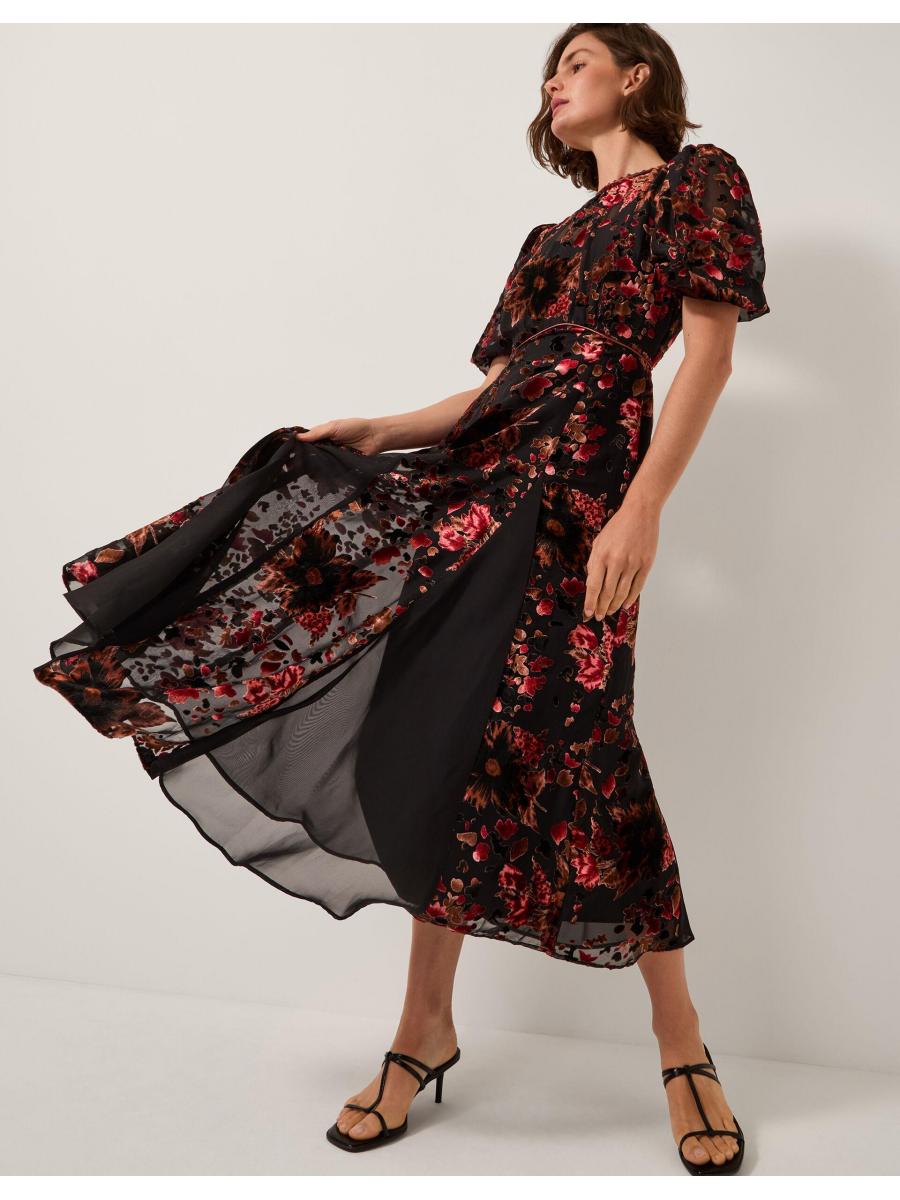 Expect oohs and ahhs. Designed with puff sleeves and splices of black chiffon through the midi hem, this dress showcases decorative devoré reminiscent of autumn leaves. From candlelit dinners to woodland wedding celebrations, it's made for every A/W moment. Black