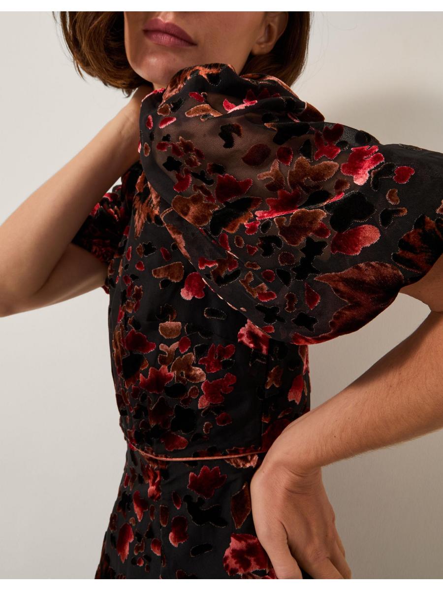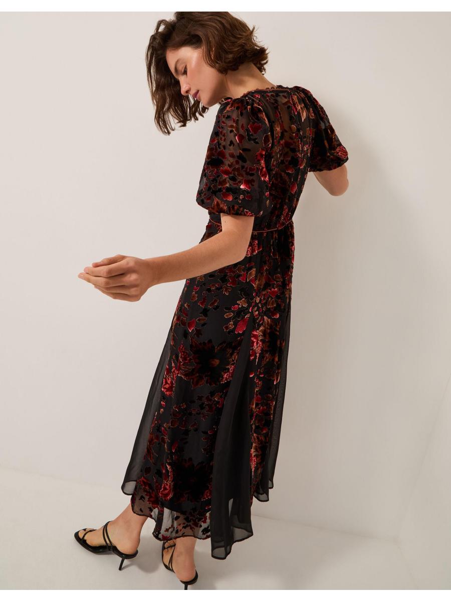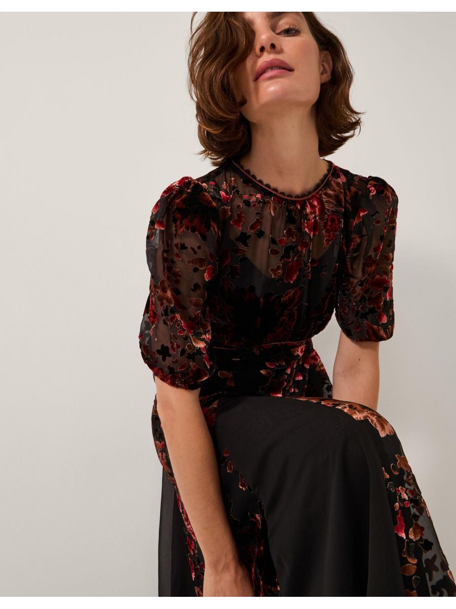 Expect oohs and ahhs. Designed with puff sleeves and splices of black chiffon through the midi hem, this dress showcases decorative devoré reminiscent of autumn leaves. From candlelit dinners to woodland wedding celebrations, it's made for every A/W moment. Black