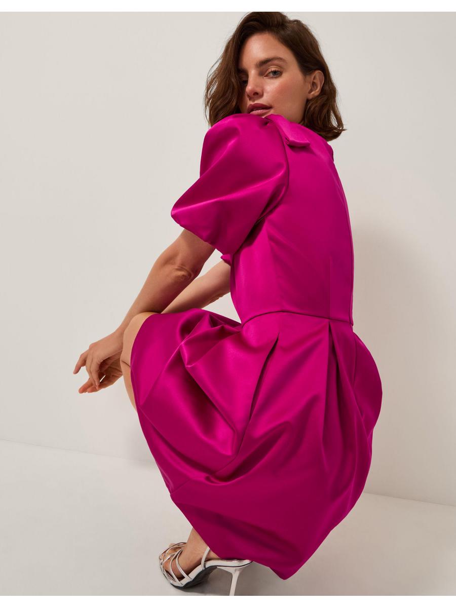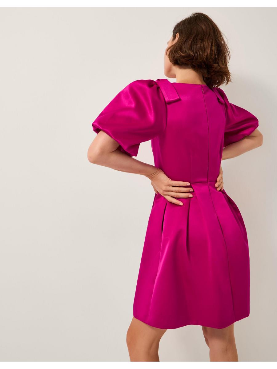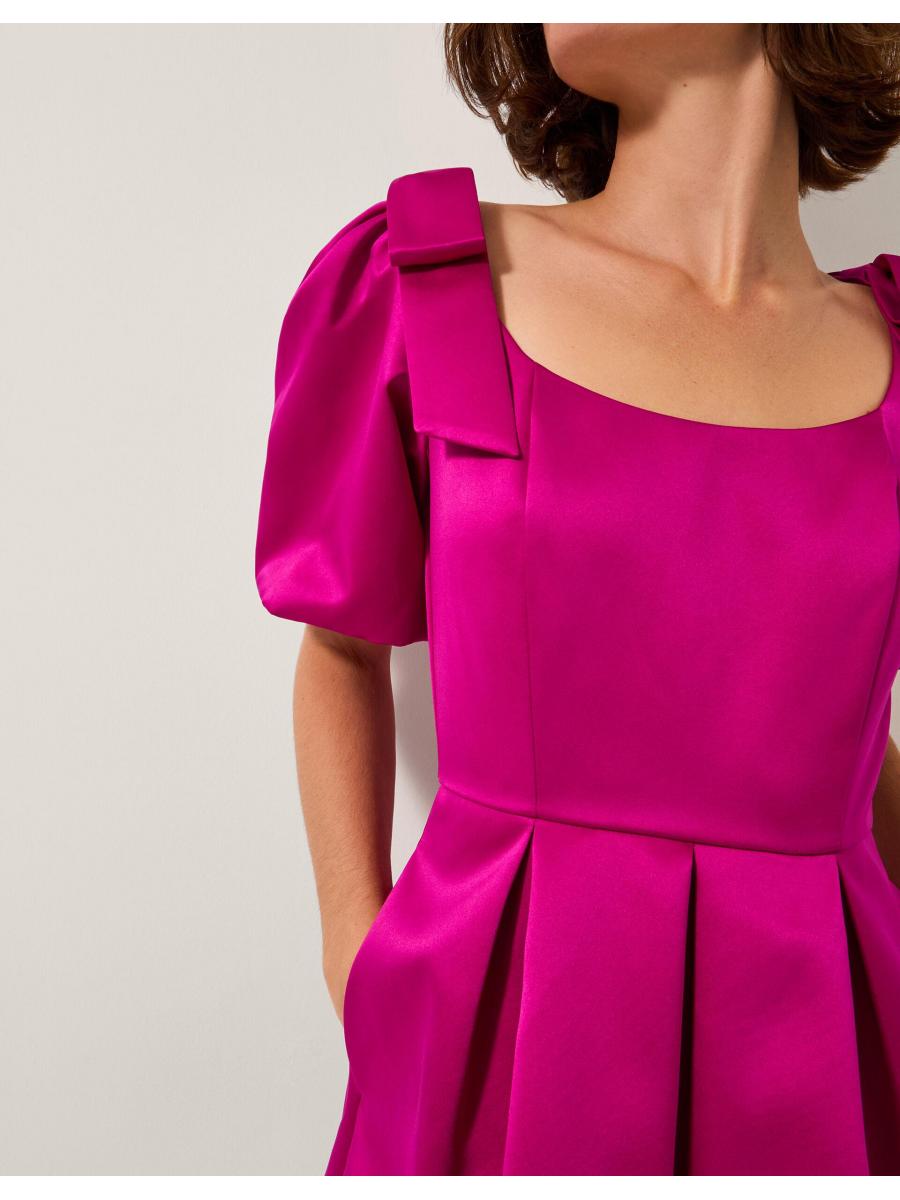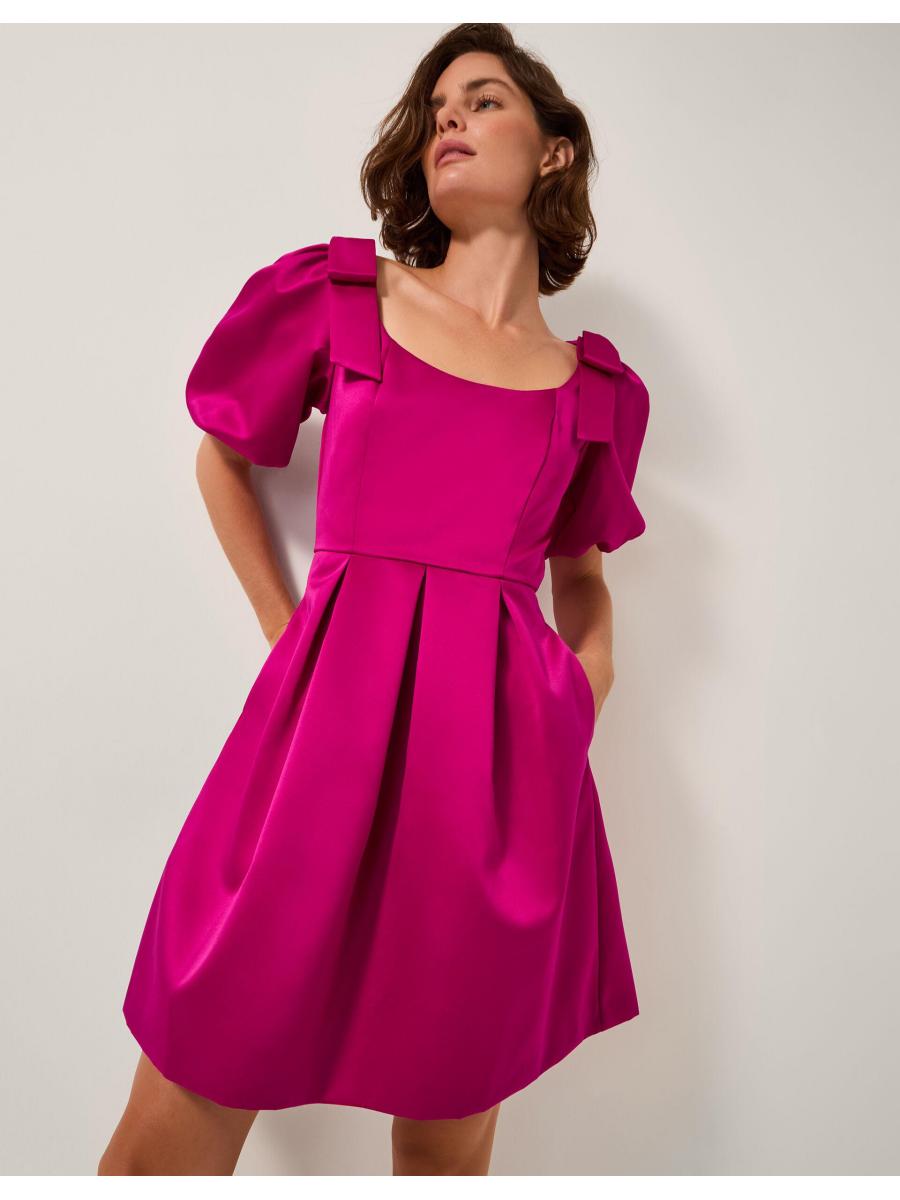 Tens across the board. This satin dress pops like no other with its bow-topped puff sleeves and polished pleats. Whether you're attending an evening soirée or strolling towards dinner reservations, this mini number never misses. Oh, and did we mention? It has pockets. Pink