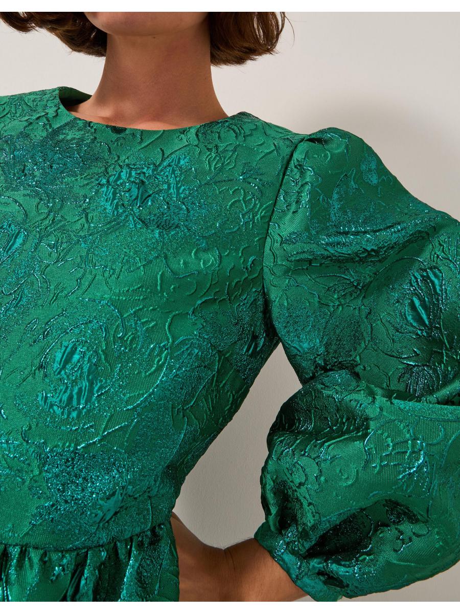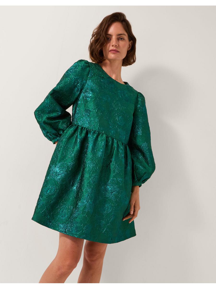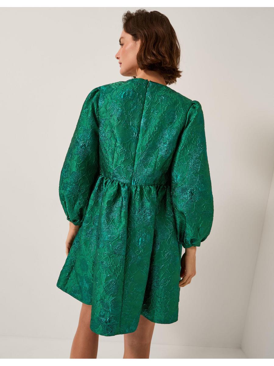 Jac(quard) of all trades. Designed with an ornate print and flouncy long sleeves, this mini dress exudes elegance. Heading out for the first party of the season? This is all you need. Green