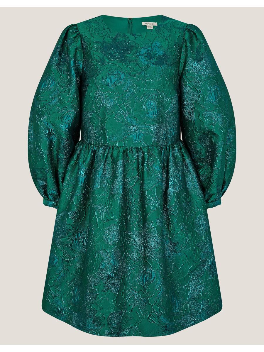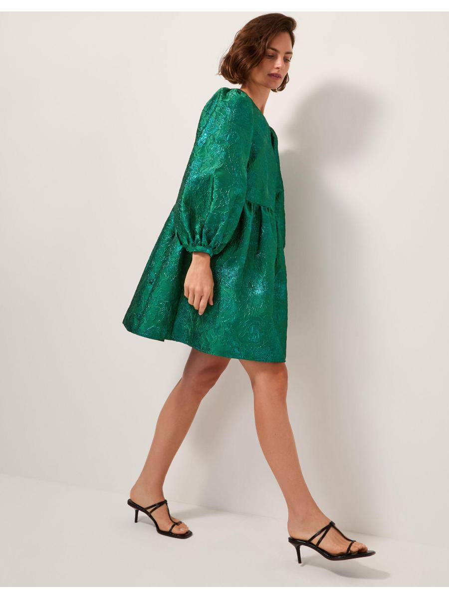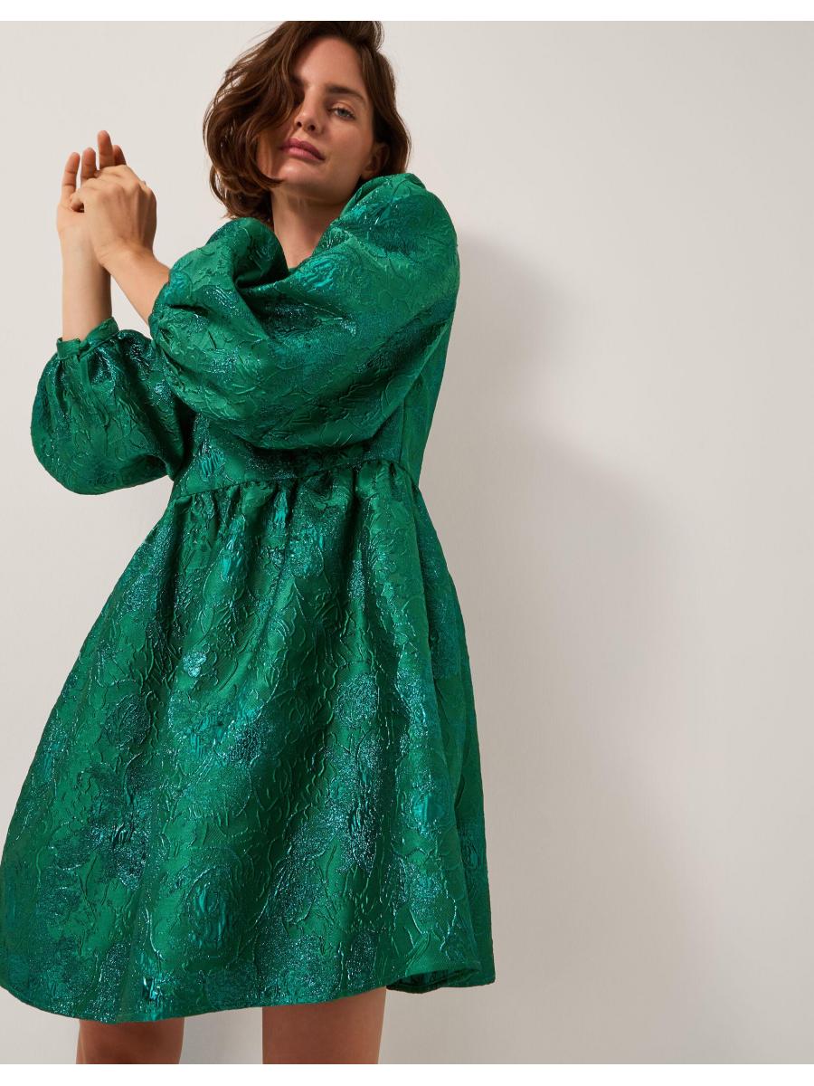 Jac(quard) of all trades. Designed with an ornate print and flouncy long sleeves, this mini dress exudes elegance. Heading out for the first party of the season? This is all you need. Green
