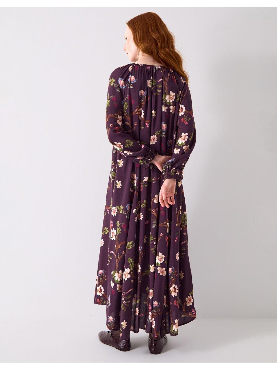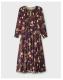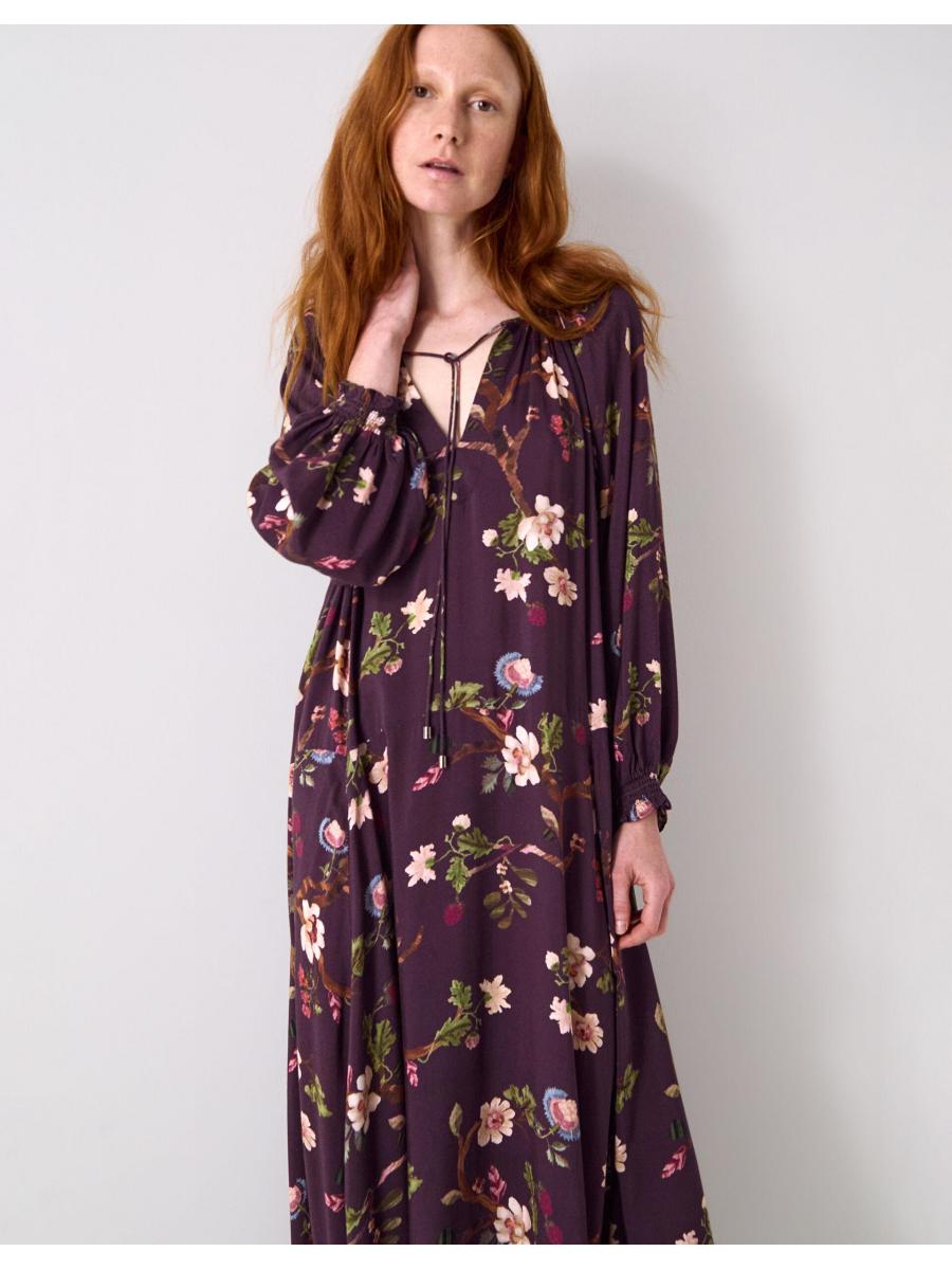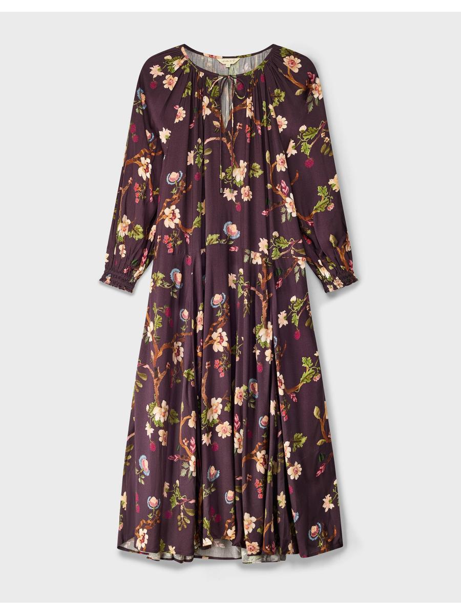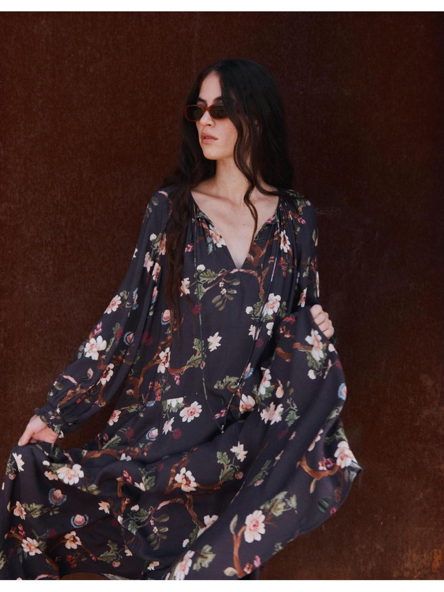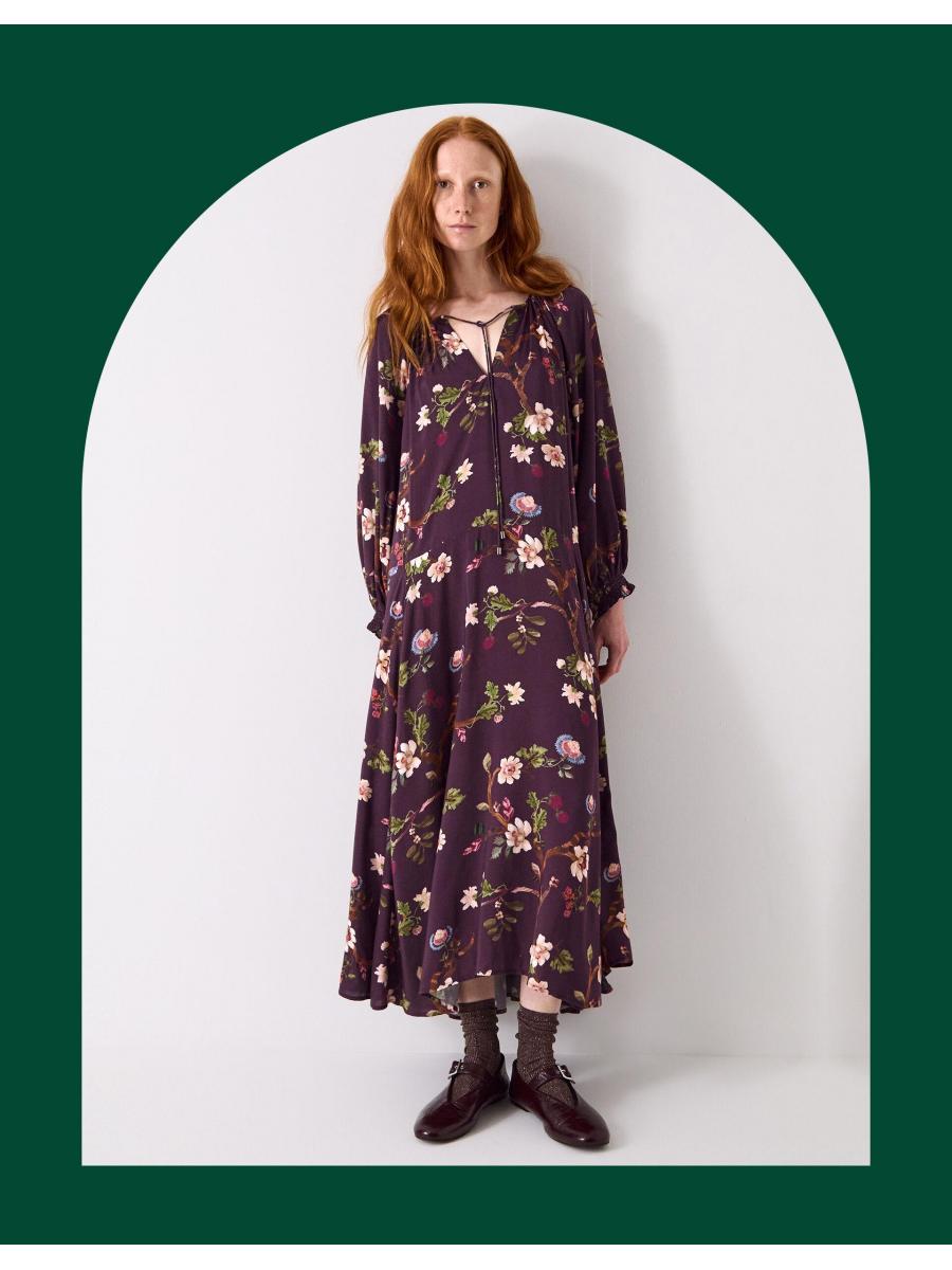 The product: Florals: always in bloom. Showcasing branches of cherry blossoms and decorative buds over the dark cherry backdrop, this dress is a timelessly feminine pick for your year-round wardrobe. Designed with a drawstring neckline and long sleeves, the relaxed midi length hem offers a laidback finish, perfect for dressing up or styling casually.