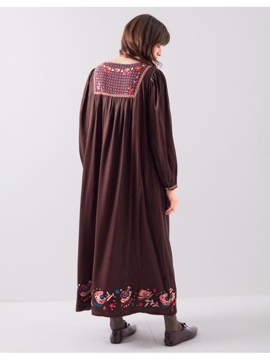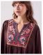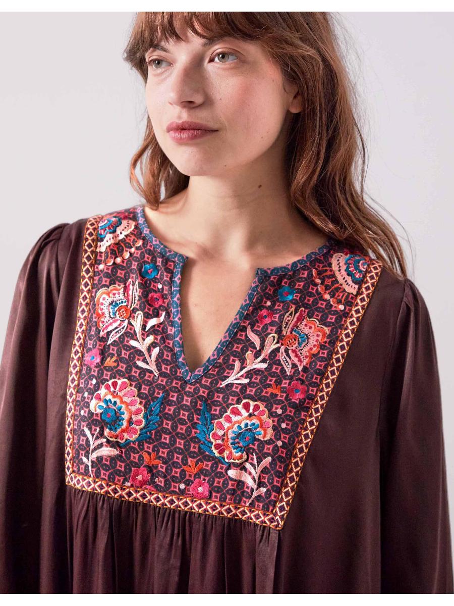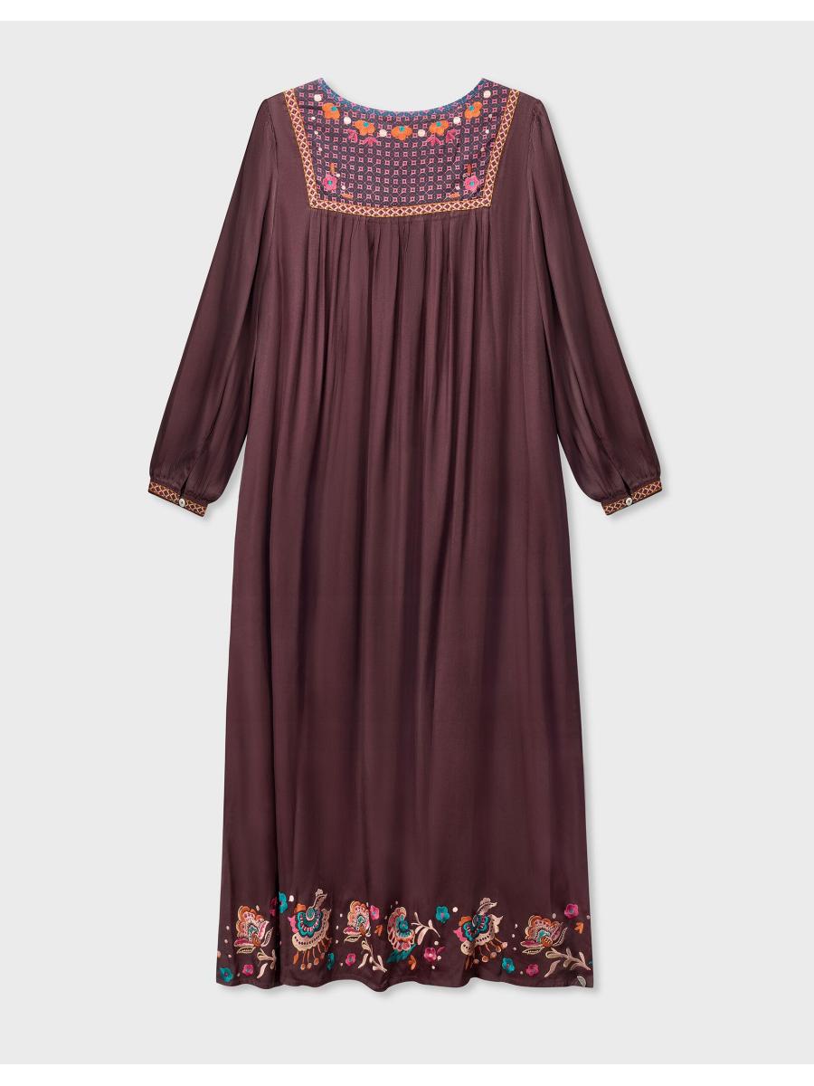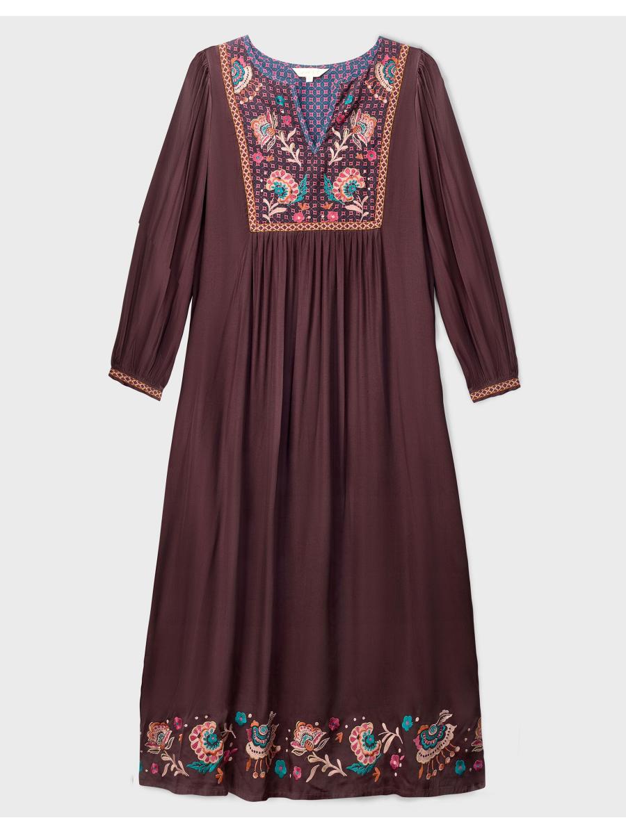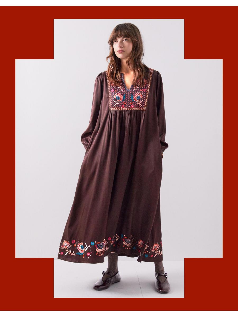 The product: Warning: Will cause compliments. Soaked in a shade that *screams* Autumn, this midi dress is waiting to be worn all season long. Decorated with vibrant floral embroidery and geometric motifs at the bib and hem, the relaxed, laidback silhouette makes it a top choice for day and night styling.
