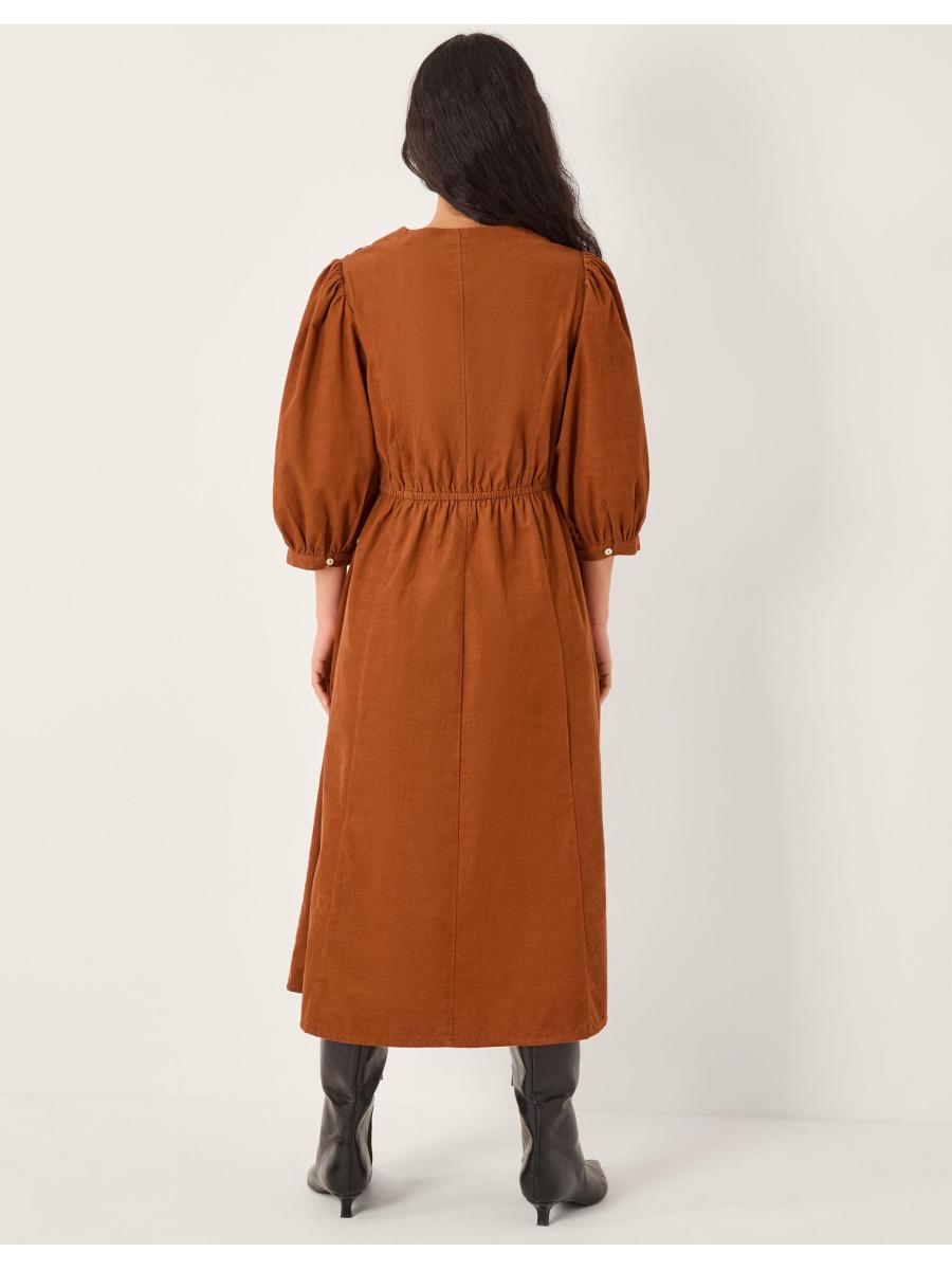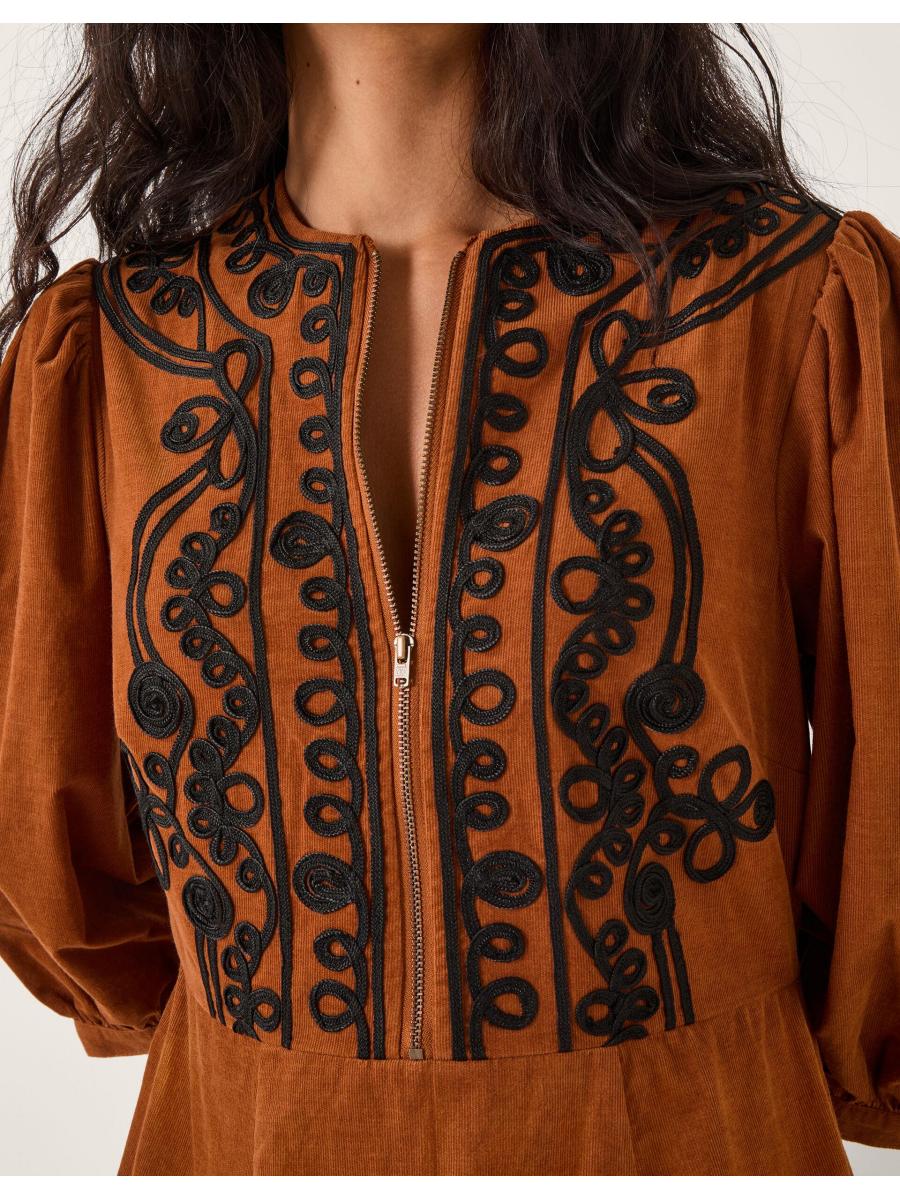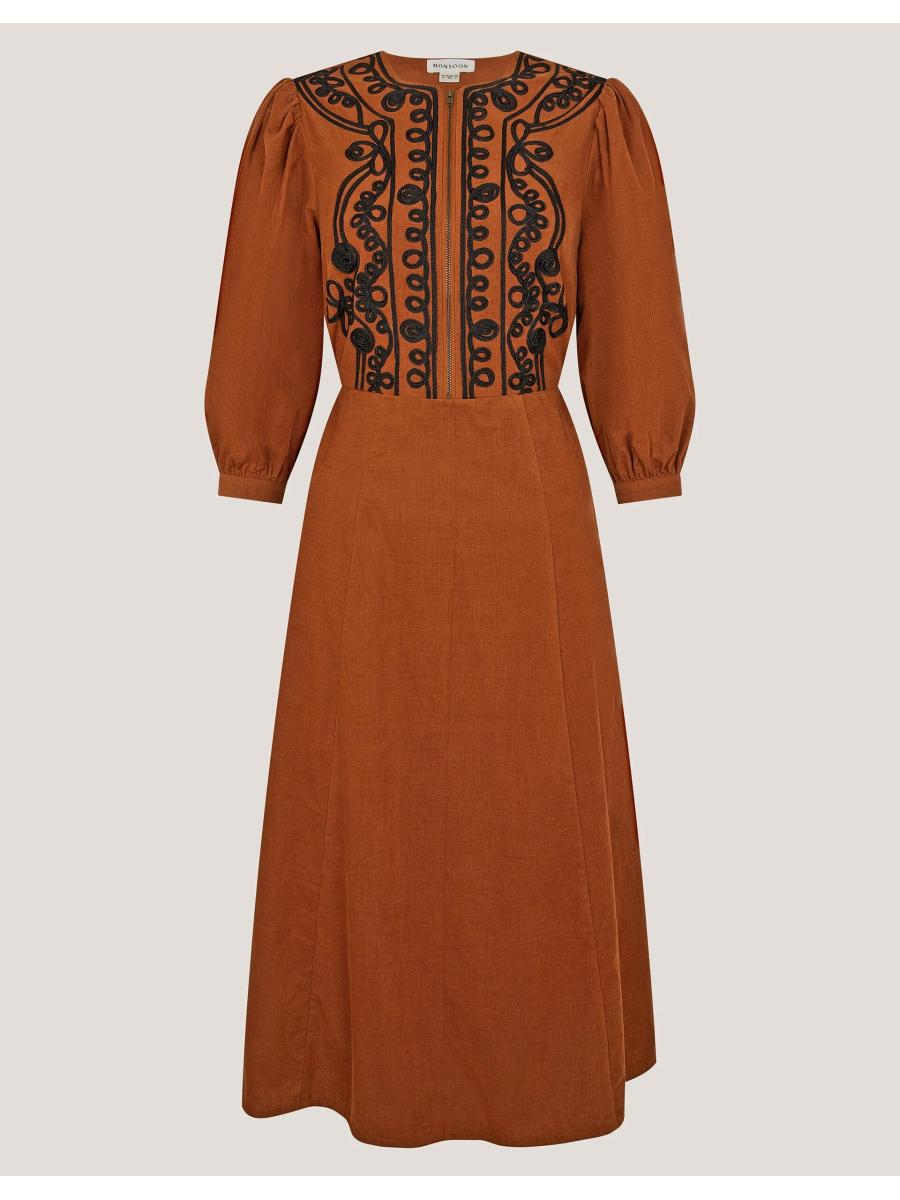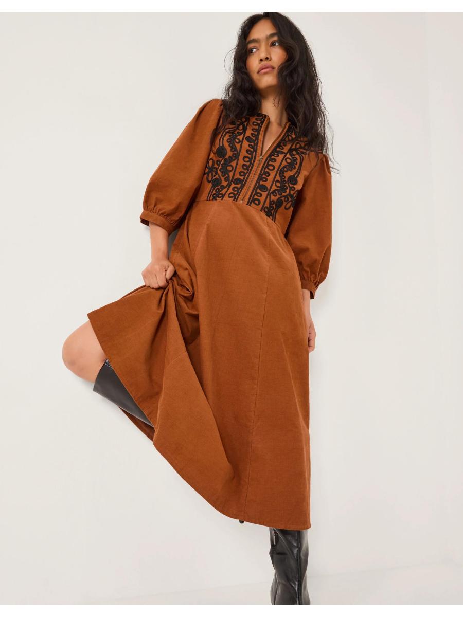 The pick of the season. Boldly embroidered with a swirly design on timeless corduroy, this midi dress brings a breath of fresh air to your autumn wardrobe. Whether you're heading into work for a meeting or catching up over coffee, style it with boots and be on your way! Copper