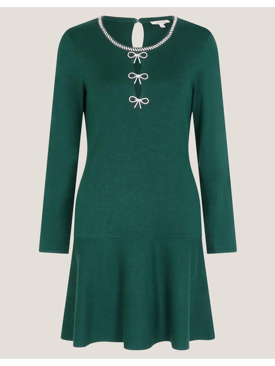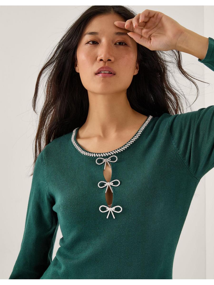 Take a bow! Your search for the perfect festive 'fit has ended. Embellished with a diamanté neckline and trio of glittery bows, this mini dress screams champagne-sipping and belly laughter. Designed with a drop waistband, it styles well with sheer tights and knee-high boots. Teal
