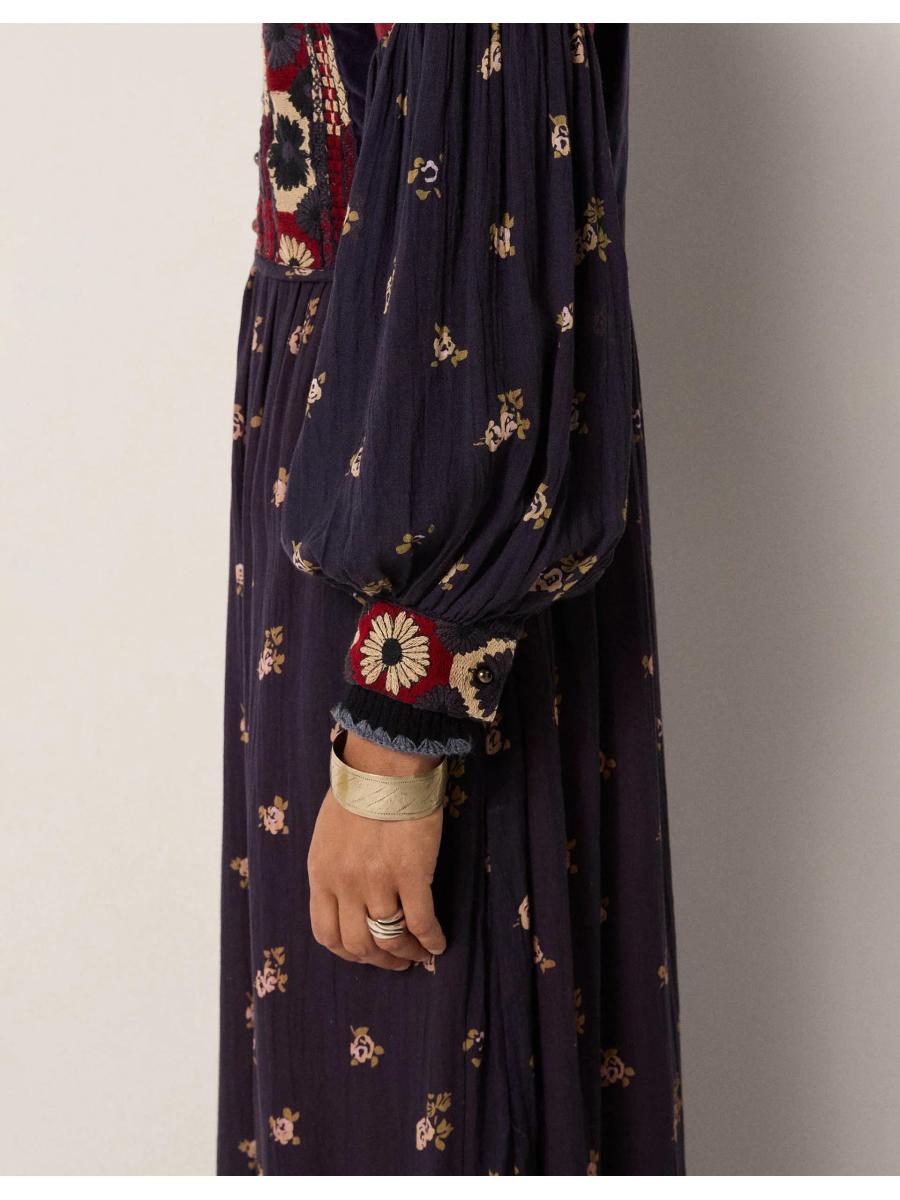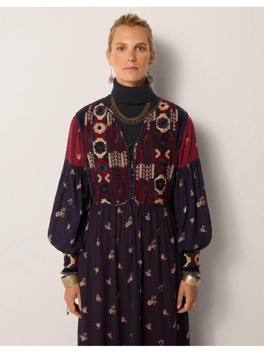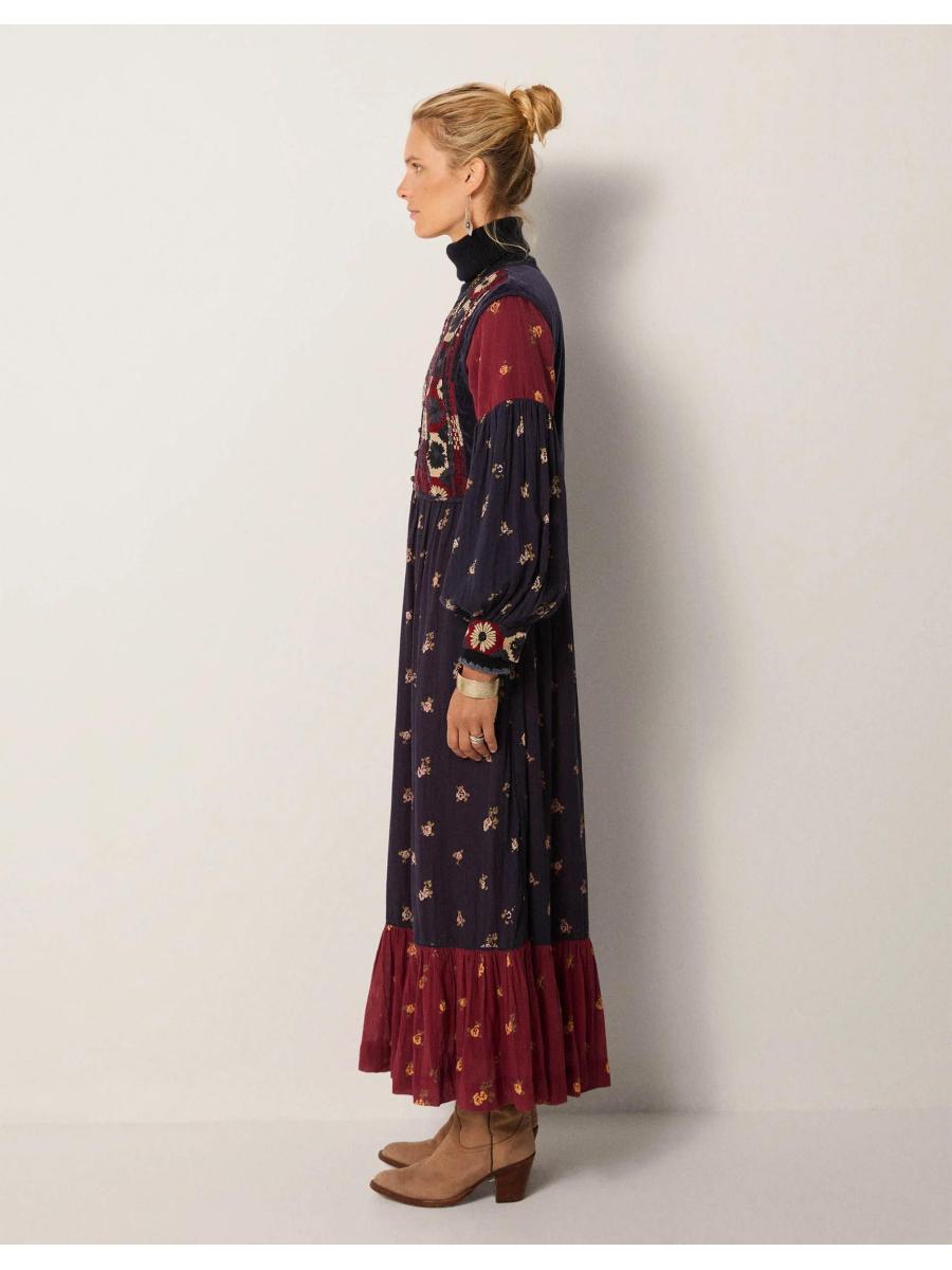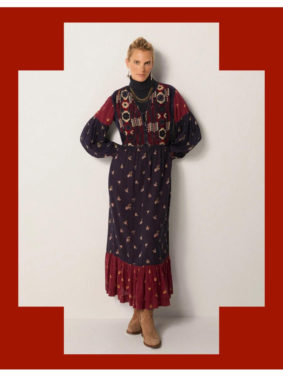 The product: Oh, she's versatile. Whether worn above sandals in summer time, or styled over a turtleneck with chunky boots when the air turns crisp, this dress is a statement pick you can show off in every season. Alive with geometric embroidery at the bodice, it's finished with ditsy floral motifs over the navy blue and deep rouge backdrops.