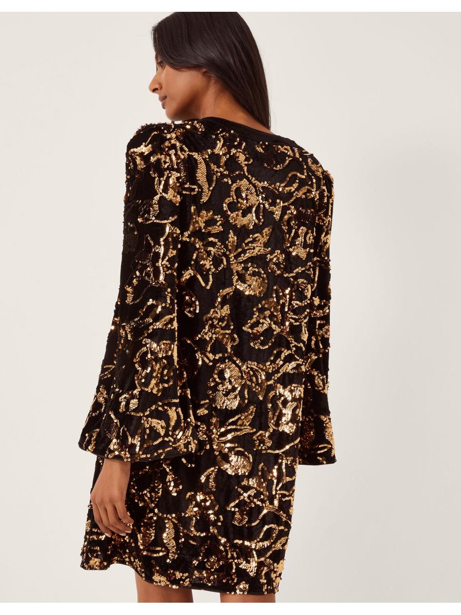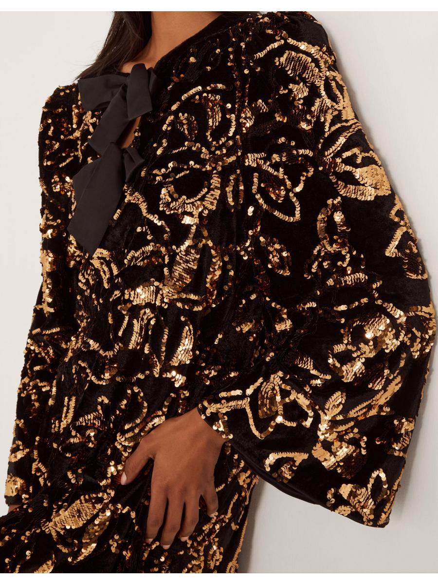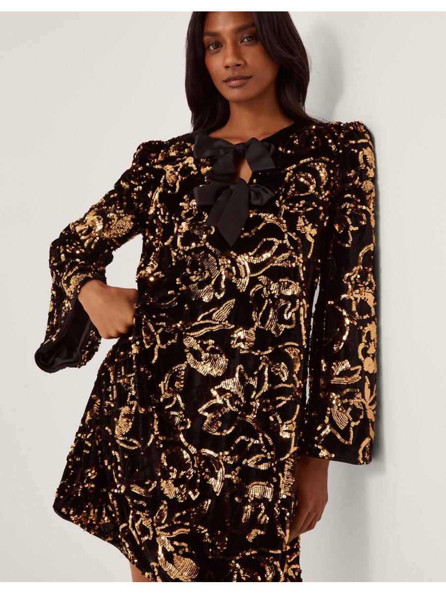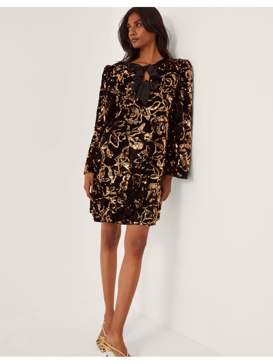 Warning: will cause serious outfit envy. Your collection of LBD's deserves a dazzling upgrade. Embellished with golden sequins that endlessly sparkle as they catch the light, this tunic-style mini is finished with a duo of black satin bows through the front. You've got the dress, now when's the party? Black