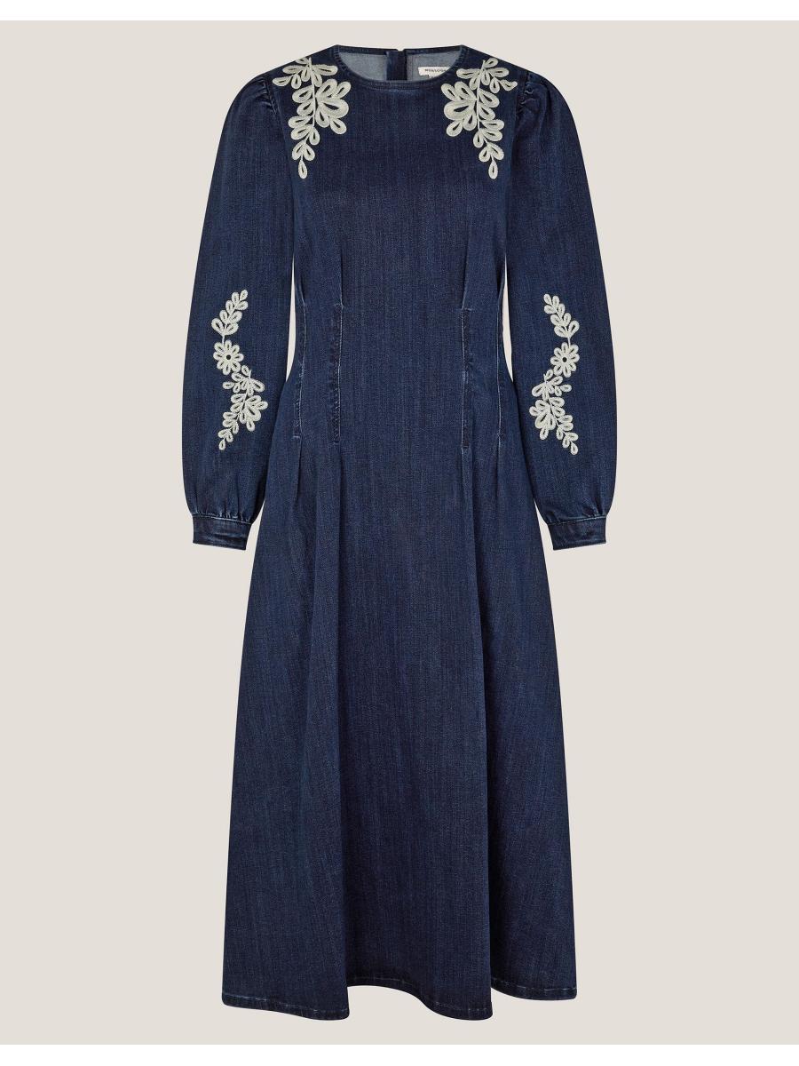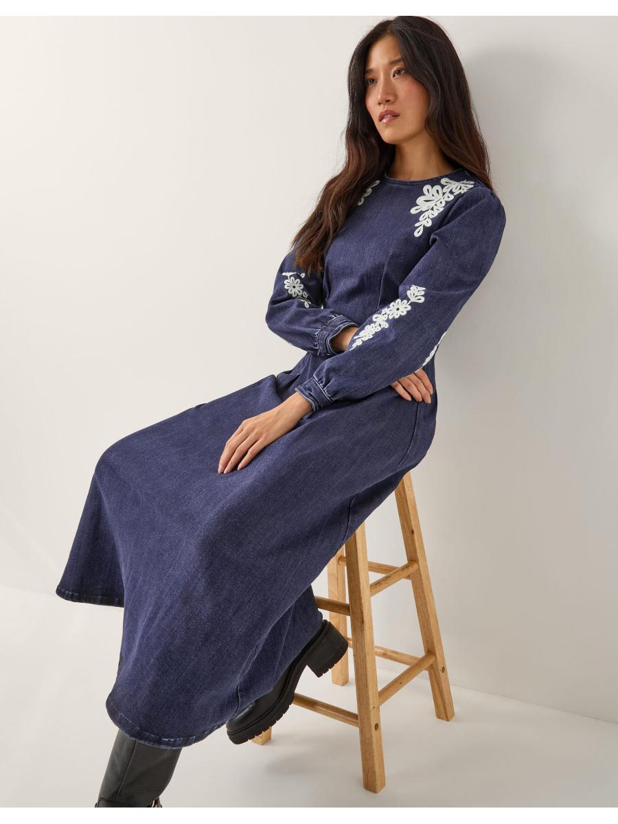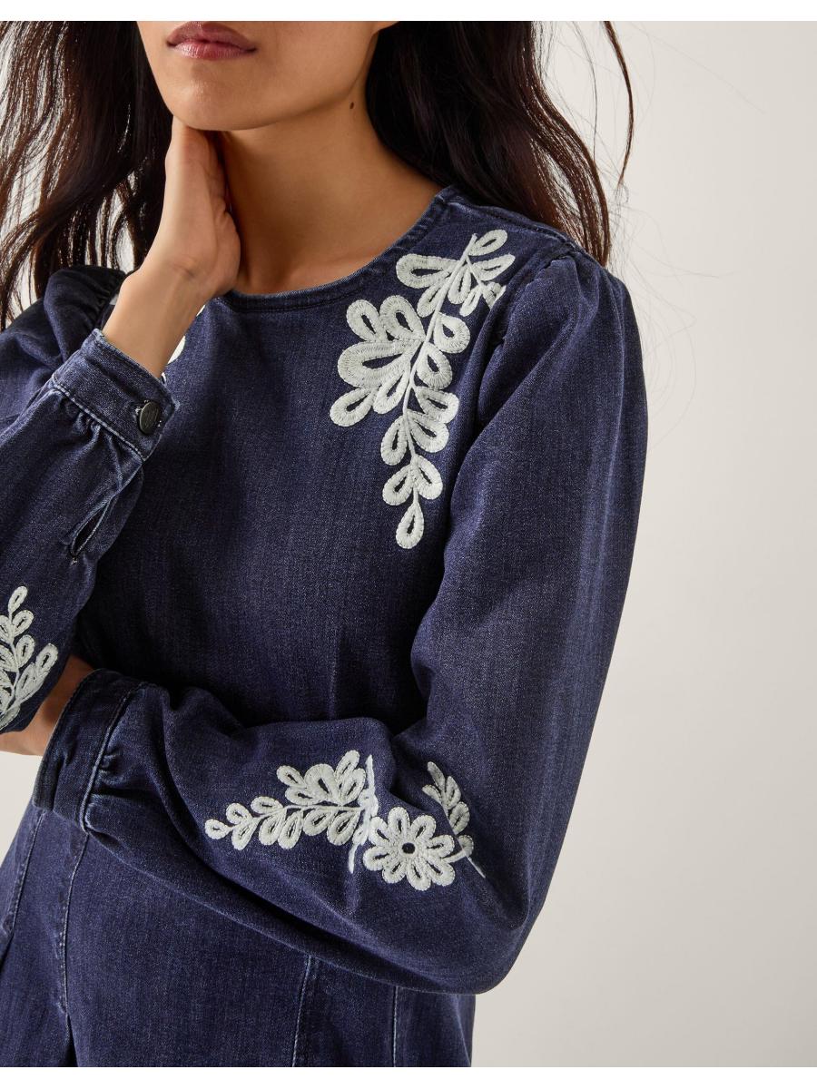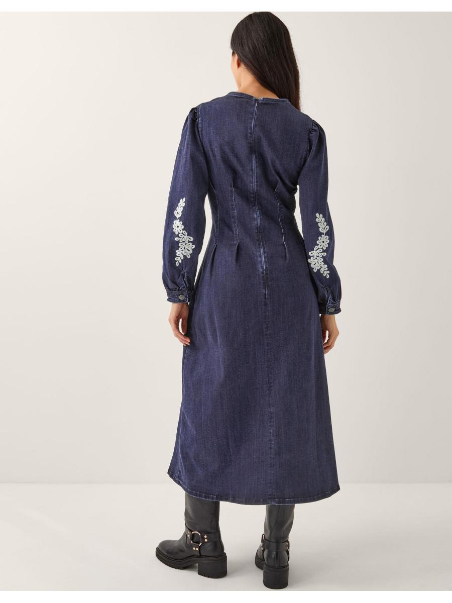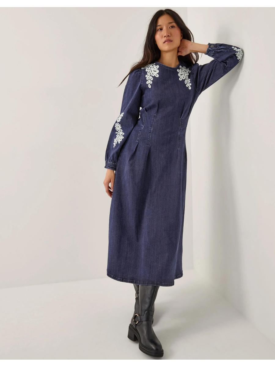 Denim, but different. Refresh your weekly rotation with this midi denim dress. Designed with standout embroidered florals and a slightly cinched bodice, it's a classic piece for in-office days, evening plans and everything in between. Finished with buttoned sleeve cuffs. Blue