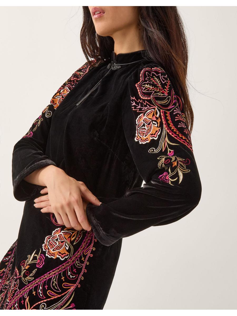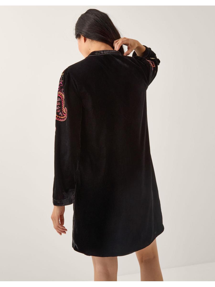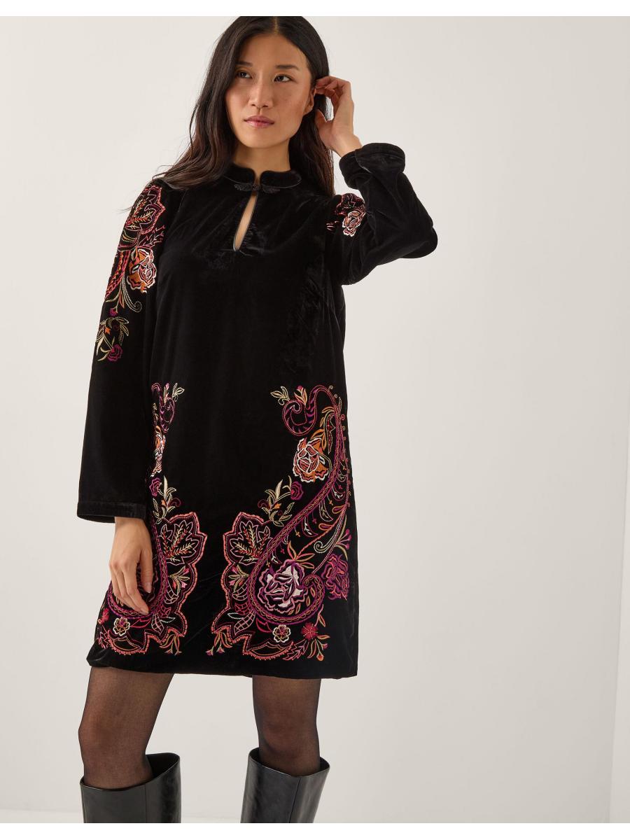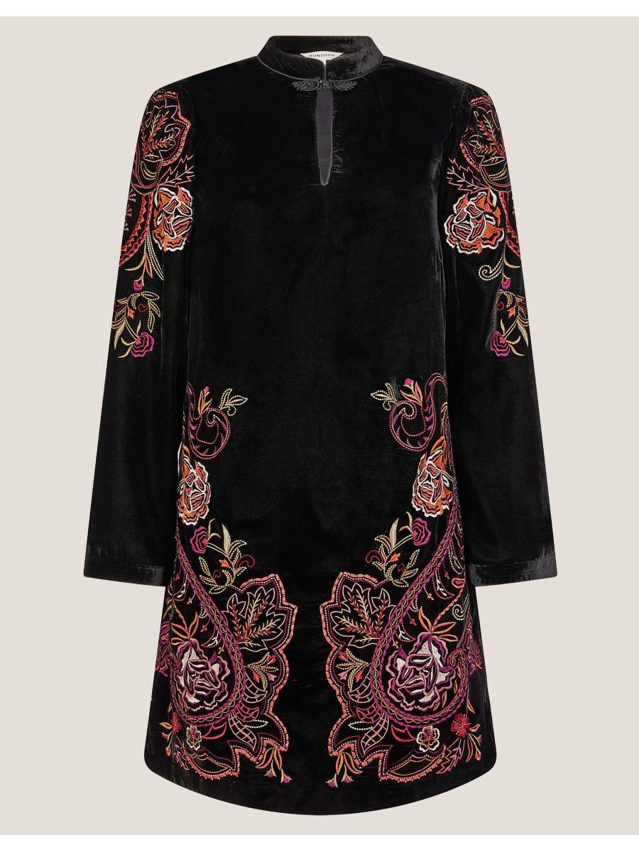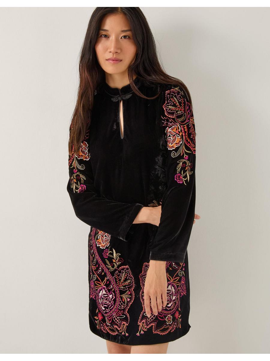 Your little black dress just got a colourful upgrade. Designed in smooth velvet, this tunic dress features decorative embroidery and a keyhole neckline that is sure to be the talk of the town. Cocktail, anyone? Black