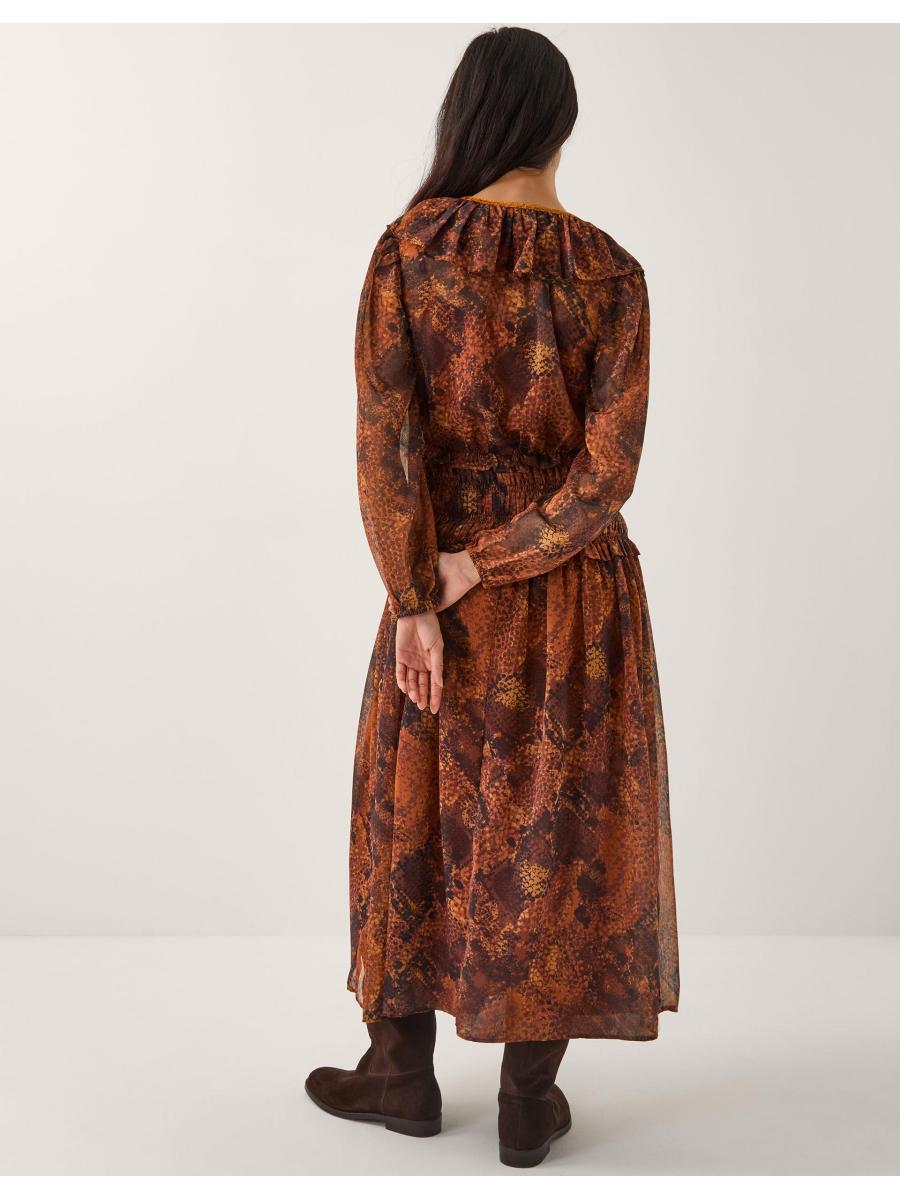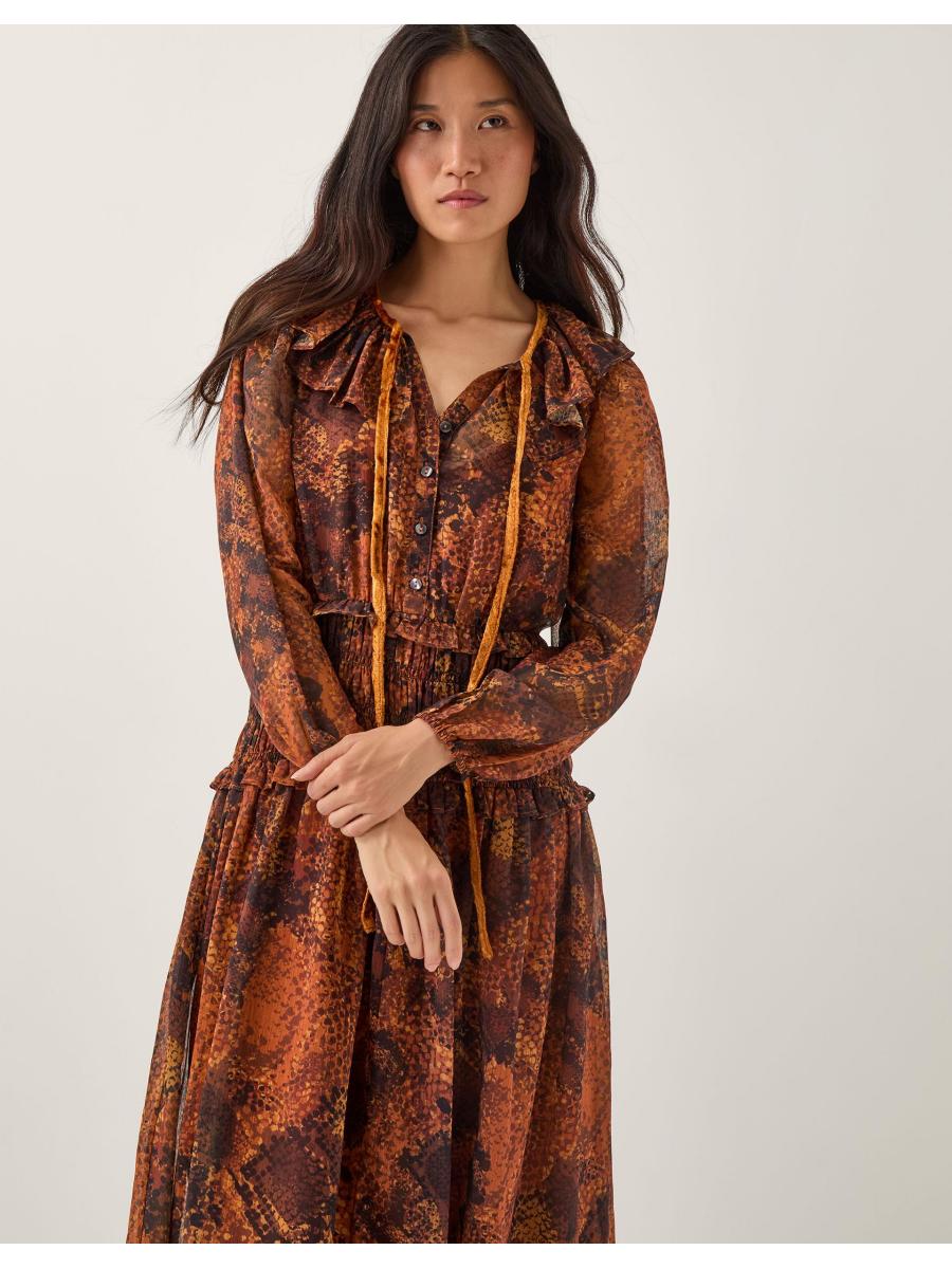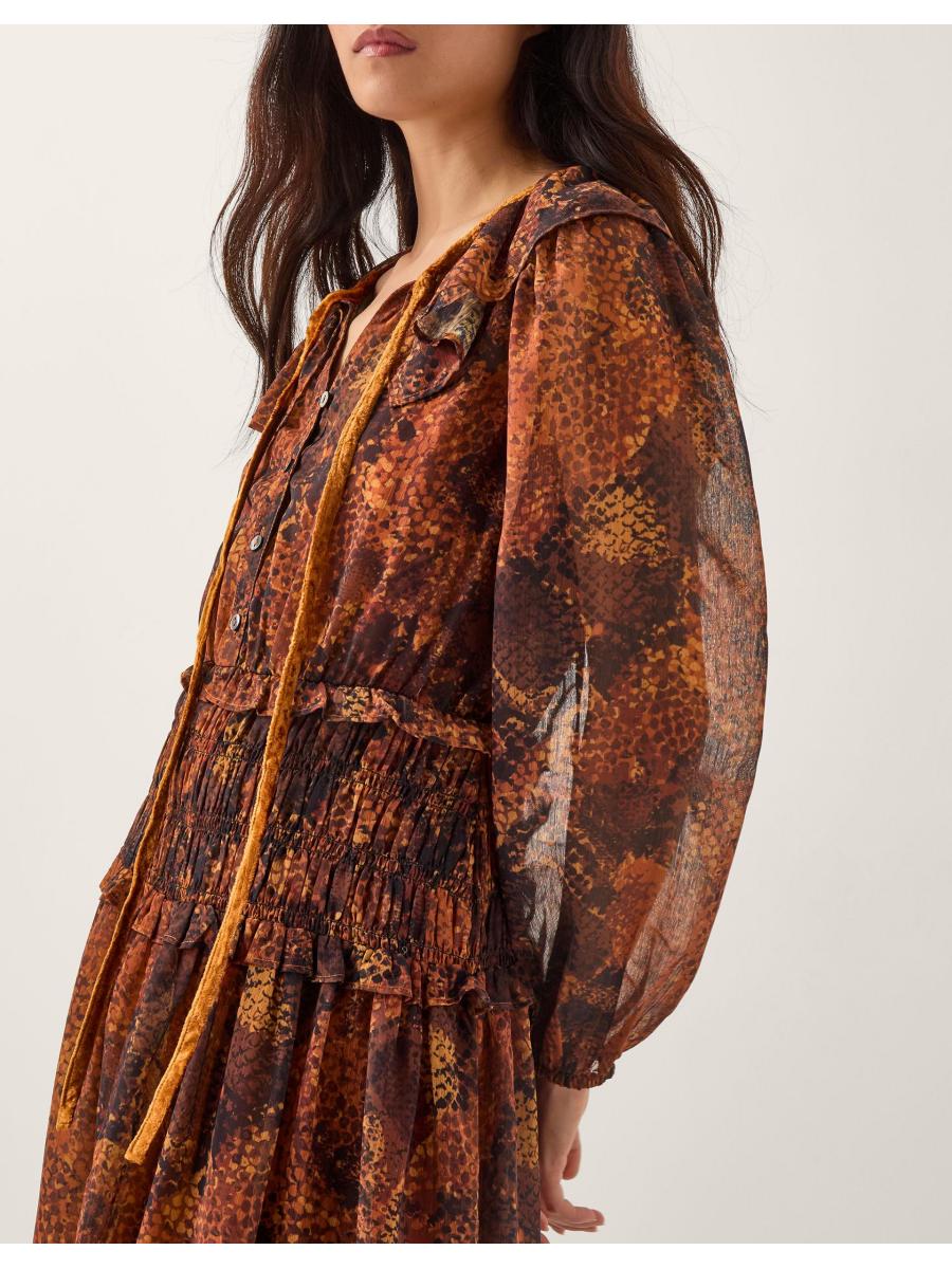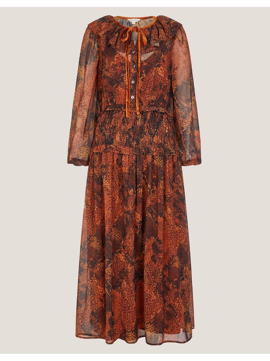 Snake a look at this. Dipped in autumnal colours, this lightweight, midi dress is perfect for day to night plans. Featuring a ruffled collar, standout velvet necktie and smocked waist, it is already slithering towards to your wardrobe. Jazz it up with gold accessories and a chunky belt! Yellow