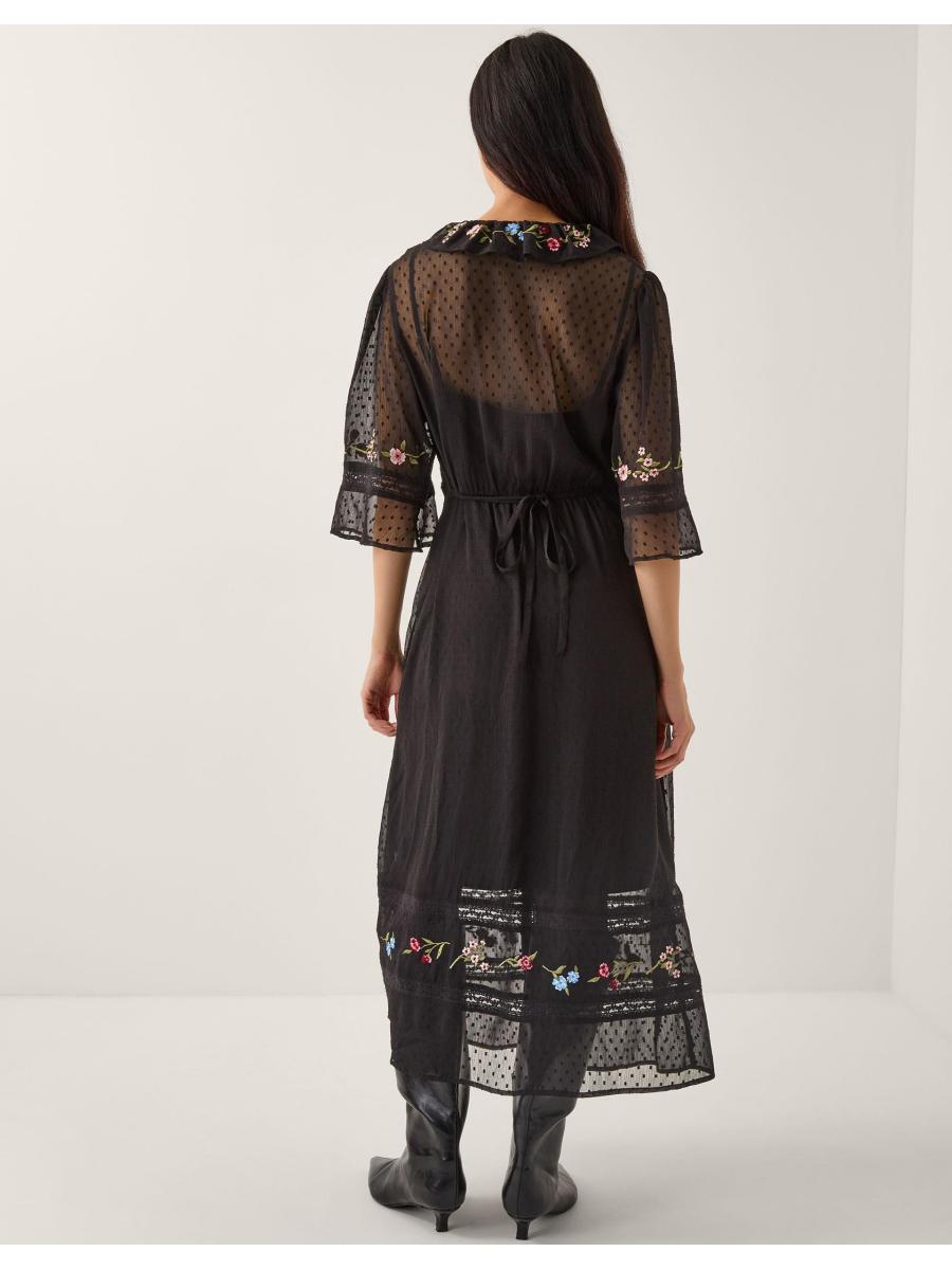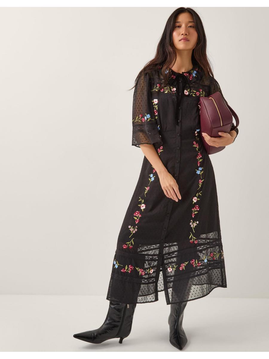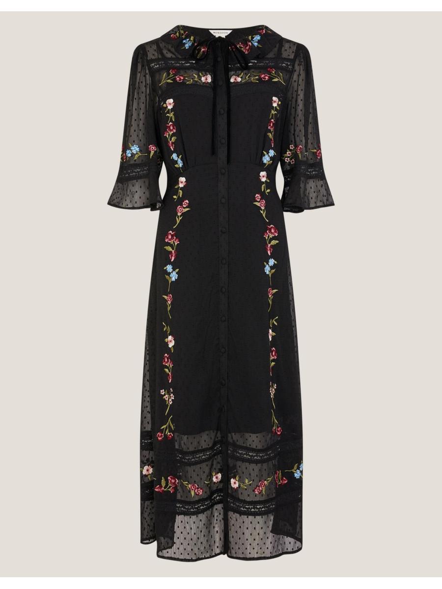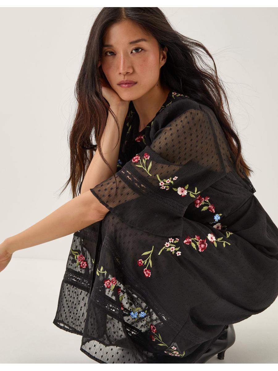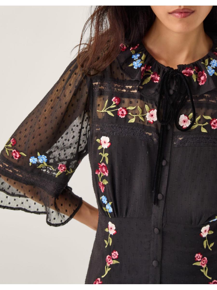 Tens across the board. Designed in ever-romantic lace, with a black slip insert, this midi dress is a dream piece. Featuring multi-coloured embroidered flowers, buttons all the way down and flowy ¾ sleeves, it's the perfect pick for an after-work date night. With a ruffled collar and velvet tie to finish. Black