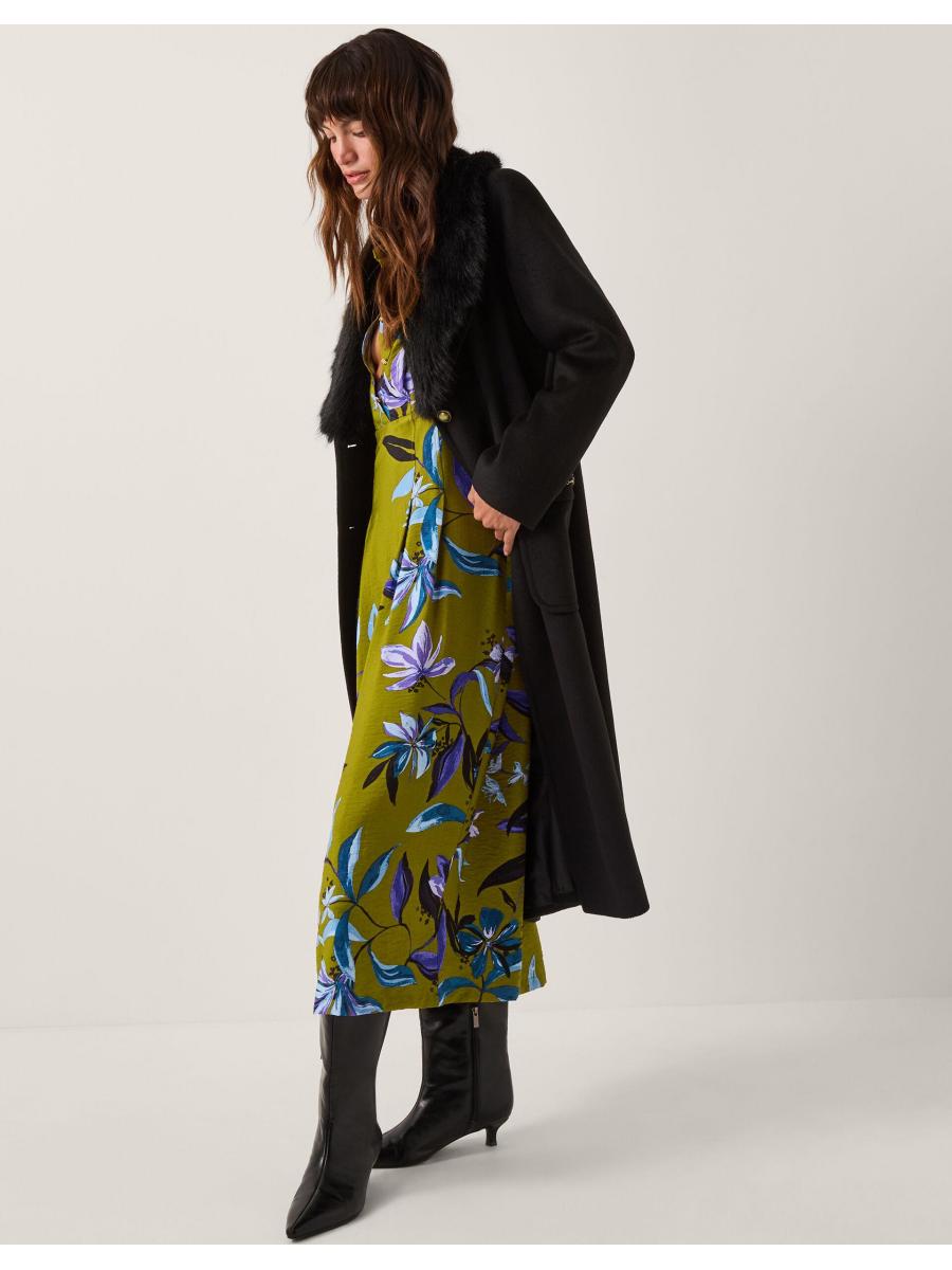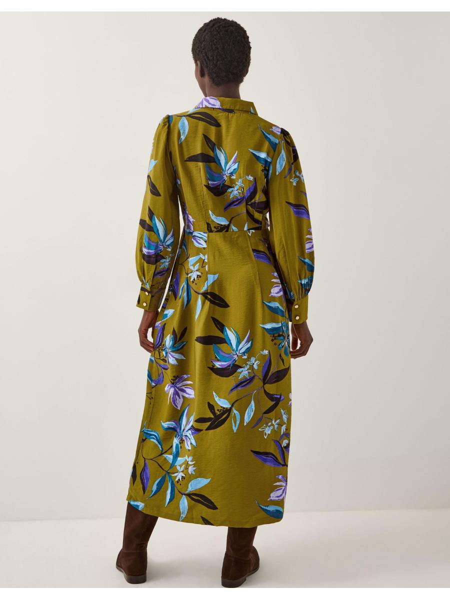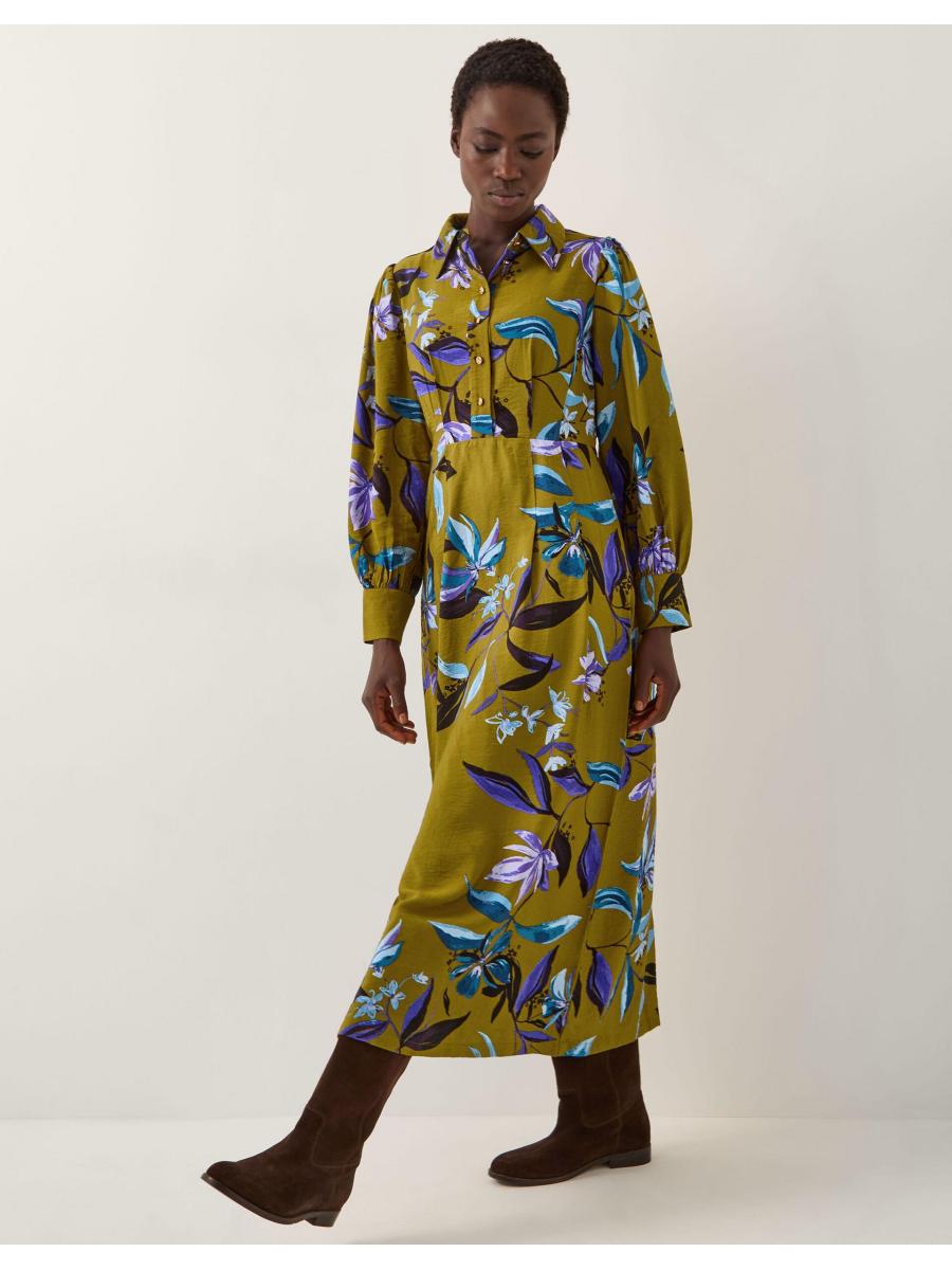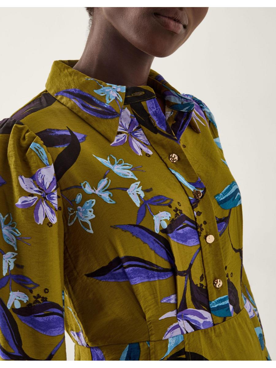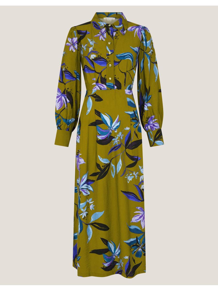 Florals for Autumn? Always. Doused in an olive green hue and printed with vibrant flowers, this midi dress is made to worn all season long. Designed with long sleeves, gold buttons and a band at the waist, it looks extra flattering with long boots and your fave winter coat. Green