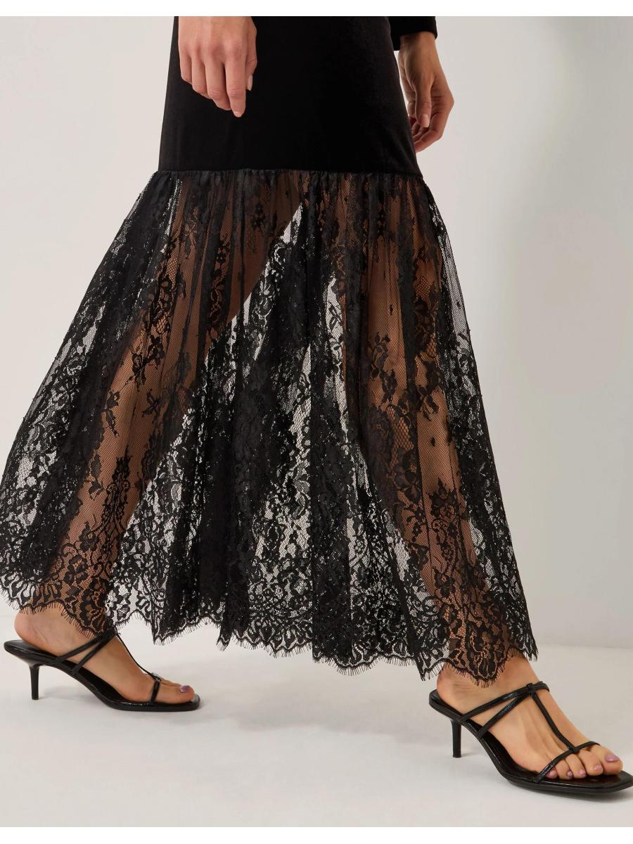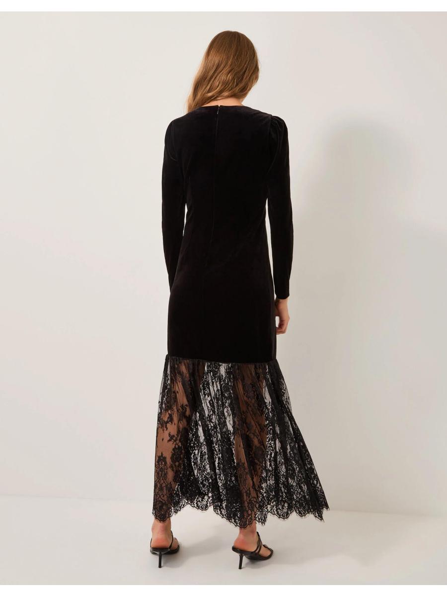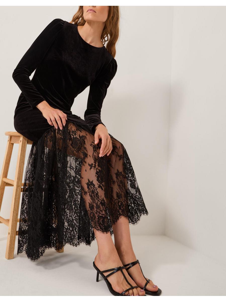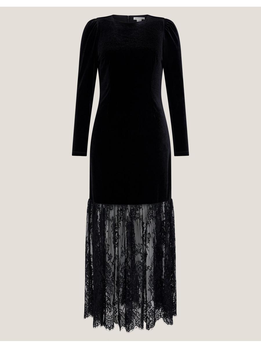 Let's meet at 8. Designed in luxuriously soft velvet and finished with a decorative lace hem, this dress *screams* black tie. A dazzling choice for any special occasion, all you need is strappy heels and a statement clutch. Black